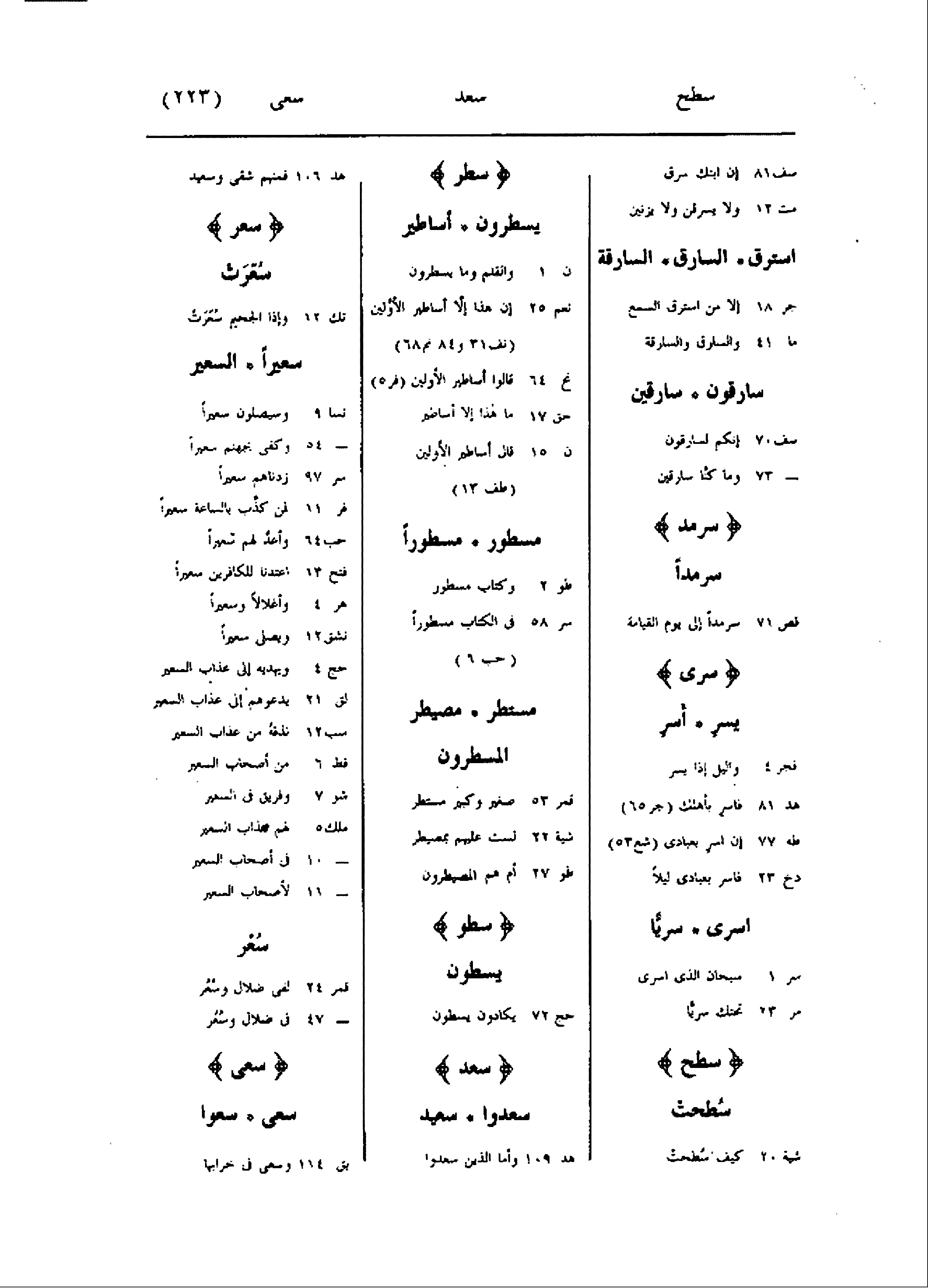 سف 81 إن ابنك سرق مت 12 ولا يسرقن ولا يزنين استرق السارق السارقة جر 18 إلا من استرق السمع ما 41 والسارق والسارقة سارقون سارقين سف 70 إنكم لسارقون- 73 وما كنّا سارقين سرمد سرمدا قص 71 سرمدا إلى يوم القيامة سرى يسر أسر فجر 4 واليل إذا يسر هد 81 فاسر بأهلك (جر 65) طه 77 إن اسر بعبادى (شع 53) دخ 23 فاسر بعبادى ليلا اسرى سريّا سر 1 سبحان الذى اسرى مر 23 تحتك سريّا سطح سطحت شية 20 كيف سطحت سطر يسطرون أساطير ن 1 والقلم وما يسطرون نعم 25 إن هذا إلّا أساطير الأوّلين (نف 31 و 84 نم 68) نح 64 قالوا أساطير الأولين (فر 5) حق 17 ما هذا إلا أساطير ن 15 قال أساطير الأولين (طف 13) مسطور مسطورا طو 2 وكتاب مسطور سر 58 فى الكتاب مسطورا (حب 6) مستطر مصيطر المسطرون قمر 53 صغير وكبير مستطر شية 22 لست عليهم بمصيطر طو 27 أم هم المصيطرون سطو يسطون حج 72 يكادون يسطون سعد سعدوا سعيد هد 109 وأما الذين سعدوا هد 106 فمنهم شقى وسعيد سعر سعّرت تك 12 وإذا الجحيم سعرت سعيرا السعير نسا 9 وسيصلون سعيرا- 54 وكفى بجهنم سعيرا سر 97 زدناهم سعيرا فر 11 لمن كذّب بالساعة سعيرا حب 64 وأعدّ لهم سعيرا فتح 13 اعتدنا للكافرين سعيرا هر 4 وأغلالا وسعيرا نشق 12 ويصلى سعيرا حج 4 ويهديه إلى عذاب السعير لق 21 يدعوهم إلى عذاب السعير سب 12 نذقه من عذاب السعير فط 6 من أصحاب السعير شو 7 وفريق فى السعير ملك 5 لهم عذاب السعير- 10 فى أصحاب السعير- 11 لأصحاب السعير سعر قمر 24 لفى ضلال وسعر- 47 فى ضلال وسعر سعى سعى سعوا بق 114 وسعى فى خرابها