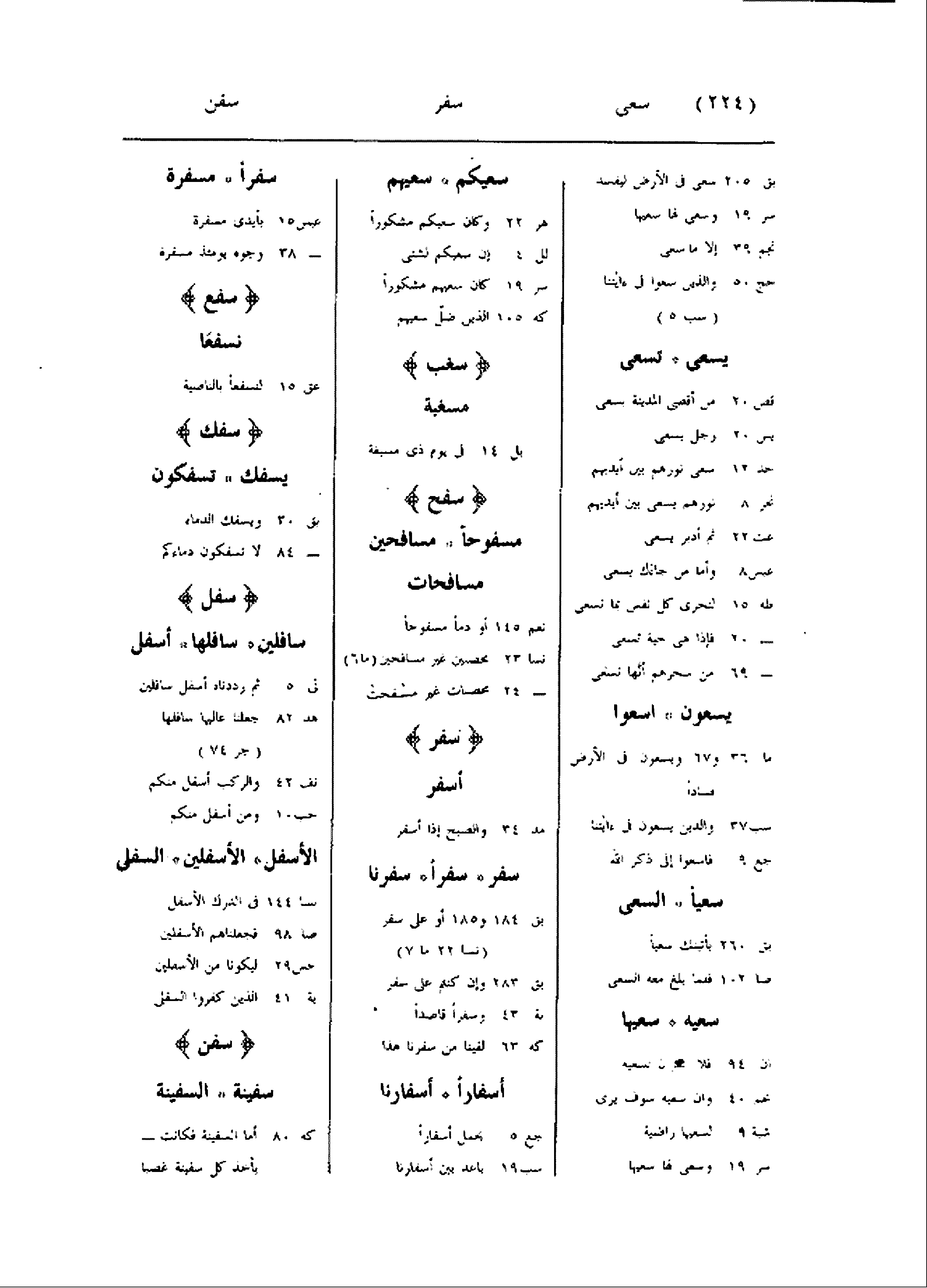 بق 260 يأتينك سعيا صا 102 فلما بلغ معه السعى سعيه سعيها ان 94 فلا كفران لسعيه نجم 40 وان سعيه سوف يرى شبة 9 لسعيها راضية سر 19 وسعى لها سعيها سعيكم سعيهم هر 22 وكان سعيكم مشكورا لل 4 إن سعيكم لشتى سر 19 كان سعيهم مشكورا كه 105 الذين ضلّ سعيهم سغب مسغبة بل 14 فى يوم ذى مسغبة سفح مسفوحا مسافحين مسافحات نعم 145 أو دما مسفوحا نسا 23 محصنين غير مسافحين (ما 6) - 24 محصنات غير مسافحات سفر أسفر مد 34 والصبح إذا أسفر سفر سفرا سفرنا بق 184 و 185 أو على سفر (نسا 22 ما 7) بق 283 وإن كنتم على سفر بة 43 وسفرا قاصدا كه 63 لقينا من سفرنا هذا أسفارا أسفارنا جع 5 يحمل أسفارا سب 19 باعد بين أسفارنا سفرا مسفرة عبس 15 بأيدى مسفرة- 38 وجوه يومئذ مسفرة سفع نسفعا عق 15 لنسفعا بالناصية سفك يسفك تسفكون بق 30 ويسفك الدماء- 84 لا تسفكون دماءكم سفل سافلين سافلها أسفل تى 5 ثم رددناه أسفل سافلين هد 82 جعلنا عاليها سافلها (جر 74) نف 42 والركب أسفل منكم حب 10 ومن أسفل منكم الأسفل الأسفلين السفلى نسا 144 فى الدرك الأسفل صا 98 فجعلناهم الأسفلين حس 29 ليكونا من الأسفلين بة 41 الذين كفروا السفلى سفن سفينة السفينة كه 80 أما السفينة فكانت- يأخذ كل سفينة غصبا