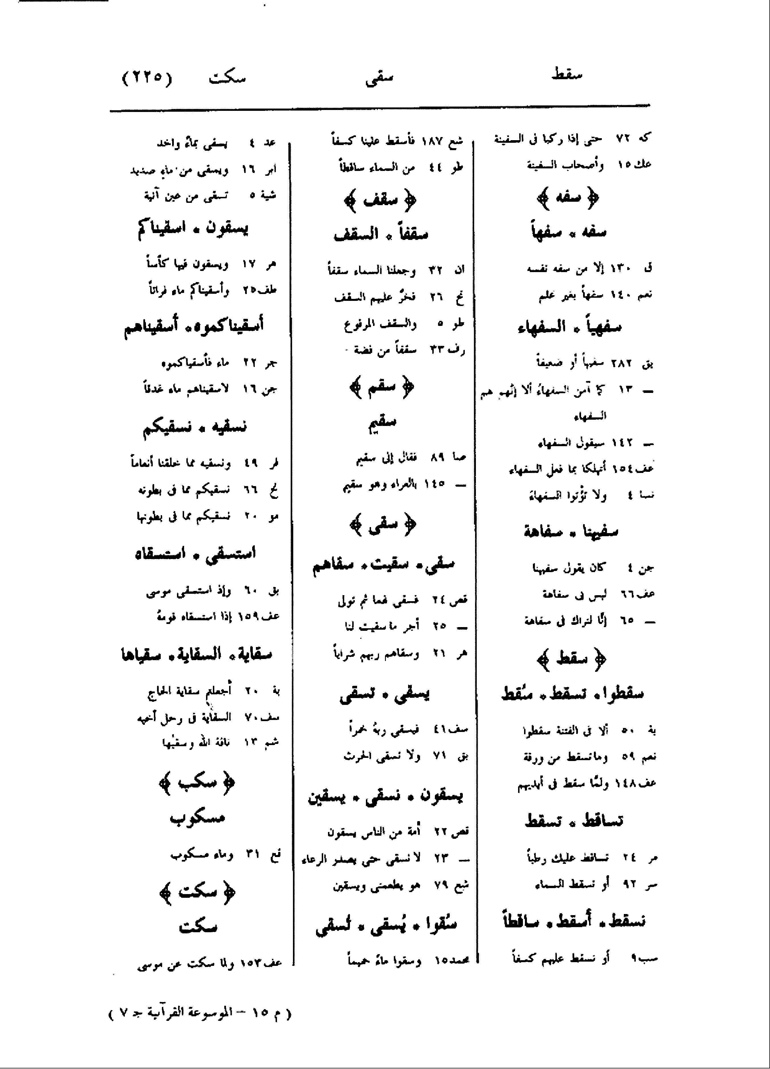 كه 72 حتى إذا ركبا فى السفينة عك 15 وأصحاب السفينة سفه سفه سفها ق 130 إلا من سفه نفسه نعم 140 سفها بغير علم سفيها السفهاء بق 282 سفيها أو ضعيفا- 13 كما آمن السفهاء ألا إنّهم هم السفهاء- 142 سيقول السفهاء عف 154 أتهلكا بما فعل السفهاء نسا 4 ولا تؤتوا السفهاء سفيهنا سفاهة جن 4 كان يقول سفيهنا عف 66 ليس بى سفاهة- 65 إنّا لنراك فى سفاهة سقط سقطوا تسقط سقط بة 50 ألا فى الفتنة سقطوا نعم 59 وما تسقط من ورقة عف 148 ولمّا سقط فى أيديهم تساقط تسقط مر 24 تساقط عليك رطبا سر 92 أو تسقط السماء نسقط أسقط ساقطا سب 9 أو نسقط عليهم كسفا شع 187 فأسقط علينا كسفا طو 44 من السماء ساقطا سقف سقفا السقف ان 32 وجعلنا السماء سقفا نح 26 فخرّ عليهم السقف طو 5 والسقف المرفوع رف 33 سقفا من فضة سقم سقيم صا 89 فقال إنى سقيم- 145 بالعراء وهو سقيم سقى سقى سقيت سقاهم قص 24 فسقى لهما ثم تولى- 25 أجر ما سقيت لنا هر 21 وسقاهم ربهم شرابا يسقى تسقى سف 41 فيسقى ربه خمرا بق 71 ولا تسقى الحرث يسقون نسقى يسقين قص 22 أمة من الناس يسقون- 23 لا نسقى حتى يصدر الرعاء شع 79 هو يطعمنى ويسقين سقوا يسقى تسقى محمد 15 وسقوا ماء حميما عد 4 يسقى بماء واحد ابر 16 ويسقى من ماء صديد شية 5 تسقى من عين آنية يسقون اسقيناكم هر 17 ويسقون فيها كأسا طف 25 وأسقيناكم ماء فراتا أسقيناكموه أسقيناهم جر 22 ماء فأسقياكموه جن 16 لاسقيناهم ماء غدقا نسقيه نسقيكم فر 49 ونسقيه مما خلقنا أنعاما نح 66 نسقيكم مما فى بطونه مو 20 نسقيكم مما فى بطونها استسقى استسقاه بق 60 وإذ استسقى موسى عف 159 إذا استسقاه قومه سقاية السقاية سقياها بة 20 أجعلتم سقاية الحاج سف 70 السقاية فى رحل أخيه شم 13 ناقة الله وسقيها سكب مسكوب قع 31 وماء مسكوب سكت سكت عف 153 ولما سكت عن موسى
