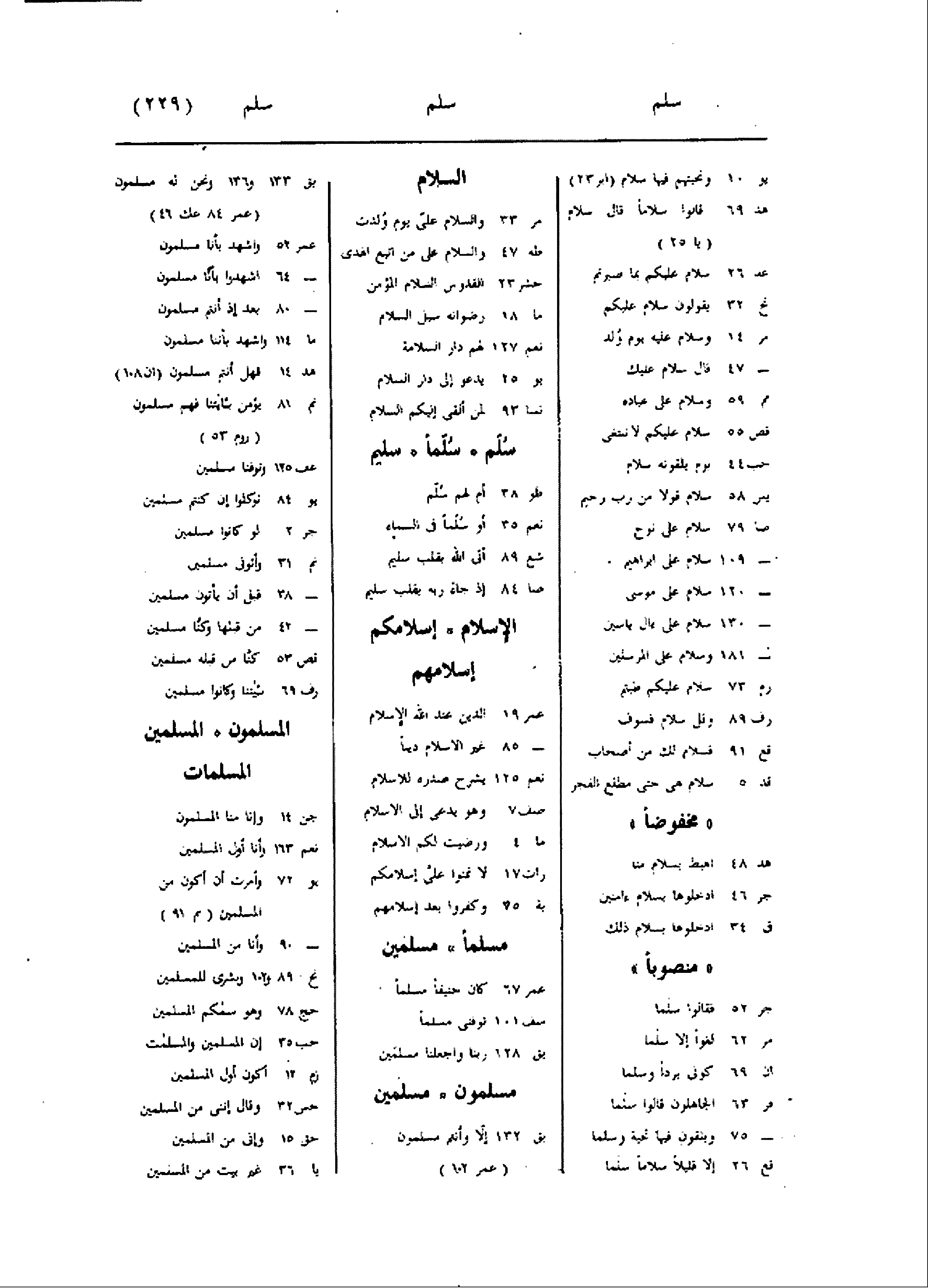 69 قالوا سلاما قال سلام (يا 25) عد 26 سلام عليكم بما صبرتم نح 32 يقولون سلام عليكم مر 14 وسلام عليه يوم ولد- 47 قال سلام عليك مم 59 وسلام على عباده قص 55 سلام عليكم لا نبتغى حب 44 يوم يلقونه سلام يس 58 سلام قولا من رب رحيم صا 79 سلام على نوح- 109 سلام على ابراهيم- 120 سلام على موسى- 130 سلام على ءال ياسين- 181 وسلام على المرسلين زم 73 سلام عليكم طبتم رف 89 وقل سلام فسوف قع 91 فسلام لك من أصحاب قد 5 سلام هى حتى مطلع الفجر «مخفوضا» هد 48 اهبط بسلام منا جر 46 ادخلوها بسلام ءامنين ق 34 ادخلوها بسلام ذلك «منصوبا» جر 52 فقالوا سلاما مر 62 لغوا إلا سلاما ان 69 كونى بردا وسلما فر 63 الجاهلون قالوا سلما- 75 ويلقون فيها تحية وسلما قع 26 إلا قليلا سلاما سلما السلام مر 33 والسلام علىّ يوم ولدت طه 47 والسلام على من اتبع الهدى حشر 23 القدوس السلام المؤمن ما 18 رضوانه سبل السلام نعم 127 لهم دار السلامة يو 25 يدعو إلى دار السلام نسا 93 لمن ألقى إليكم السلام سلّم سلّما سليم طو 38 أم لهم سلّم نعم 35 أو سلّما فى السماء شع 89 أتى الله بقلب سليم صا 84 إذ جاء ربه بقلب سليم الإسلام إسلامكم إسلامهم عمر 19 الدين عند الله الإسلام- 85 غير الإسلام دينا نعم 125 يشرح صدره للاسلام صف 7 وهو يدعى إلى الاسلام ما 4 ورضيت لكم الاسلام رات 17 لا تمنوا علىّ إسلامكم بة 75 وكفروا بعد إسلامهم مسلما مسلمين عمر 67 كان حنيفا مسلما سف 101 توفنى مسلما بق 128 ربنا واجعلنا مسلمين مسلمون مسلمين بق 132 إلّا وأنتم مسلمون (عمر 102) بق 133 و 136 ونحن له مسلمون (عمر 84 عك 46) عمر 52 واشهد بأنا مسلمون- 64 اشهدوا بأنّا مسلمون- 80 بعد إذ أنتم مسلمون ما 114 واشهد بأننا مسلمون هد 14 فهل أنتم مسلمون (ان 108) نم 81 يؤمن باياتنا فهم مسلمون (روم 53) عف 125 وتوفنا مسلمين يو 84 توكلوا إن كنتم مسلمين جر 2 لو كانوا مسلمين نم 31 وأتونى مسلمين- 38 قبل أن يأتون مسلمين- 42 من قبلها وكنّا مسلمين قص 53 كنّا من قبله مسلمين رف 69 بئيتنا وكانوا مسلمين المسلمون المسلمين المسلمات جن 14 وإنا منا المسلمون نعم 163 وأنا أول المسلمين يو 72 وأمرت أن أكون من المسلمين (نم 91) - 90 وأنا من المسلمين نح 89 و 102 وبشرى للمسلمين حج 78 وهو سمكم المسلمين حب 35 إن المسلمين والمسلمات زم 12 أكون أول المسلمين حس 32 وقال إننى من المسلمين حق 15 وإنى من المسلمين يا 36 غير بيت من المسلمين