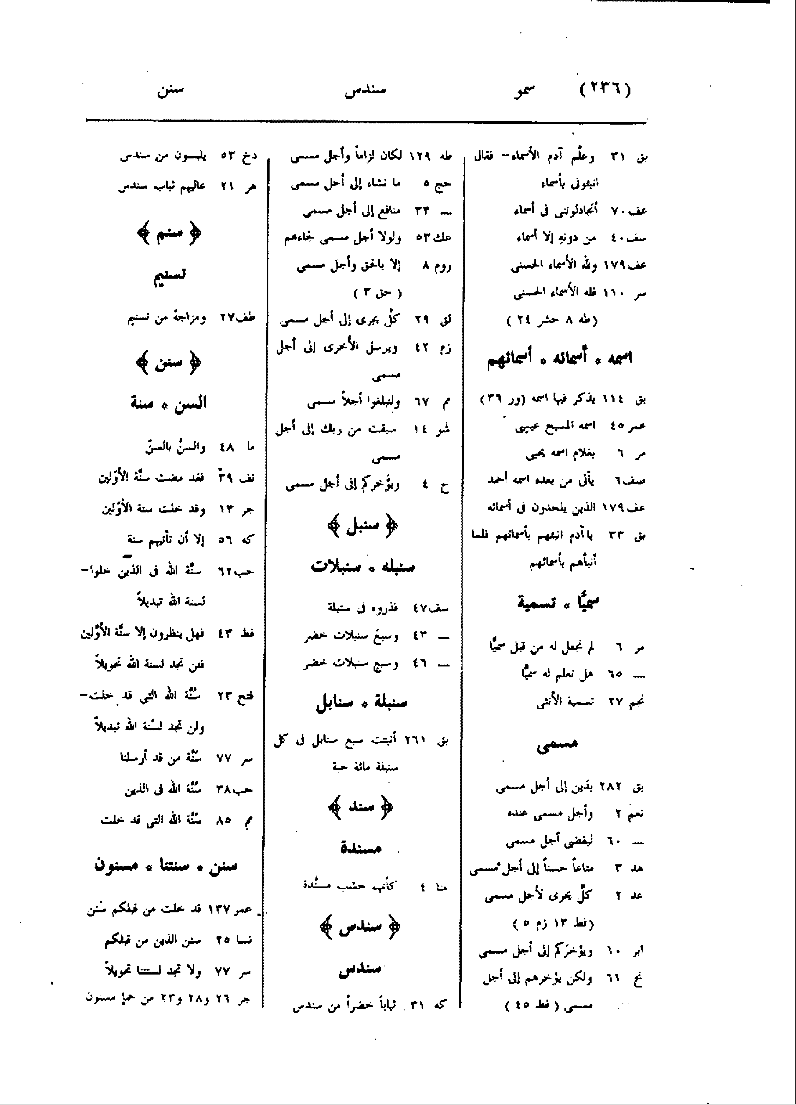 بق 31 وعلّم آدم الأسماء- فقال انبئونى بأسماء عف 70 أتجادلوننى فى أسماء سف 40 من دونه إلا أسماء عف 179 ولله الأسماء الحسنى سر 110 فله الأسماء الحسنى (طه 8 حشر 24) اسمه أسمائه أسمائهم بق 114 يذكر فيها اسمه (ور 36) عمر 45 اسمه المسيح عيسى مر 6 بغلام اسمه يحيى صف 6 يأتى من بعده اسمه أحمد عف 179 الذين يلحدون فى أسمائه بق 33 يا آدم انبئهم بأسمائهم فلما أنبأهم بأسمائهم سميّا تسمية مر 6 لم نجعل له من قبل سميّا- 65 هل تعلم له سميّا نجم 27 تسمية الأنثى مسمى بق 282 بدين إلى أجل مسمى نعم 2 وأجل مسمى عنده- 60 ليقضى أجل مسمى هد 3 متاعا حسنا إلى أجل مسمى عد 2 كلّ يجرى لأجل مسمى (فط 13 زم 5) ابر 10 ويؤخركم إلى أجل مسمى نح 61 ولكن يؤخرهم إلى أجل مسمى (فط 45) طه 129 لكان لزاما وأجل مسمى حج 5 ما نشاء إلى أجل مسمى- 33 منافع إلى أجل مسمى عك 53 ولولا أجل مسمى لجاءهم روم 8 إلا بالحق وأجل مسمى (حق 3) لق 29 كلّ يجرى إلى أجل مسمى زم 42 ويرسل الأخرى إلى أجل مسمى مم 67 ولتبلغوا أجلا مسمى شو 14 سبقت من ربك إلى أجل مسمى ح 4 ويؤخركم إلى أجل مسمى سنبل سنبله سنبلات سف 47 فذروه فى سنبلة- 43 وسبع سنبلات خضر- 46 وسبع سنبلات خضر سنبلة سنابل بق 261 أنبتت سبع سنابل فى كل سنبلة مائة حبة سند مسندة منا 4 كأنهم خشب مسنّدة سندس سندس كه 31 ثيابا خضرا من سندس دخ 53 يلبسون من سندس هر 21 عاليهم ثياب سندس سنم تسنيم طف 27 ومزاجه من تسنيم سنن السن سنة ما 48 والسنّ بالسنّ نف 39 فقد مضت سنّة الأوّلين جر 13 وقد خلت سنة الأوّلين كه 56 إلا أن تأتيهم سنة حب 62 سنّة الله فى الذين خلوا- لسنة الله تبديلا فط 43 فهل ينظرون