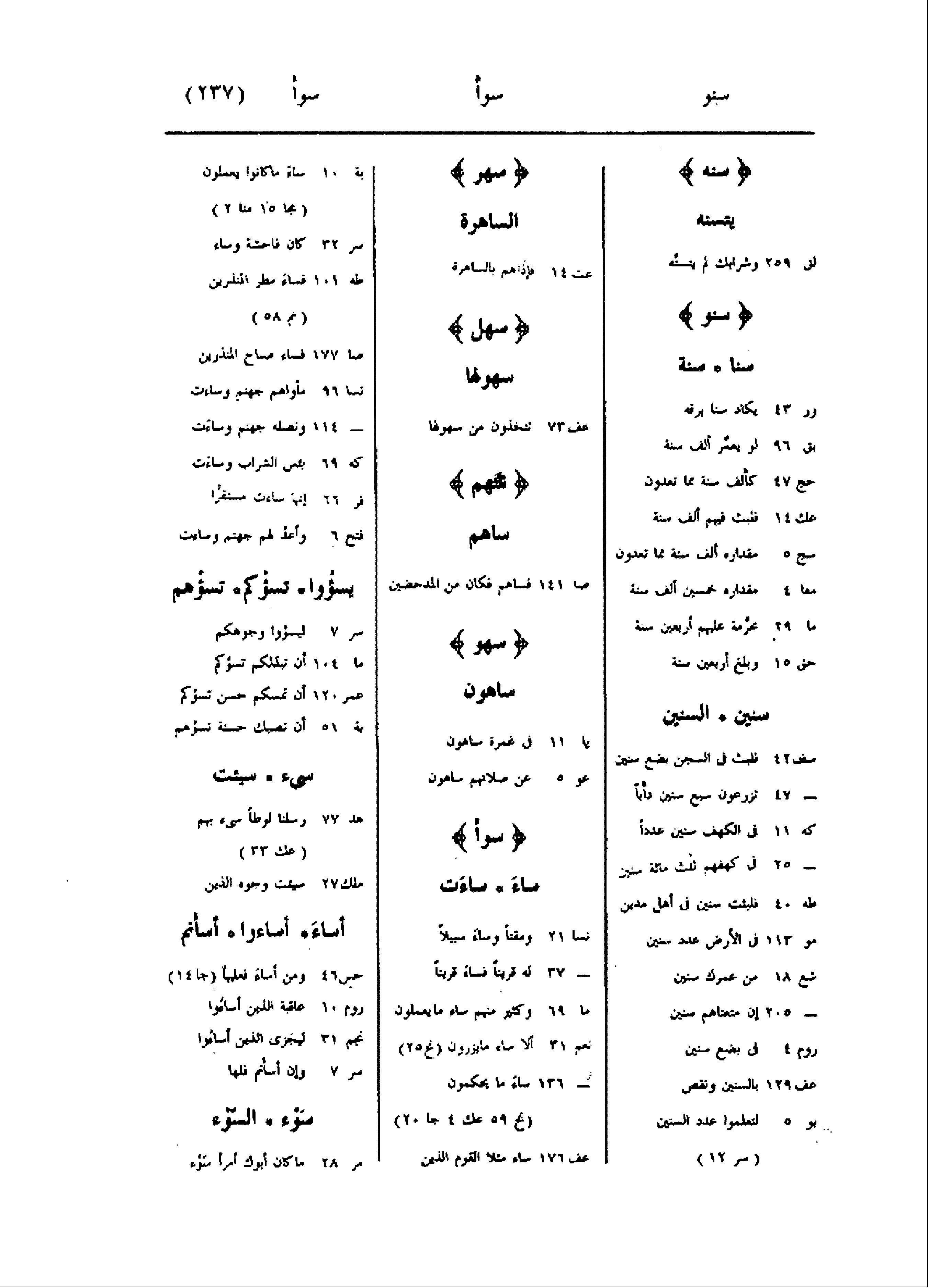 سنه يتسنه لق 259 وشرابك لم يتسنّه سنو سنا سنة ور 43 يكاد سنا برقه بق 96 لو يعمّر ألف سنة حج 47 كألف سنة مما تعدون عك 14 فلبث فيهم ألف سنة سج 5 مقداره ألف سنة مما تعدون معا 4 مقداره خمسين ألف سنة ما 29 محرّمة عليهم أربعين سنة حق 15 وبلغ أربعين سنة سنين السنين سف 42 فلبث فى السجن بضع سنين- 47 تزرعون سبع سنين دأبا كه 11 فى الكهف سنين عددا- 25 فى كهفهم ثلث مائة سنين طه 40 فلبثت سنين فى أهل مدين مو 113 فى الأرض عدد سنين شع 18 من عمرك سنين- 205 إن متعناهم سنين روم 4 فى بضع سنين عف 129 بالسنين ونقص يو 5 لتعلموا عدد السنين (سر 12) سهر الساهرة عت 14 فإذا هم بالساهرة سهل سهولها عف 73 تتخذون من سهولها سهم ساهم صا 141 فساهم فكان من المدحضين سهو ساهون يا 11 فى غمرة ساهون عو 5 عن صلاتهم ساهون سوأ ساء ساءت نسا 21 ومقتا وساء سبيلا- 37 له قرينا فساء قرينا ما 69 وكثير منهم ساء ما يعملون نعم 31 ألا ساء ما يزرون (نح 25) - 136 ساء ما يحكمون (نح 59 عك 4 جا 20) عف 176 ساء مثلا القوم الذين بة 10 ساء ما كانوا يعملون (مجا 15 منا 2) سر 32 كان فاحشة وساء طه 101 فساء مطر المنذرين (نم 58) صا 177 فساء صباح المنذرين نسا 96 مأواهم جهنم وساءت- 114 ونصله جهنم وساءت كه 69 بئس الشراب وساءت فر 66 إنها ساءت مستقرّا فتح 6 وأعدّ لهم جهنم وساءت يسؤوا تسؤكم تسؤهم سر 7 ليسؤوا وجوهكم ما 104 أن تبدلكم تسؤكم عمر 120 أن تمسكم حسن تسؤكم بة 51 أن تصبك حسنة تسؤهم سىء سيئت هد 77 رسلنا لوطا سىء بهم (عك 33) ملك 27 سيئت وجوه الذين أساء أساءوا أسأتم حس 46 ومن أساء فعليها (جا 14) روم 10 عاقبة الذين أساءوا نجم 31 ليجزى الذين أساءوا سر 7 وإن أسأتم فلها سوء السّوء مر 28 ما كان أبوك أمرا سوء