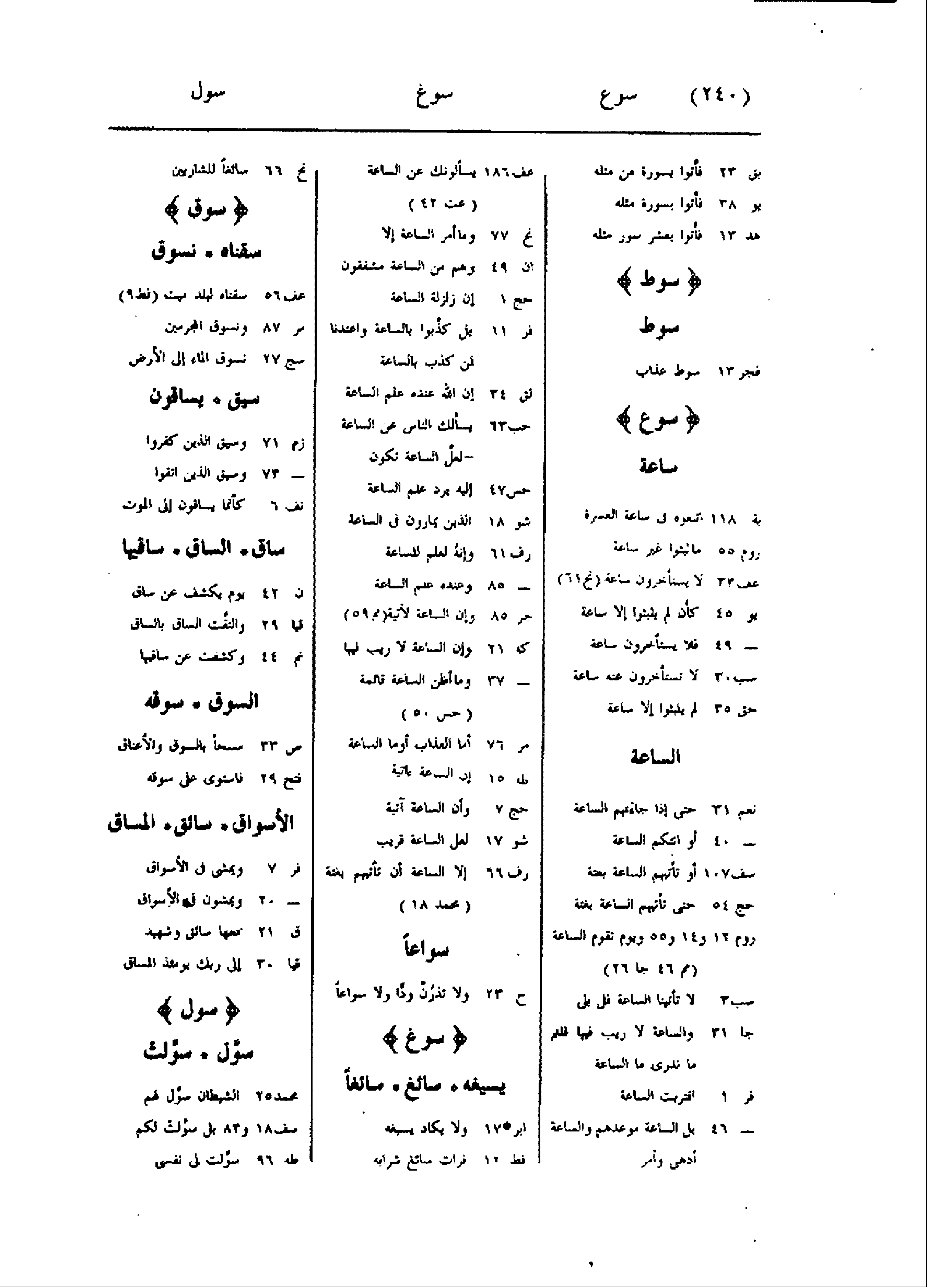 بق 23 فأتوا بسورة من مثله يو 38 فأتوا بسورة مثله هد 13 فأتوا بعشر سور مثله سوط سوط فجر 13 سوط عذاب سوع ساعة بة 118 اتبعوه فى ساعة العسرة روم 55 ما لبثوا غير ساعة عف 33 لا يستأخرون ساعة (نح 61) يو 45 كأن لم يلبثوا إلا ساعة- 49 فلا يستأخرون ساعة سب 30 لا تستأخرون عنه ساعة حق 35 لم يلبثوا إلا ساعة الساعة نعم 31 حتى إذا جاءتهم الساعة- 40 أو اتتكم الساعة سف 107 أو تأتيهم الساعة بغتة حج 54 حتى تأتيهم الساعة بغتة روم 12 و 14 و 55 ويوم تقوم الساعة (مم 46 جا 26) سب 3 لا تأتينا الساعة قل بلى جا 31 والساعة لا ريب فيها قلتم ما ندرى ما الساعة فر 1 اقتربت الساعة- 46 بل الساعة موعدهم والساعة أدهى وأمر عف 186 يسألونك عن الساعة (عت 42) نح 77 وما أمر الساعة إلا ان 49 وهم من الساعة مشفقون حج 1 إن زلزلة الساعة فر 11 بل كذّبوا بالساعة واعتدنا لمن كذب بالساعة لق 34 إن الله عنده علم الساعة حب 63 يسألك الناس عن الساعة- لعلّ الساعة تكون حس 47 إليه يرد علم الساعة شو 18 الذين يمارون فى الساعة رف 61 وإنه لعلم للساعة- 85 وعنده علم الساعة جر 85 وإن الساعة لأتية (مم 59) كه 21 وإن الساعة لا ريب فيها- 37 وما أظن الساعة قائمة (حس 50) مر 76 أما العذاب أو ما الساعة طه 15 إن الساعة ءاتية حج 7 وأن الساعة آتية شو 17 لعل الساعة قريب رف 66 إلا الساعة أن تأتيهم بغتة (محمد 18) سواعا ح 23 ولا تذرن ودّا ولا سواعا سوغ يسيغه سائغ سائغا ابر 17 ولا يكاد يسيغه فط 12 فرات سائغ شرابه نح 66 سائغا للشاربين سوق سقناه نسوق عف 56 سقناه لبلد ميت (فط 9) مر 87 ونسوق المجرمين سج 27 نسوق الماء إلى الأرض سيق يساقون زم 71 وسيق الذين كفروا- 73 وسيق الذين اتقوا نف 6 كأنما يساقون إلى الموت ساق الساق ساقيها ن 42 يوم يكشف عن ساق قيا 29 والتفّت الساق بالساق نم 44 وكشفت عن ساقيها السوق سوقه ص 33 مسحا بالسوق والأعناق فتح 29 فاستوى على سوقه الأسواق سائق المساق فر 7 ويمشى فى الأسواق- 20 ويمشون فى الأسواق ق 21 معها سائق وشهيد قيا 30 إلى ربك يومئذ المساق سول سوّل سوّلت محمد 25 الشيطان سوّل لهم سف 18 و 83 بل سوّلت لكم طه 96 سوّلت لى نفسى