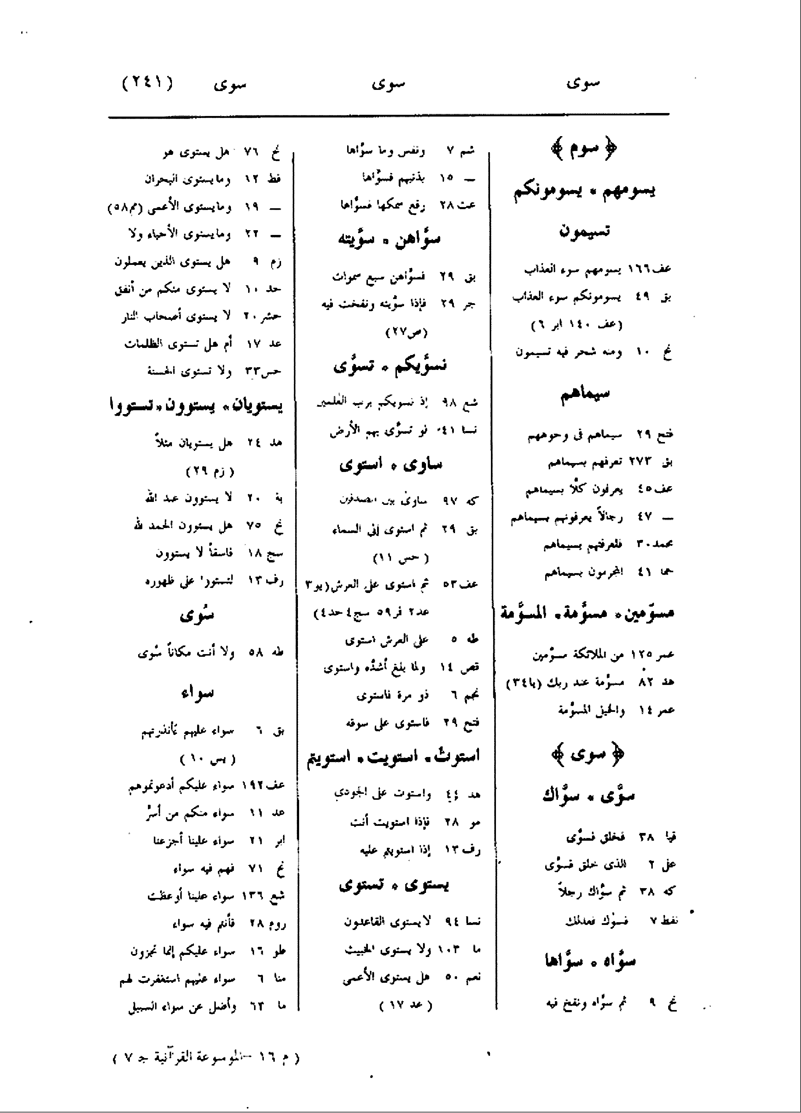 المسوّمة عمر 125 من الملائكة مسوّمين هد 82 مسوّمة عند ربك (يا 34) عمر 14 والخيل المسوّمة سوى سوّى سوّاك قيا 38 فخلق فسوّى عل 2 الذى خلق فسوّى كه 38 ثم سوّاك رجلا نفط 7 فسوك فعدلك سوّاه سوّاها نح 9 ثمّ سوّاه ونفخ فيه شم 7 ونفس وما سوّاها- 15 بذنبهم فسوّاها عت 28 رفع سمكها فسوّاها سوّاهن سوّيته بق 29 فسوّاهن سبع سموات جر 29 فإذا سوّيته ونفخت فيه (ص 27) نسوّيكم تسوّى شع 98 إذ نسويكم برب العالمين نسا 41 لو تسوّى بهم الأرض ساوى استوى كه 97 ساوى بين الصدفين بق 29 ثم استوى إلى السماء (حس 11) عف 53 ثم استوى على العرش (يو 3 عد 2 فر 59 سج 4 حد 4) طه 5 على العرش استوى قص 14 ولما بلغ أشدّه واستوى نجم 6 ذو مرة فاستوى فتح 29 فاستوى على سوقه استوت استويت استويتم هد 44 واستوت على الجودى مو 28 فإذا استويت أنت رف 13 إذا استويتم عليه يستوى تستوى نسا 94 لا يستوى القاعدون ما 103 ولا يستوى الخبيث نعم 50 هل يستوى الأعمى (عد 17) نح 76 هل يستوى هو فط 12 وما يستوى البحران- 19 وما يستوى الأعمى (مم 58) - 22 وما يستوى الأحياء ولا زم 9 هل يستوى الذين يعملون حد 10 لا يستوى منكم من أنفق حشر 20 لا يستوى أصحاب النار عد 17 أم هل تستوى الظلمات حس 33 ولا تستوى الحسنة يستويان يستوون تستووا هد 24 هل يستويان مثلا (زم 29) بة 20 لا يستوون عند الله نح 75 هل يستوون الحمد لله سج 18 فاسقا لا يستوون رف 13 لتستووا على ظهوره سوى طه 58 ولا أنت مكانا سوى سواء بق 6 سواء عليهم ءأنذرتهم (يس 10) عف 192 سواء عليكم أدعوتموهم عد 11 سواء منكم من أسرّ ابر 21 سواء علينا أجزعنا نح 71 فهم فيه سواء شع 136 سواء علينا أوعظت روم 28 فأنتم فيه سواء طو 16 سواء عليكم إنما تجزون منا 6 سواء عليهم استغفرت لهم ما 63 وأضل عن سواء السبيل