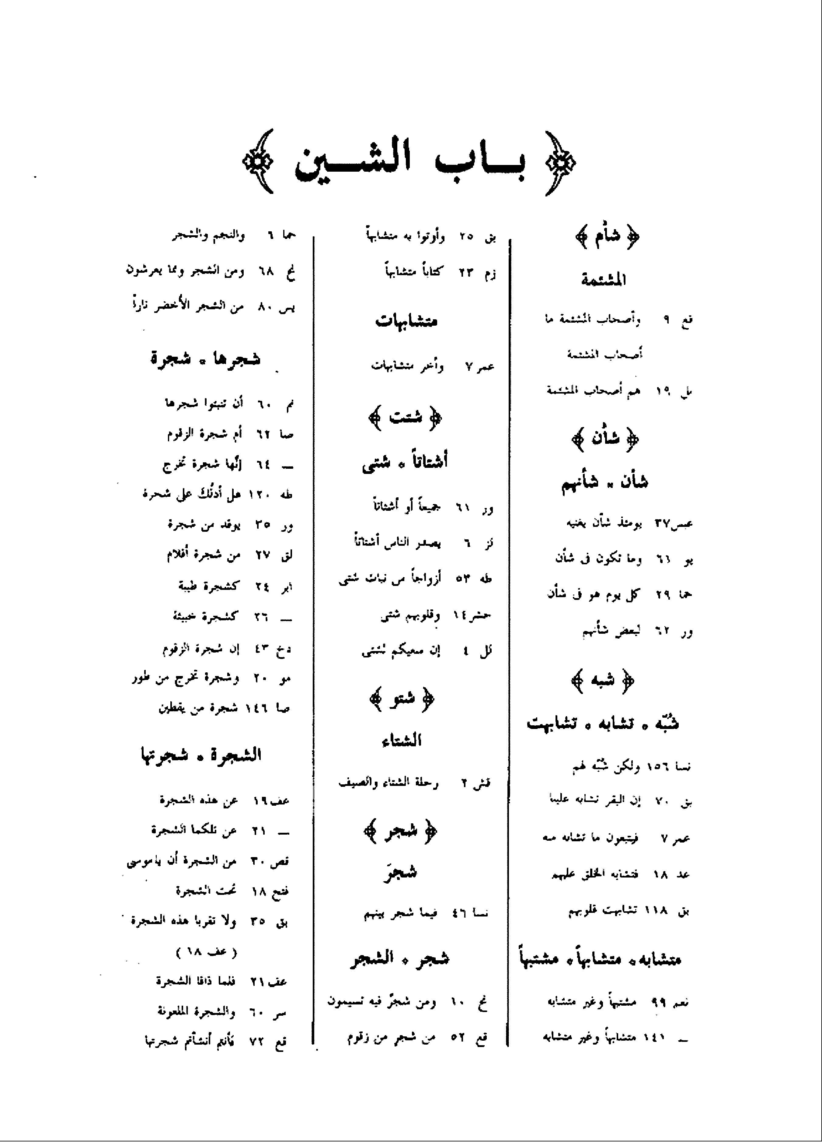 شأم المشئمة قع 9 وأصحاب المشئمة ما أصحاب المشئمة بل 19 هم أصحاب المشئمة شأن شأن شأنهم عبس 37 يومئذ شأن يغنيه يو 61 وما تكون فى شأن حما 29 كل يوم هو فى شأن ور 62 لبعض شأنهم شبه شبّه تشابه تشابهت نسا 156 ولكن شبّه لهم بق 70 إن البقر تشابه علينا عمر 7 فيتبعون ما تشابه منه عد 18 فتشابه الخلق عليهم بق 118 تشابهت قلوبهم متشابه متشابها مشتبها نعم 99 مشتبها وغير متشابه- 141 متشابها وغير متشابه بق 25 وأوتوا به متشابها زم 23 كتابا متشابها متشابهات عمر 7 وأخر متشابهات شتت أشتاتا شتى ور 61 جميعا أو أشتاتا لز 6 يصدر الناس أشتاتا طه 53 أزواجا من نبات شتى حشر 14 وقلوبهم شتى لل 4 إن سعيكم لشتى شتو الشتاء قش 2 رحلة الشتاء والصيف شجر شجر نسا 46 فيما شجر بينهم شجر الشجر نح 10 ومن شجر فيه تسيمون قع 52 من شجر من زقوم حما 6 والنجم والشجر نح 68 ومن الشجر ومما يعرشون يس 80 من الشجر الأخضر نارا شجرها شجرة نم 60 أن تنبتوا شجرها صا 62 أم شجرة الزقوم- 64 إنّها شجرة تخرج طه 120 هل أدلك على شجرة ور 35 يوقد من شجرة لق 27 من شجرة أقلام ابر 24 كشجرة طيبة- 26 كشجرة خبيثة دخ 43 إن شجرة الزقوم مو 20 وشجرة تخرج من طور صا 146 شجرة من يقطين الشجرة شجرتها عف 19 عن هذه الشجرة- 21 عن تلكما الشجرة قص 30 من الشجرة أن يا موسى فتح 18 تحت الشجرة بق 35 ولا تقربا هذه الشجرة (عف 18) عف 21 فلما ذاقا الشجرة سر 60 والشجرة الملعونة قع 72 ءأنتم أنشأتم شجرتها