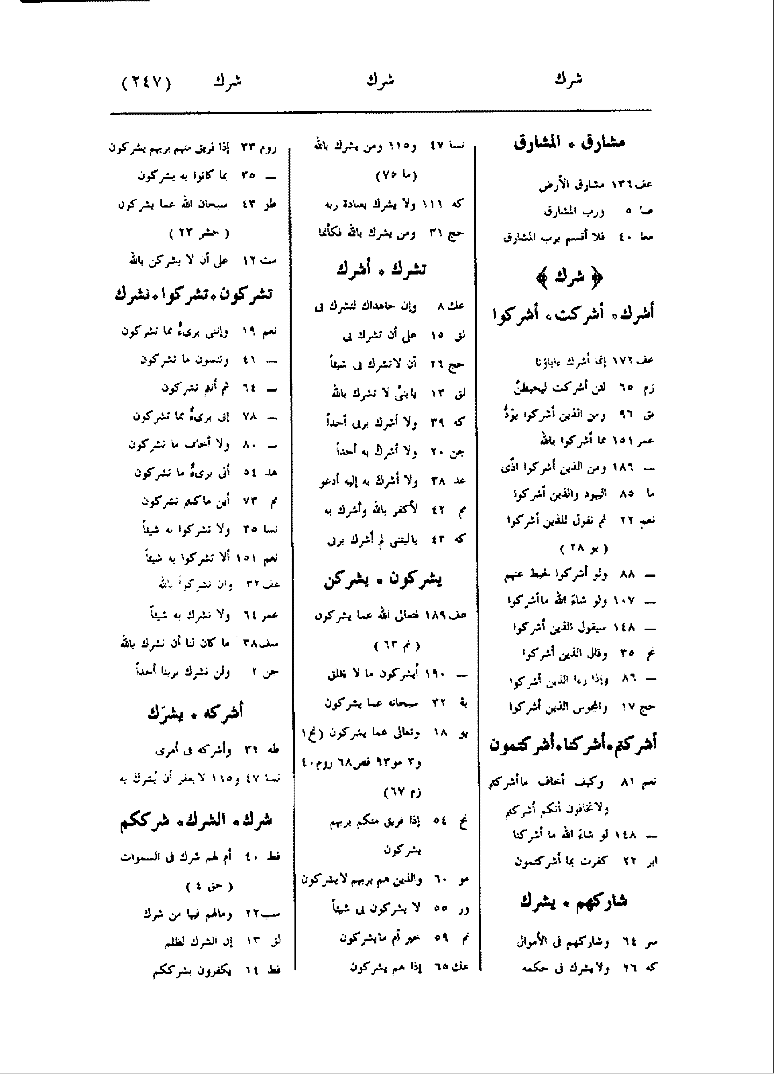 مشارق المشارق عف 136 مشارق الأرض صا 5 ورب المشارق معا 40 فلا أقسم برب المشارق شرك أشرك أشركت أشركوا عف 172 إنما أشرك ءاباؤنا زم 65 لئن أشركت ليحبطنّ بق 96 ومن الذين أشركوا يودّ عمر 151 بما أشركوا بالله- 186 ومن الذين أشركوا اذى ما 85 اليهود والذين أشركوا نعم 22 ثم نقول للذين أشركوا (يو 28) - 88 ولو أشركوا لحبط عنهم- 107 ولو شاء الله ما أشركوا- 148 سيقول الذين أشركوا نح 35 وقال الذين أشركوا- 86 وإذا رءا الذين أشركوا حج 17 والمجوس الذين أشركوا أشركتم أشركنا أشركتمون نعم 81 وكيف أخاف ما أشركتم ولا تخافون أنكم أشركتم- 148 لو شاء الله ما أشركنا ابر 22 كفرت بما أشركتمون شاركهم يشرك سر 64 وشاركهم فى الأموال كه 26 ولا يشرك فى حكمه نسا 47 و 115 ومن يشرك بالله (ما 75) كه 111 ولا يشرك بعبادة ربه حج 31 ومن يشرك بالله فكأنما تشرك أشرك عك 8 وإن جاهداك لتشرك بى لق 15 على أن تشرك بى حج 26 أن لا تشرك بى شيئا لق 13 يا بنىّ لا تشرك بالله كه 39 ولا أشرك بربى أحدا جن 20 ولا أشرك به أحدا عد 38 ولا أشرك به إليه أدعو مم 42 لأكفر بالله وأشرك به كه 43 يا ليتنى لم أشرك بربى يشركون يشركن عف 189 فتعالى الله عما يشركون (نم 63) - 190 أيشركون ما لا يخلق بة 32 سبحانه عما يشركون يو 18 وتعالى عما يشركون (نح 1 و 3 مو 93 قص 68 روم 40 زم
