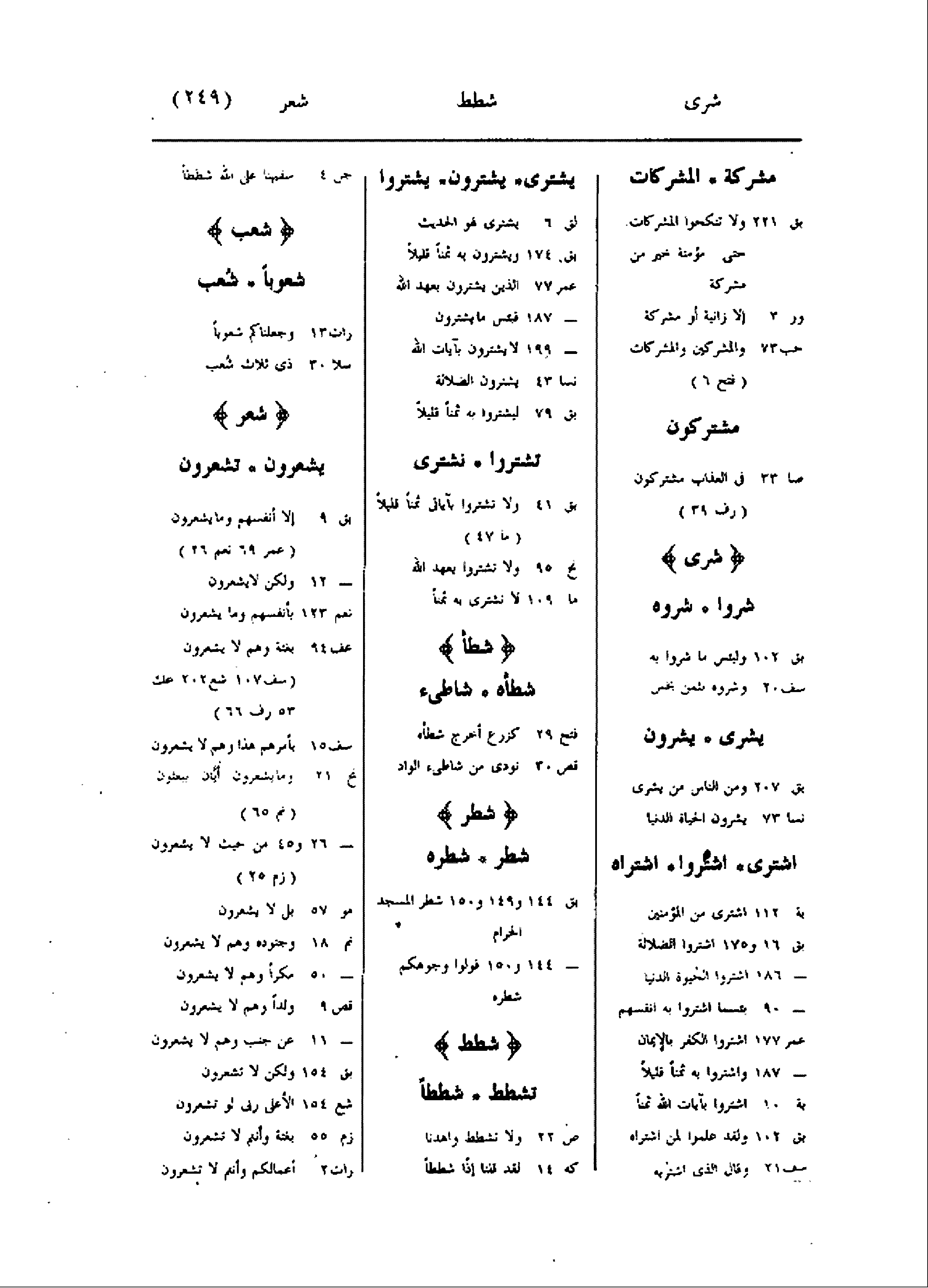 مشركة المشركات بق 221 ولا تنكحوا المشركات حتى- مؤمنة خير من مشركة ور 3 إلا زانية أو مشركة حب 73 والمشركين والمشركات (فتح 6) مشتركون صا 33 فى العذاب مشتركون (رف 39) شرى شروا شروه بق 102 ولبئس ما شروا به سف 20 وشروه بثمن بخس يشرى يشرون بق 207 ومن الناس من يشرى نسا 73 يشرون الحياة الدنيا اشترى اشتروا اشتراه بة 112 اشترى من المؤمنين بق 16 و 175 اشتروا الضلالة- 186 اشتروا الحيوة الدنيا- 90 بئسما اشتروا به انفسهم عمر 177 اشتروا الكفر بالإيمان- 187 واشتروا به ثمنا قليلا بة 10 اشتروا بآيات الله ثمنا بق 102 ولقد علموا لمن اشتراه سف 21 وقال الذى اشتريه يشترى يشترون يشتروا لق 6 يشترى لهو الحديث بق 174 ويشترون به ثمنا قليلا عمر 77 الذين يشترون بعهد الله- 187 فبئس ما يشترون- 199 لا يشترون بآيات الله نسا 43 يشترون الضلالة بق 79 ليشتروا به ثمنا قليلا تشتروا نشترى بق 41 ولا تشتروا بآياتى ثمنا قليلا (ما 47) نح 95 ولا تشتروا بعهد الله ما 109 لا نشترى به ثمنا شطأ شطأه شاطىء فتح 29 كزرع أخرج شطأه قص 30 نودى من شاطىء الواد شطر شطر شطره بق 144 و 149 و 150 شطر المسجد الحرام- 144 و 150 فولوا وجوهكم شطره شطط تشطط شططا ص 22 ولا تشطط