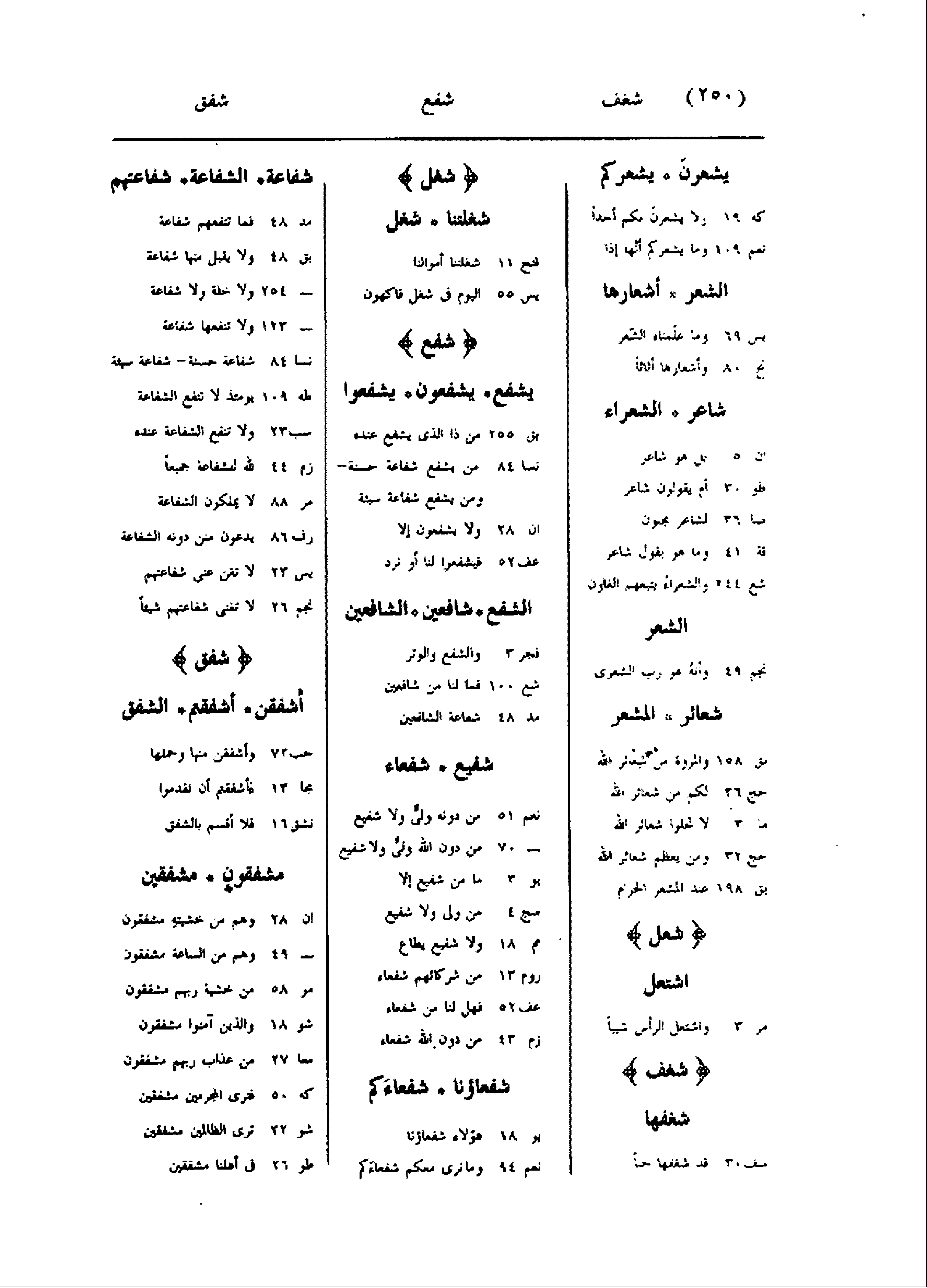 يشعرنّ يشعركم كه 19 ولا يشعرنّ بكم أحدا نعم 109 وما يشعركم أنّها إذا الشعر أشعارها يس 69 وما علّمناه الشّعر نح 80 وأشعارها أثاثا شاعر الشعراء ان 5 بل هو شاعر طو 30 أم يقولون شاعر صا 36 لشاعر مجنون قة 41 وما هو بقول شاعر شع 244 والشعراء يتبعهم الغاون الشعر نجم 49 وأنه هو رب الشعرى شعائر المشعر بق 158 والمروة من شعائر الله حج 36 لكم من شعائر الله ما 3 لا تحلوا شعائر الله حج 32 ومن يعظم شعائر الله بق 198 عند المشعر الحرام شعل اشتعل مر 3 واشتعل الرأس شيبا شغف شغفها سف 30 قد شغفها حبا شغل شغلتنا شغل فتح 11 شغلتنا أموالنا يس 55 اليوم فى شغل فاكهون شفع يشفع يشفعون يشفعوا بق 255 من ذا الذى يشفع عنده نسا 84 من يشفع شفاعة حسنة- ومن يشفع شفاعة سيئة ان 28 ولا يشفعون إلا عف 52 فيشفعوا لنا أو نرد الشفع شافعين الشافعين فجر 3 والشفع والوتر شع 100 فما لنا من شافعين مد 48 شفاعة الشافعين شفيع شفعاء نعم 51 من دونه ولىّ ولا شفيع- 70 من دون الله ولىّ ولا شفيع يو 3 ما من شفيع إلا سج 4 من ولى ولا شفيع مم 18 ولا شفيع يطاع روم 13 من شركائهم شفعاء عف 52 فهل لنا من شفعاء زم 43 من دون الله شفعاء شفعاؤنا شفعاءكم يو 18 هؤلاء شفعاؤنا نعم 94 وما نرى معكم شفعاءكم شفاعة الشفاعة شفاعتهم مد 48 فما تنفعهم شفاعة بق 48 ولا يقبل منها شفاعة- 254 ولا خلة ولا شفاعة- 123 ولا تنفعها شفاعة نسا 84 شفاعة حسنة- شفاعة سيئة طه 109 يومئذ لا تنفع الشفاعة سب 23 ولا تنفع الشفاعة عنده زم 44 لله للشفاعة جميعا مر 88 لا يملكون الشفاعة رف 86 يدعون منن دونه الشفاعة يس 23 لا تغن عنى شفاعتهم نجم 26 لا تغنى شفاعتهم شيئا شفق أشفقن أشفقتم الشفق حب 72 وأشفقن منها وحملها مجا 13 ء أشفقتم أن تقدموا نشق 16 فلا أقسم بالشفق مشفقون مشفقين ان 28 وهم من خشيته مشفقون- 49 وهم من الساعة مشفقون مو 58 من خشية ربهم مشفقون شو 18 والذين آمنوا مشفقون معا 27 من عذاب ربهم مشفقون كه 50 فترى المجرمين مشفقين شو 22 ترى الظالمين مشفقين طو 26 فى أهلنا مشفقين