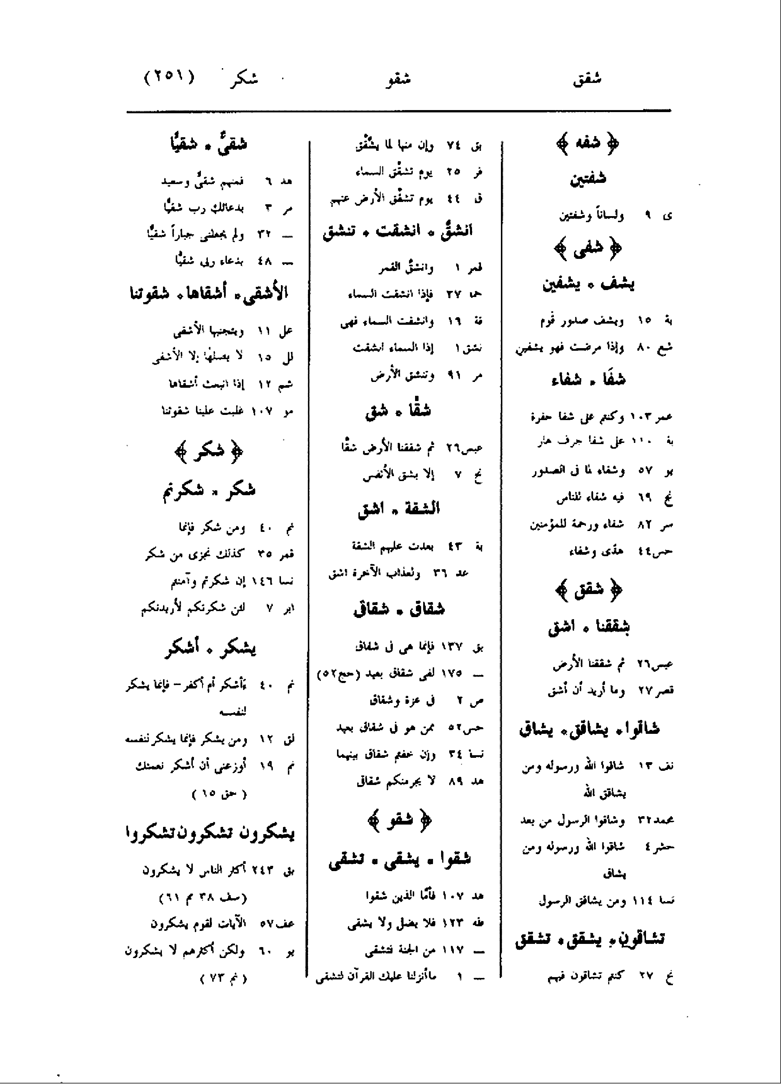 شفه شفتين ى 9 ولسانا وشفتين شفى يشف يشفين بة 15 ويشف صدور قوم شع 80 وإذا مرضت فهو يشفين شفا شفاء عمر 103 وكنتم على شفا حفرة بة 110 على شفا جرف هار يو 57 وشفاء لما فى الصدور نح 69 فيه شفاء للناس سر 82 شفاء ورحمة للمؤمنين حس 44 هدّى وشفاء شقق شققنا اشق عبس 26 ثم شققنا الأرض قصر 27 وما أريد أن أشق شاقوا يشاقق يشاق نف 13 شاقوا الله ورسوله ومن يشاقق الله محمد 32 وشاقوا الرسول من بعد حشر 4 شاقوا الله ورسوله ومن يشاق نسا 114 ومن يشاقق الرسول تشاقون يشقق تشقق نح 27 كنتم تشاقون فيهم بق 74 وإن منها لما يشقّق فر 25 يوم تشقّق السماء ق 44 يوم تشقّق الأرض عنهم انشقّ انشقت تنشق قمر 1 وانشقّ القمر حما 37 فإذا انشقت السماء قة 16 وانشقت السماء فهى نشق 1 إذا السماء انشقت مر 91 وتنشق الأرض شقّا شق عبس 26 ثم شققنا الأرض شقّا نح 7 إلا بشق الأنفس الشقة اشق بة 43 بعدت عليهم الشقة عد 36 ولعذاب الآخرة اشق شقاق شقاقى بق 137 فإنما هى فى شقاق- 175 لفى شقاق بعيد (حج 52) ص 2 فى عزة وشقاق حس 52 ممن هو فى شقاق بعيد نسا 34 وإن خفتم شقاق بينهما هد 89 لا يجرمنكم شقاقى شقو شقوا يشقى تشقى هد 107 فأمّا الذين شقوا طه 123 فلا يضل ولا يشقى- 117 من الجنة فتشقى- 1 ما أنزلنا عليك القرآن لتشقى شقىّ شقيّا هد 6 فمنهم شقىّ وسعيد مر 3 بدعائك رب شقيّا- 32 ولم يجعلنى جبارا شقيّا- 48 بدعاء ربى شقيّا الأشقى أشقاها شقوتنا عل 11 ويتجنبها الأشقى