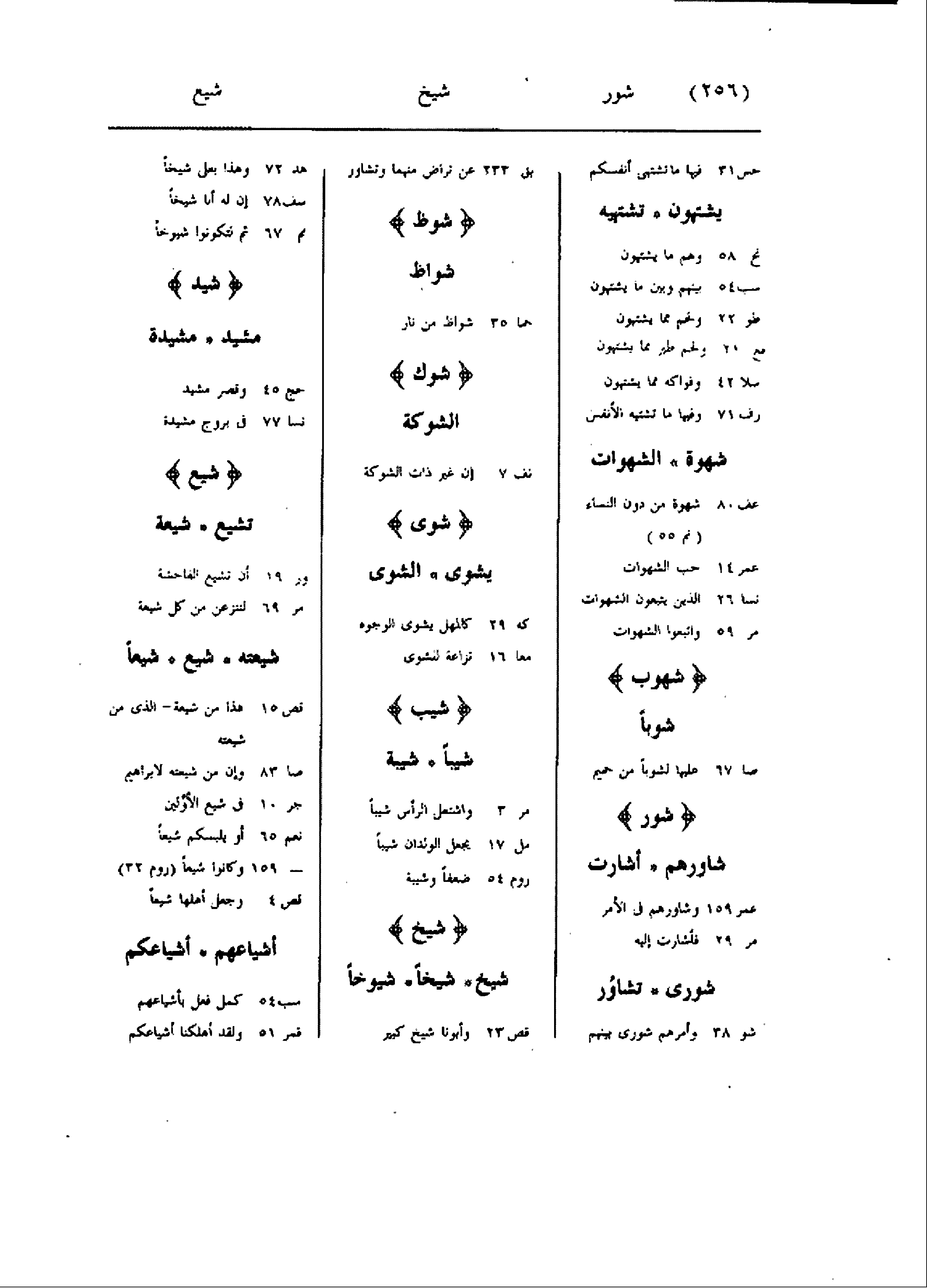 حس 31 فيها ما تشتهى أنفسكم يشتهون تشتهيه نح 58 ولهم ما يشتهون سب 54 بينهم وبين ما يشتهون طو 22 ولحم مما يشتهون قع 21 ولحم طير مما يشتهون سلا 42 وفواكه مما يشتهون رف 71 وفيها ما تشتيه الأنفس شهوة الشهوات عف 80 شهوة من دون النساء (نم 55) عمر 14 حب الشهوات نسا 26 الذين يتبعون الشهوات مر 59 واتبعوا الشهوات شهوب شوبا صا 67 عليها لشوبا من حميم شور شاورهم أشارت عمر 159 وشاورهم فى الأمر مر 29 فأشارت إليه شورى تشاور شو 38 وأمرهم شورى بينهم بق 233 عن تراض منهما وتشاور شوظ شواظ حما 35 شواظ من نار شوك الشوكة نف 7 إن غير ذات الشوكة شوى يشوى الشوى كه 29 كالمهل يشوى الوجوه معا 16 نزاعة للشوى شيب شيبا شيبة مر 3 واشتعل الرأس شيبا مل 17 يجعل الولدان شيبا روم 54 ضعفا وشيبة شيخ شيخ شيخا شيوخا قص 23 وأبونا شيخ كبير هد 72 وهذا بعلى شيخا سف 78 إن له أبا شيخا مم 67 ثم لتكونوا شيوخا شيد مشيد مشيدة حج 45 وقصر مشيد نسا 77 فى بروج مشيدة شيع تشيع شيعة ور 19 أن تشيع الفاحشة مر 69 لننزعن من كل شيعة شيعته شيع شيعا قص 15 هذا من شيعة- الذى من شيعته صا 83 وإن من شيعته لابراهيم جر 10 فى شيع الأوّلين نعم 65 أو يلبسكم شيعا- 159 وكانوا شيعا (روم 32) قص 4 وجعل أهلها شيعا أشياعهم أشياعكم سب 54 كمل فعل بأشياعهم قمر 51 ولقد أهلكنا أشياعكم