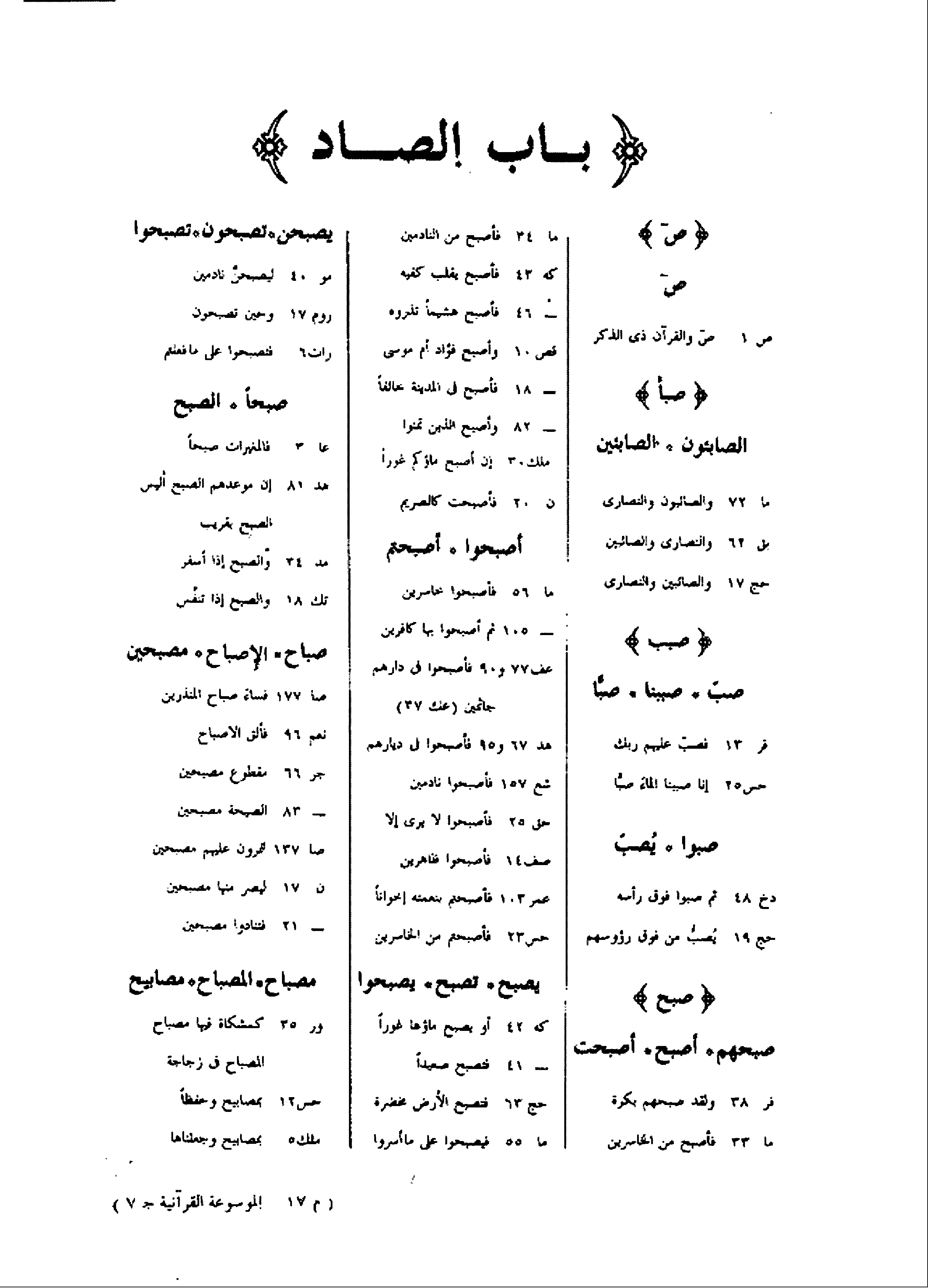 ص ص 1 ص والقرآن ذى الذكر صبأ الصابئون الصابئين ما 72 والصائبون والنصارى بق 62 والنصارى والصائبين حج 17 والصائبين والنصارى صبب صبّ صببنا صبّا فر 13 فصبّ عليهم ربك حس 25 إنا صببنا الماء صبّا صبوا يصبّ دخ 48 ثم صبوا فوق رأسه حج 19 يصبّ من فوق رؤوسهم صبح صبحهم أصبح أصبحت فر 38 ولقد صبحهم بكرة ما 33 فأصبح من الخاسرين ما 34 فأصبح من النادمين كه 43 فأصبح يقلب كفيه- 46 فأصبح هشيما تذروه قص 10 وأصبح فؤاد أم موسى- 18 فأصبح فى المدينة خائفا- 82 وأصبح الذين تمنوا ملك 30 إن أصبح ماؤكم غورا ن 20 فأصبحت كالصريم أصبحوا أصبحتم ما 56 فأصبحوا خاسرين- 105 ثم أصبحوا بها كافرين عف 77 و 90 فأصبحوا فى دارهم جاثمين (عك 37) هد 67 و 95 فأصبحوا فى ديارهم شع 157 فأصبحوا نادمين حق 25 فأصبحوا لا يرى إلا صف 14 فأصبحوا ظاهرين عمر 103 فأصبحتم بنعمته إخوانا حس 23 فأصبحتم من الخاسرين يصبح تصبح يصبحوا كه 42 أو يصبح ماؤها غورا- 41 فتصبح صعيدا حج 63 فتصبح الأرض مخضرة ما 55 فيصبحوا على ما أسروا يصبحن تصبحون تصبحوا مو 40 ليصبحنّ نادمين روم 17 وحين تصبحون رات 6 فتصبحوا على ما فعلتم صبحا الصبح عا 3 فالمغيرات صبحا هد 81 إن موعدهم الصبح أليس الصبح بقريب مد 34 والصبح إذا أسفر تك 18 والصبح إذا تنفّس صباح الإصباح مصبحين صا 177 فساء صباح المنذرين نعم 96 فألق الاصباح جر 66 مقطوع مصبحين- 83 الصيحة مصبحين صا 137 لتمرون عليهم مصبحين ن 17 ليصر منها مصبحين- 21 فتنادوا مصبحين مصباح المصباح مصابيح ور 35 كمشكاة فيها مصباح المصباح فى زجاجة حس 12 بمصابيح وحفظا ملك 5 بمصابيح وجعلناها