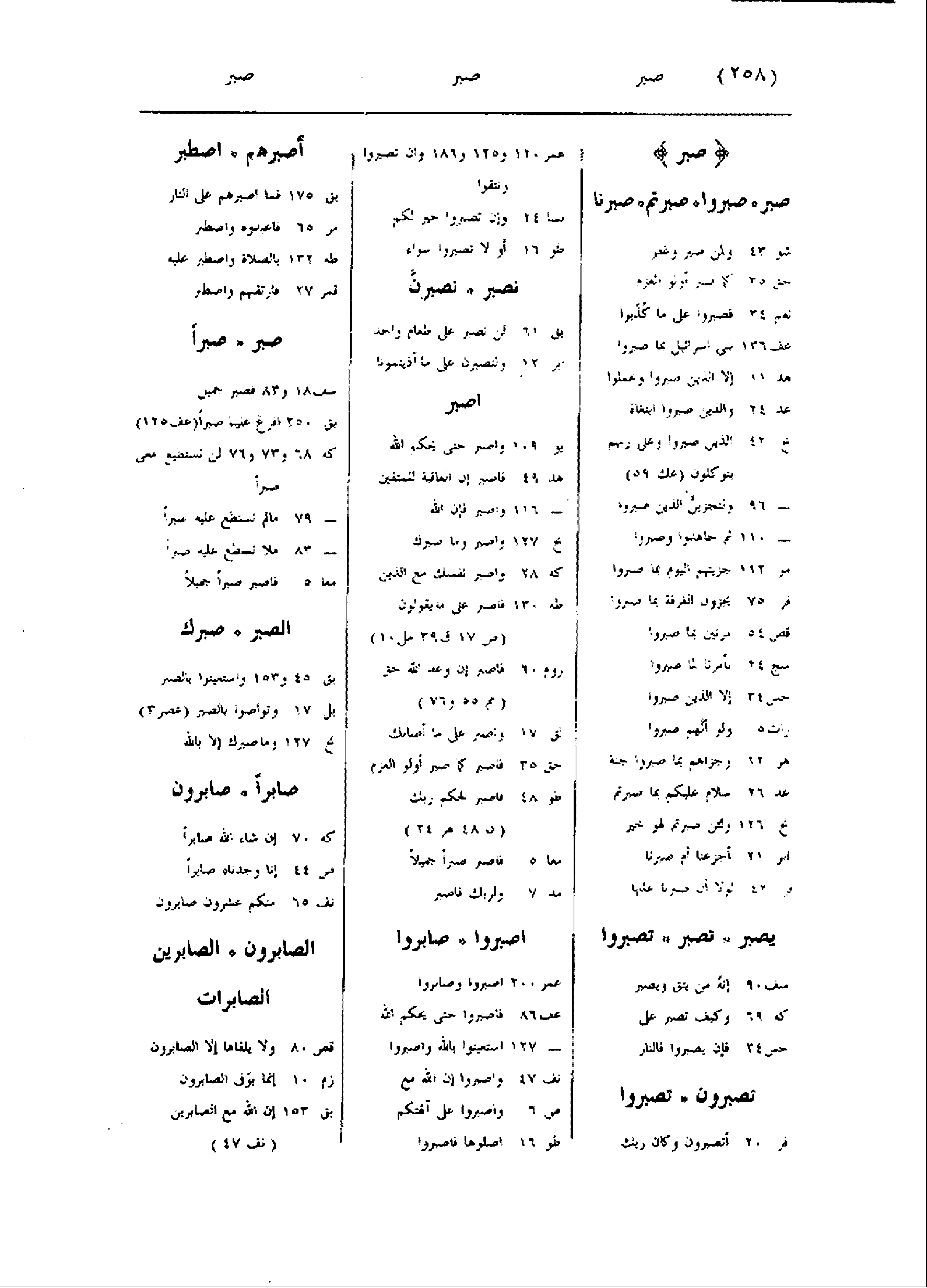 صبر صبر صبروا صبرتم صبرنا شو 43 ولمن صبر وغفر حق 35 كما صبر أولوا العزم نعم 34 فصبروا على ما كذّبوا عف 136 بنى اسرائيل بما صبروا هد 11 إلا الذين صبروا وعملوا عد 24 والذين صبروا ابتغاء نح 42 الذين صبروا وعلى ربهم يتوكلون (عك 59) - 96 ولنجزينّ الذين صبروا- 110 ثم جاهدوا وصبروا مو 112 جزيتهم اليوم بما صبروا فر 75 يجزون الغرفة بما صبروا قص 54 مرتين بما صبروا سج 24 بأمرنا لما صبروا حس 34 إلا الذين صبروا رات 5 ولو أنّهم صبروا هر 12 وجزاهم بما صبروا جنة عد 26 سلام عليكم بما صبرتم نح 126 ولئن صبرتم لهو خير ابر 21 أجزعنا أم صبرنا فر 42 لولا أن صبرنا عليها يصبر تصبر تصبروا سف 90 إنه من يتق ويصبر كه 69 وكيف تصبر على حس 24 فإن يصبروا فالنار تصبرون تصبروا فر 20 أتصبرون وكان ربك عمر 120 و 125 و 186 وان تصبروا وتتقوا نسا 24 وإن تصبروا خير لكم طو 16 أو لا تصبروا سواء نصبر نصبرنّ بق 61 لن نصبر على طعام واحد ابر 12 ولنصبرن على ما آذيتمونا اصبر يو 109 واصبر حتى يحكم الله هد 49 فاصبر إن العاقبة للمتقين- 116 واصبر فإن الله نح 127 واصبر وما صبرك كه 28 واصبر نفسك مع الذين طه 130 فاصبر على ما يقولون (ص 17 ق 39 مل 10) روم 60 فاصبر إن وعد الله حق (مم 55 و 76) لق 17 واصبر على ما أصابك حق 35 فاصبر كما صبر أولو العزم طو 48 فاصبر لحكم ربك (ن 48 هر 24) معا 5 فاصبر صبرا جميلا مد 7 ولربك فاصبر اصبروا صابروا عمر 200 اصبروا وصابروا عف 86 فاصبروا حتى يحكم الله- 127 استعينوا بالله واصبروا نف 47 واصبروا إن الله مع ص 6 واصبروا على آلهتكم طو 16 اصلوها فاصبروا أصبرهم اصطبر بق 175 فما اصبرهم على النار مر 65 فاعبدوه واصطبر طه 132 بالصلاة واصطبر عليه قمر 27 فارتقبهم واصطبر صبر صبرا سف 18 و 83 فصبر جميل بق 250 افرغ علينا صبرا (عف 125) كه 68 و 73 و 76 لن تستطيع معى صبرا- 79 ما لم تستطع عليه صبرا- 83 ملا تسطع عليه صبرا معا 5 فاصبر صبرا جميلا الصبر صبرك بق 45 و 153 واستعينوا بالصبر بل 17 وتواصوا بالصبر (عصر 3) نح 127 وما صبرك إلا بالله صابرا صابرون كه 70 إن شاء الله صابرا ص 44 إنا وجدناه صابرا نف 65 منكم عشرون صابرون الصابرون الصابرين الصابرات قص 80 ولا يلقاها إلا الصابرون زم 10 إنما يوفى الصابرون بق 153 إن الله مع الصابرين (نف 47)