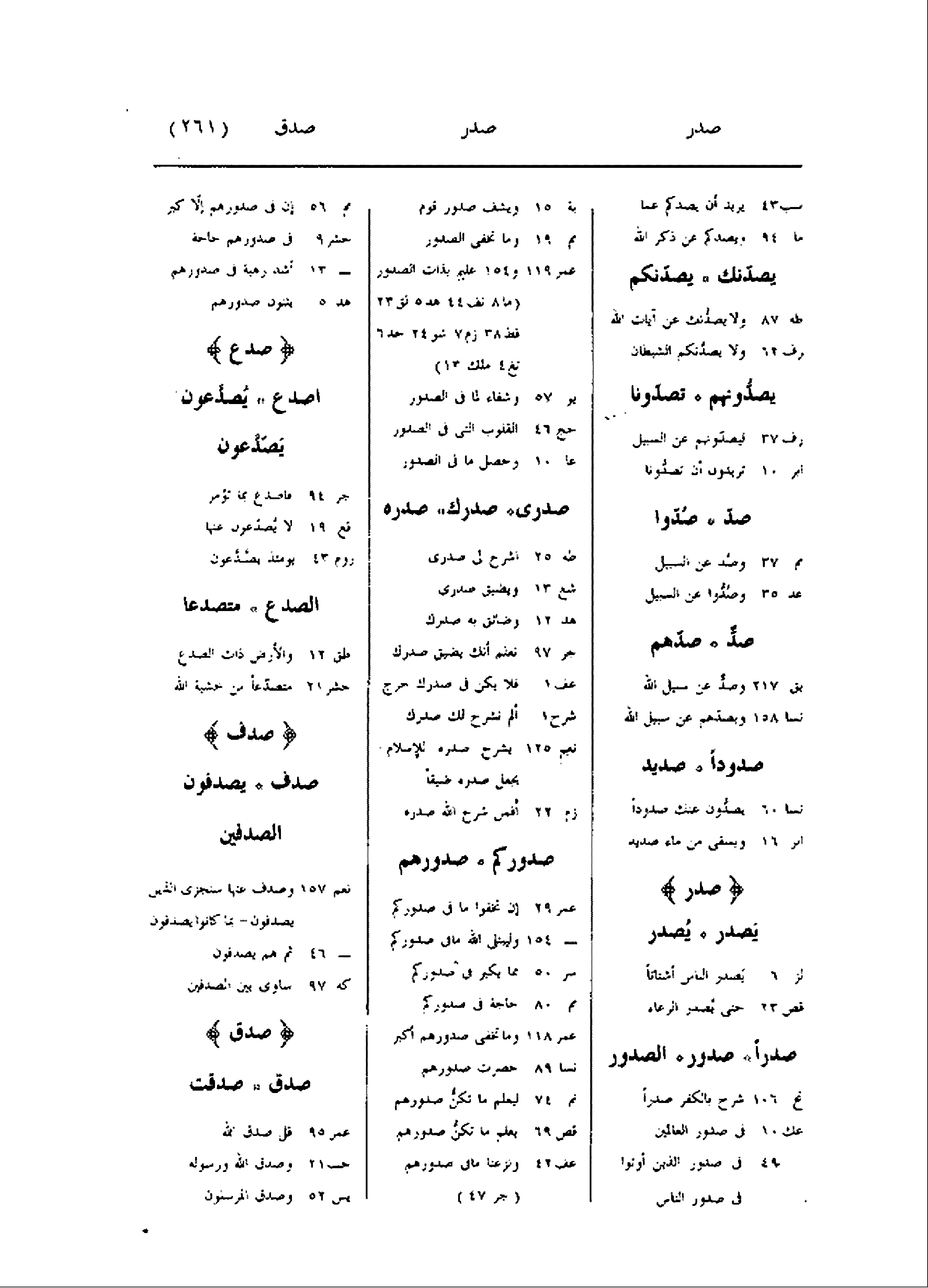 سب 43 يريد أن يصدكم عما ما 94 ويصدكم عن ذكر الله يصدّنك يصدّنكم طه 87 ولا يصدّنك عن آيات الله رف 62 ولا يصدّنكم الشيطان يصدّونهم تصدّونا رف 37 ليصدّونهم عن السبيل ابر 10 تريدون أن تصدّونا صدّ صدّوا مم 37 وصد عن السبيل عد 35 وصدّوا عن السبيل صدّ صدّهم بق 217 وصدّ عن سبيل الله نسا 158 وبصدّهم عن سبيل الله صدودا صديد نسا 60 يصدّون عنك صدودا ابر 16 ويسقى من ماء صديد صدر يصدر يصدر لز 6 يصدر الناس أشتاتا قص 23 حتى يصدر الرعاء صدرا صدور الصدور نح 106 شرح بالكفر صدرا عك 10 فى صدور العالمين 49 فى صدور الذين أوتوا فى صدور الناس بة 15 ويشف صدور قوم مم 19 وما تخفى الصدور عمر 119 و 154 عليم بذات الصدور (ما 8 نف 44 هد 5 لق 23 فط 38 زم 7 شو 24 حد 6 تغ 4 ملك 13) يو 57 وشفاء لما فى الصدور حج 46 القلوب التى فى الصدور عا 10 وحصل ما فى الصدور صدرى صدرك صدره طه 25 اشرح لى صدرى شع 13 ويضيق صدرى هد 12 وضائق به صدرك جر 97 نعلم أنك يضيق صدرك عف