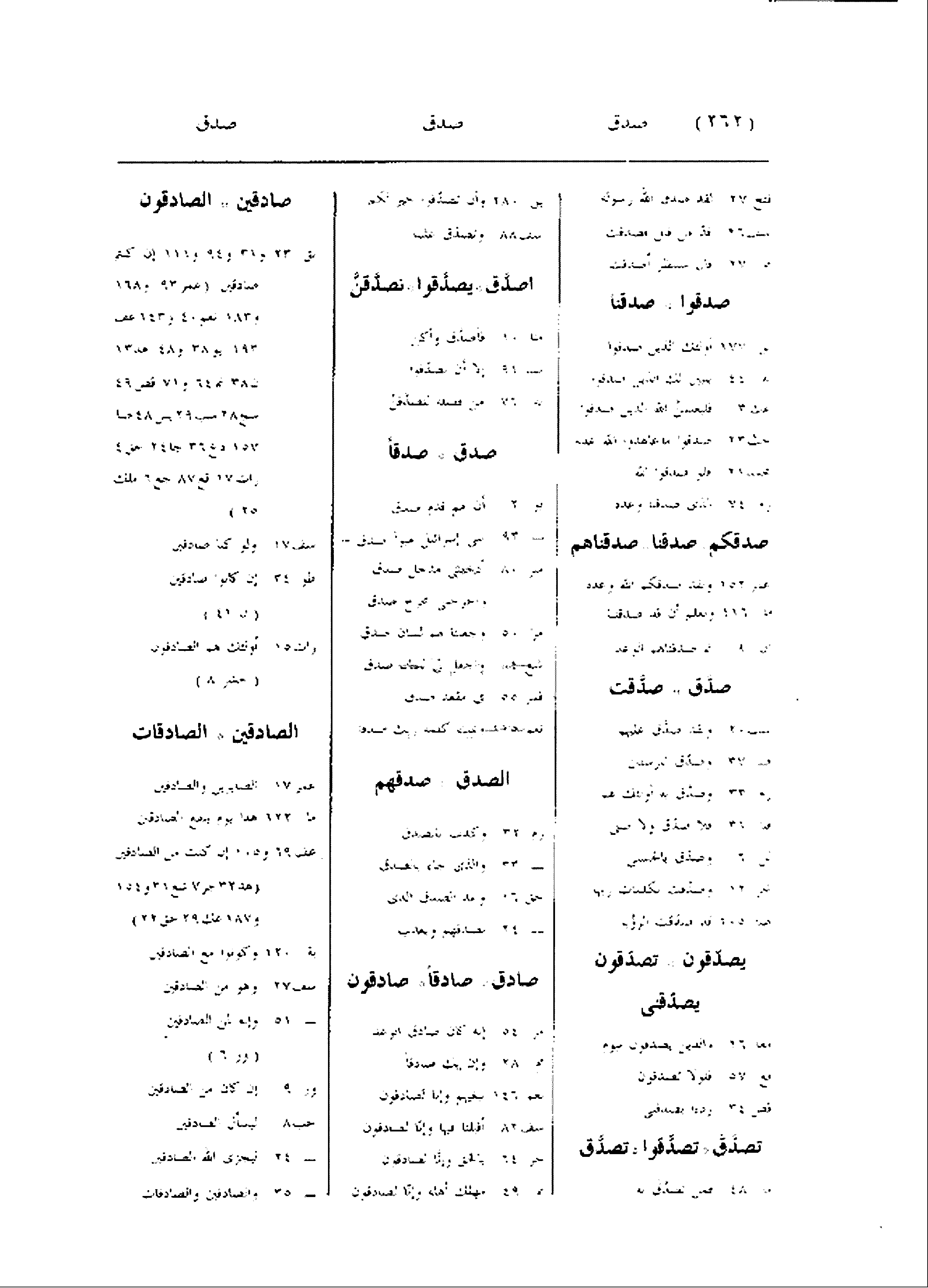 فتح 27 لقد صدق الله رسوله سف 26 قدّ من قبل فصدقت نم 27 قال سننظر أصدقت صدقوا صدقنا بق 177 أولئك الذين صدقوا بة 44 يتبين لك الذين صدقوا عك 3 فليعلمنّ الله الذين صدقوا حب 23 صدقوا ما عاهدوا الله عليه محمد 21 فلو صدقوا الله زم 74 الذى صدقنا وعده صدقكم صدقنا صدقناهم عمر 152 ولقد صدقكم الله وعده ما 116 ونعلم أن قد صدقتنا ان 9 ثم صدقناهم الوعد صدّق صدّقت سب 20 ولقد صدّق عليهم صا 37 وصدّق المرسلين زم 33 وصدّق به أولئك هم قيا 31 فلا صدّق ولا صلى لل 6 وصدّق بالحسنى تحر 12 وصدّقت بكلمات ربها صا 105 قد صدّقت الرؤيا يصدّقون تصدّقون يصدّقنى معا 26 والذين يصدّقون بيوم قع 57 فلولا تصدقون قص 34 ردءا يصدقنى تصدّق تصدّقوا تصدّق ما 48 فمن تصدّق به بق 280 وأن تصدّقوا خير لكم سف 88 وتصدّق علينا اصدّق يصدّقوا نصدّقنّ منا 10 فأصدق وأكن نسا 91 إلا أن يصدّقوا بة 76 من فضله لنصدّقنّ صدق صدقا يو 2 أن لهم قدم صدق- 93 بنى إسرائيل مبوأ صدق- سر 80 أدخلنى مدخل صدق- وأخرجنى مخرج صدق مر 50 وجعلنا لهم لسان صدق شع 84 واجعل لى لسان صدق قمر 55 فى مقعد صدق نعم 115 وتمت كلمة ربك صدقا الصدق صدقهم زم 32 وكذب بالصدق- 33 والذى جاء بالصدق حق 16 وعد الصدق الذى- 24 بصدقهم ويعذب صادق صادقا صادقون مر 54 إنه كان صادق الوعد مم 28 وإن يك صادقا نعم 146 ببغيهم وإنا لصادقون سف 82 أقبلنا فيها وإنّا لصادقون جر 64 بالحق وإنّا لصادقون نم 49 مهلك أهله وإنّا لصادقون صادقين الصادقون بق 23 و 31 و 94 و 111 إن كنتم صادقين (عمر 93 و 168 و 183 نعم 40 و 143 عف 193 يو 38 و 48 هد 13 ن 38 نم 64 و 71 قص 49 سج 28 سب 29 يس 48 صا 157 دخ 36 جا 24 حق 4 رات 17 قع 87 جع 6 ملك 25) سف 17 ولو كنا صادقين طو 34 إن كانوا صادقين (ن 41) رات 15 أولئك هم الصادقون (حشر 8) الصادقين الصادقات عمر 17 الصابرين والصادقين ما 122 هذا يوم ينفع الصادقين عف 69 و 105 إن كنت من الصادقين (هد 32 جر 7 شع 31 و 154 و 187 عك 29 حق 22) بة 120 وكونوا مع الصادقين سف 27 وهو من الصادقين- 51 وإنه لمن الصادقين (ور 6) ور 9 إن كان من الصادقين حب 8 ليسأل الصادقين- 24 ليجزى الله الصادقين- 35 والصادقين والصادقات