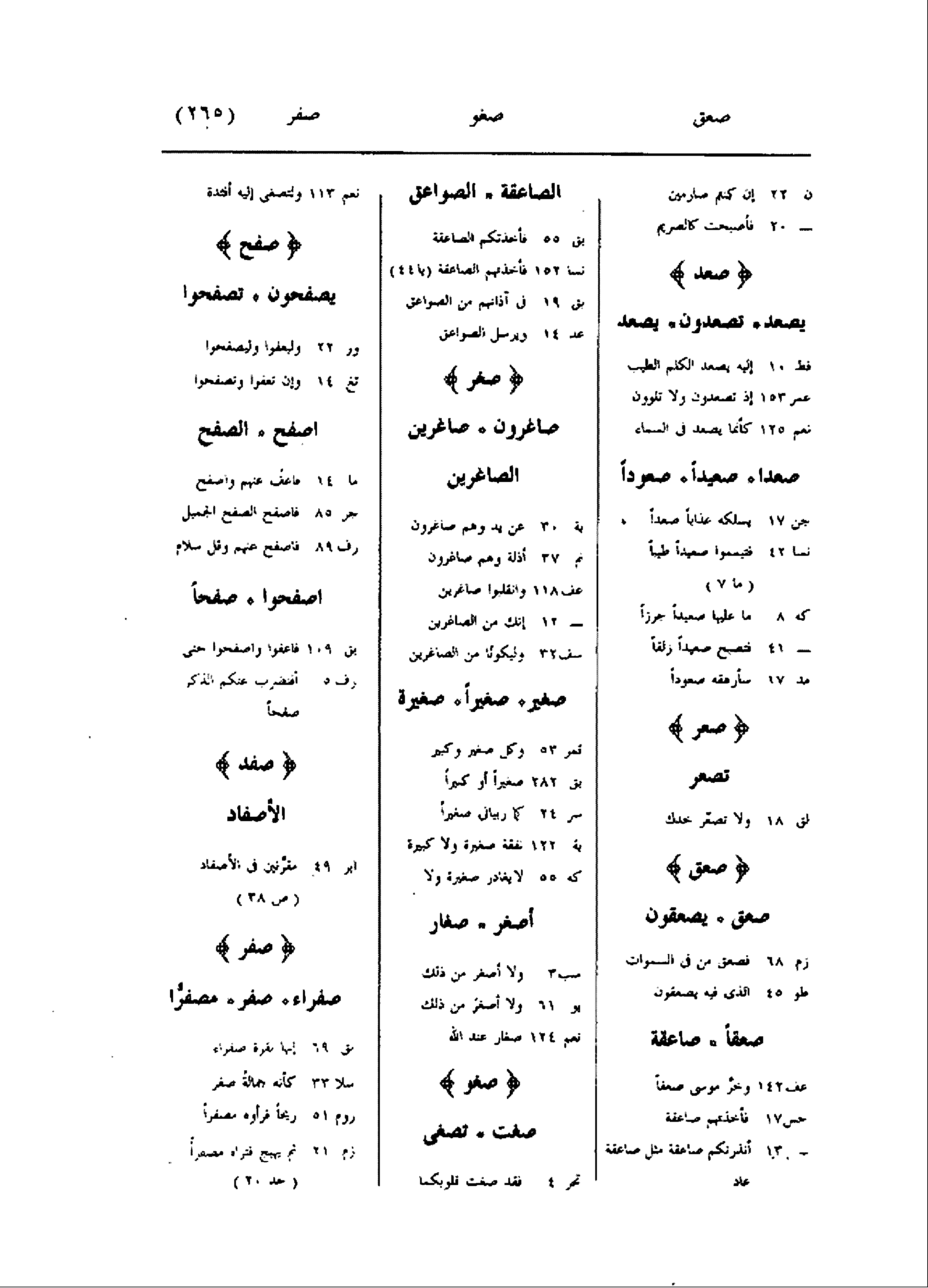 ن 22 إن كنتم صارمين- 20 فأصبحت كالصريم صعد يصعد تصعدون يصعد فط 10 إليه يصعد الكلم الطيب عمر 153 إذ تصعدون ولا تلوون نعم 125 كأنما يصعد فى السماء صعدا صعيدا صعودا جن 17 يسلكه عذابا صعدا نسا 42 فتيمموا صعيدا طيبا (ما 7) كه 8 ما عليها صعيدا جرزا- 41 فتصبح صعيدا زلقا مد 17 سأرهقه صعودا صعر تصعر لق 18 ولا تصعّر خدك صعق صعق يصعقون زم 68 فصعق من فى السموات طو 45 الذي فيه يصعقون صعقا صاعقة عف 142 وخرّ موسى صعقا حس 17 فأخذتهم صاعقة- 13 أنذرتكم صاعقة مثل صاعقة عاد الصاعقة الصواعق بق 55 فأخذتكم الصاعقة نسا 152 فأخذتهم الصاعقة (يا 44) بق 19 فى آذانهم من الصواعق عد 14 ويرسل الصواعق صغر صاغرون صاغرين الصاغرين بة 30 عن يد وهم صاغرون نم 37 أذلة وهم صاغرون عف 118 وانقلبوا صاغرين- 12 إنك من الصاغرين سف 32 وليكونا من الصاغرين صغير صغيرا صغيرة قمر 53 وكل صغير وكبير بق 282 صغيرا أو كبيرا سر 24 كما ربيانى صغيرا بة 122 نفقة صغيرة ولا كبيرة كه 55 لا يغادر صغيرة ولا أصغر صغار سب 3 ولا أصغر من ذلك يو 61 ولا أصغر من ذلك نعم 124 صغار عند الله صغو صغت تصغى تحر 4 فقد صغت قلوبكما نعم 113 ولتصغى إليه أفئدة صفح يصفحون تصفحوا ور 22 وليعفوا وليصفحوا تغ 14 وإن تعفوا وتصفحوا اصفح الصفح ما 14 فاعف عنهم واصفح جر 85 فاصفح الصفح الجميل رف 89 فاصفح عنهم وقل سلام اصفحوا صفحا بق 109 فاعفوا واصفحوا حتى رف 5 أفنضرب عنكم الذكر صفحا صفد الأصفاد ابر 49 مقرّنين فى الأصفاد (ص 38) صفر صفراء صفر مصفرّا بق 69 إنها بقرة صفراء سلا 33 كأنه جمالة صفر روم 51 ريحا فرأوه مصفرا زم 21 ثم يهيج فتراه مصفرا (حد 20)