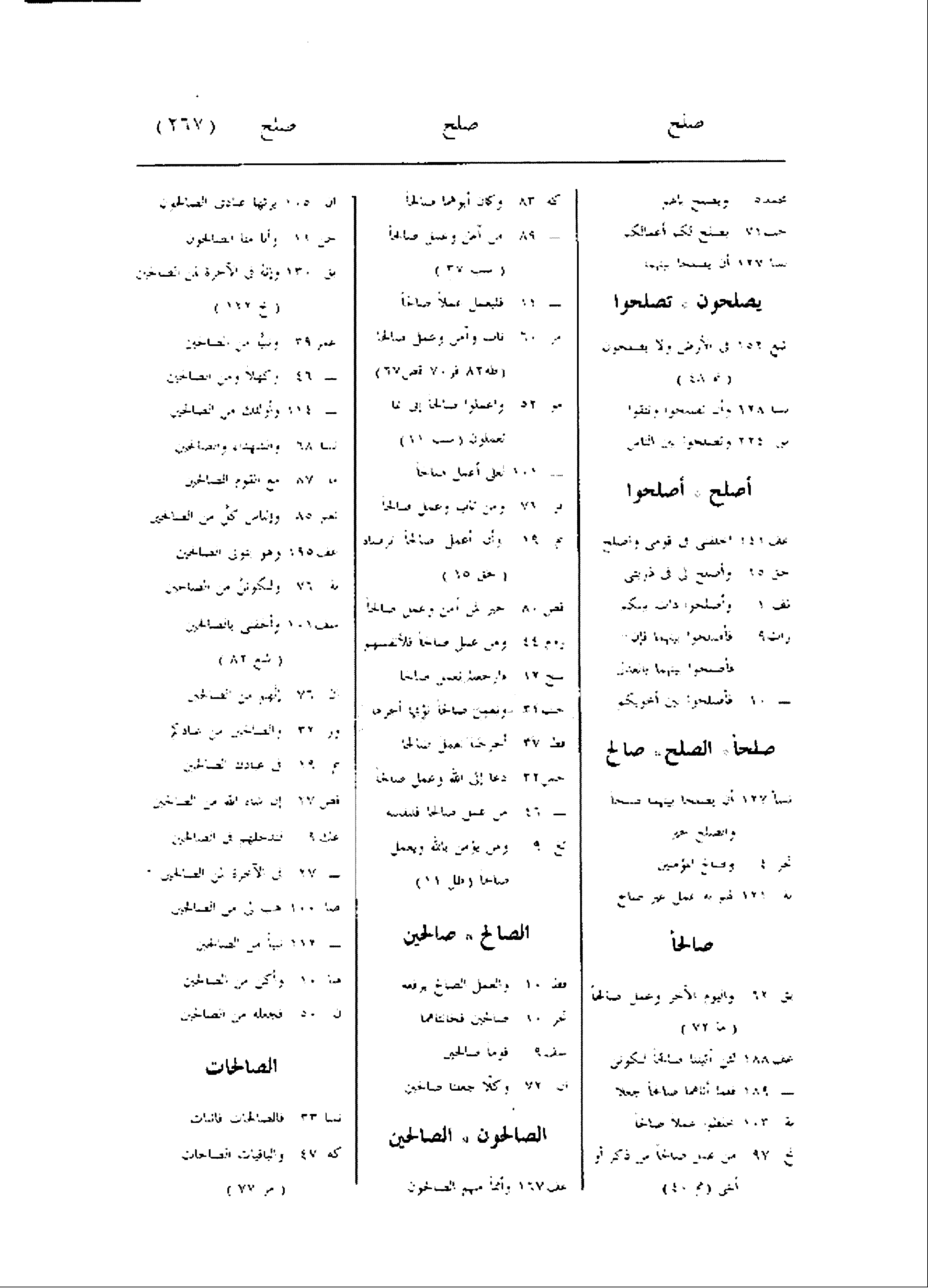 محمد 5 ويصلح بالهم حب 71 يصلح لكم أعمالكم نسا 127 أن يصلحا بينهما يصلحون تصلحوا شع 152 فى الأرض ولا يصلحون (نم 48) نسا 128 وأن تصلحوا وتتقوا بق 224 وتصلحوا بين الناس أصلح أصلحوا عف 141 اخلفنى فى قومى واصلح حق 15 وأصلح لى فى ذريتى نف 1 وأصلحوا ذات بينكم رات 9 فأصلحوا بينهما فإن- فأصلحوا بينهما بالعدل- 10 فأصلحوا بين أخويكم صلحا الصلح صالح نسا 127 أن يصلحا بينهما صلحا والصلح خير تحر 4 وصالح المؤمنين بة 121 لهم به عمل غير صالح صالحا بق 62 واليوم الآخر وعمل صالحا (ما 72) عف 188 لئن آتيتنا صالحا لنكونن- 189 فلما أتاهما صالحا جعلا بة 103 خلطوا عملا صالحا نح 97 من عمل صالحا من ذكر أو أنثى (مم 40) كه 83 وكان أبوهما صالحا- 89 من آمن وعمل صالحا (سب 37) - 11 فليعمل عملا صالحا مر 60 تاب وآمن وعمل صالحا (طه 82 فر 70 قص 67) مو 52 واعملوا صالحا إنى بما تعملون (سب 11) - 101 لعلى أعمل صالحا فر 71 ومن تاب وعمل صالحا نم 19 وأن أعمل صالحا ترضاه (حق 15) قص 80 خير لمن آمن وعمل صالحا روم 44 ومن عمل صالحا فلأنفسهم سج 12 فارجعنا نعمل صالحا حب 31 وتعمل صالحا نؤتها أجرها فط 37 أخرجنا نعمل صالحا حس 32 دعا إلى الله وعمل صالحا- 46 من عمل صالحا فلنفسه تغ 9 ومن يؤمن بالله ويعمل صالحا (طل 11) الصالح صالحين فط 10 والعمل الصالح يرفعه تحر 10 صالحين فخانتاهما سف 9 قوما صالحين ان 72 وكلّا جعلنا صالحين الصالحون الصالحين عف 167 وأمما منهم الصالحون ان 105 يرثها عبادى الصالحون جن 11 وأنا منا الصالحون بق 130 وإنه فى الآخرة لمن الصالحين (نح 122) عمر 39 ونبيّا من الصالحين- 46 وكهلا ومن الصالحين- 114 وأولئك من الصالحين نسا 68 والشهداء والصالحين ما 87 مع القوم الصالحين نعم 85 وإلياس كلّ من الصالحين عف 195 وهو يتولى الصالحين بة 76 ولنكوننّ من الصالحين سف 101 وألحقنى بالصالحين (شع 82) ان 76 إنّهم من الصالحين ور 32 والصالحين من عبادكم نم 19 فى عبادك الصالحين قص 27 إن شاء الله من الصالحين عك 9 لندخلهم فى الصالحين- 27 فى الآخرة لمن الصالحين صا 100 هب لى من الصالحين- 112 نبيا من الصالحين منا 10 وأكن من الصالحين ن 50 فجعله من الصالحين الصالحات نسا 33 فالصالحات قانتات كه 47 والباقيات الصالحات (مر 77)