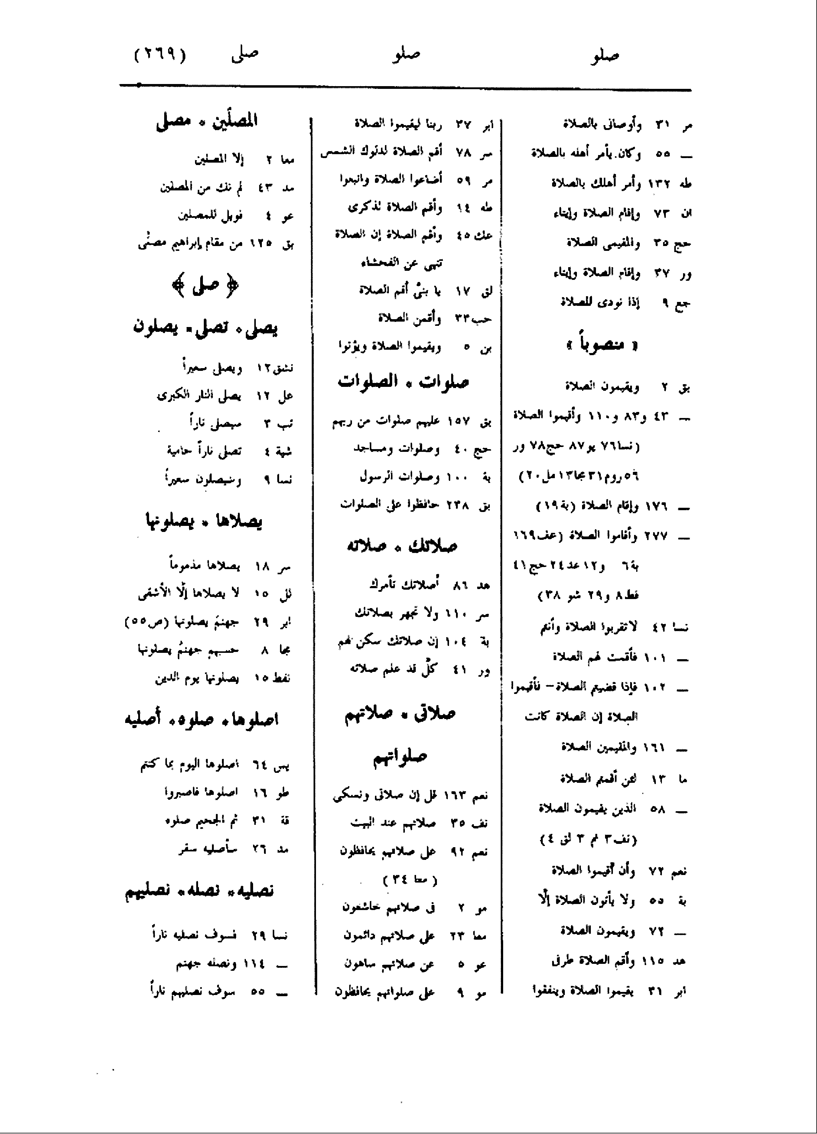 مر 31 وأوصانى بالصلاة- 55 وكان يأمر أهله بالصلاة طه 132 وأمر أهلك بالصلاة ان 73 وإقام الصلاة وإيتاء حج 35 والمقيمى الصلاة ور 37 وإقام الصلاة وإيتاء جع 9 إذا نودى للصلاة «منصوبا» بق 2 ويقيمون الصلاة- 43 و 83 و 110 وأقيموا الصلاة (نسا 76 يو 87 حج 78 ور 56 روم 31 مجا 13 مل 20) - 176 وإقام الصلاة (بة 19) - 277 وأقاموا الصلاة (عف 169 بة 6 و 12 عد 24 حج 41 فط 8 و 29 شو 38) نسا 42 لا تقربوا الصلاة وأنتم- 101 فأقمت لهم الصلاة- 102 فإذا قضيتم الصلاة- فأقيموا الصلاة إن الصلاة كانت- 161 والمقيمين الصلاة ما 13 لئن أقمتم الصلاة- 58 الذين يقيمون الصلاة (نف 3 نم 3 لق 4) نعم 72 وأن أقيموا الصلاة بة 55 ولا يأتون الصلاة إلّا- 72 ويقيمون الصلاة هد 115 وأقم الصلاة طرفى ابر 31 يقيموا الصلاة وينفقوا ابر 37 ربنا ليقيموا الصلاة سر 78 أقم الصلاة لدلوك الشمس مر 59 أضاعوا الصلاة واتبعوا طه 14 وأقم الصلاة لذكرى عك 45 وأقم الصلاة إن الصلاة تنهى عن الفحشاء لق 17 يا بنىّ أقم الصلاة حب 33 وأقمن الصلاة بن 5 ويقيموا الصلاة ويؤتوا صلوات الصلوات بق 157 عليهم صلوات من ربهم حج 40 وصلوات ومساجد بة 100 وصلوات الرسول بق 238 حافظوا على الصلوات صلاتك صلاته هد 86 أصلاتك تأمرك سر 110 ولا تجهر بصلاتك بة 104 إن صلاتك سكن لهم ور 41 كلّ قد علم صلاته صلاتى صلاتهم صلواتهم نعم 163 قل إن صلاتى ونسكى نف 35 صلاتهم عند البيت نعم 92 على صلاتهم يحافظون (معا 34) مو 2 فى صلاتهم خاشعون معا 23 على صلاتهم دائمون عو 5 عن صلاتهم ساهون مو 9 على صلواتهم يحافظون المصلّين مصلى معا 2 إلا المصلين مد 43 لم نك من المصلين عو 4 فويل للمصلين بق 125 من مقام إبراهيم مصلّى صلى يصلى تصلى يصلون نشق 12 ويصلى سعيرا عل 12 يصلى النار الكبرى تب 3 سيصلى نارا شية 4 تصلى نارا حامية نسا 9 وسيصلون سعيرا يصلاها يصلونها سر 18 يصلاها مذموما لل 15 لا يصلاها إلّا الأشقى ابر 29 جهنم يصلونها (ص 55) مجا 8 حسبهم جهنم يصلونها نفط 15 يصلونها يوم الدين اصلوها صلوه أصليه يس 64 اصلوها اليوم بما كنتم طو 16 اصلوها فاصبروا قة 31 ثم الجحيم صلوه مد 26 سأصليه سقر نصليه نصله نصليهم نسا 29 فسوف نصليه نارا- 114 ونصله جهنم- 55 سوف نصليهم نارا