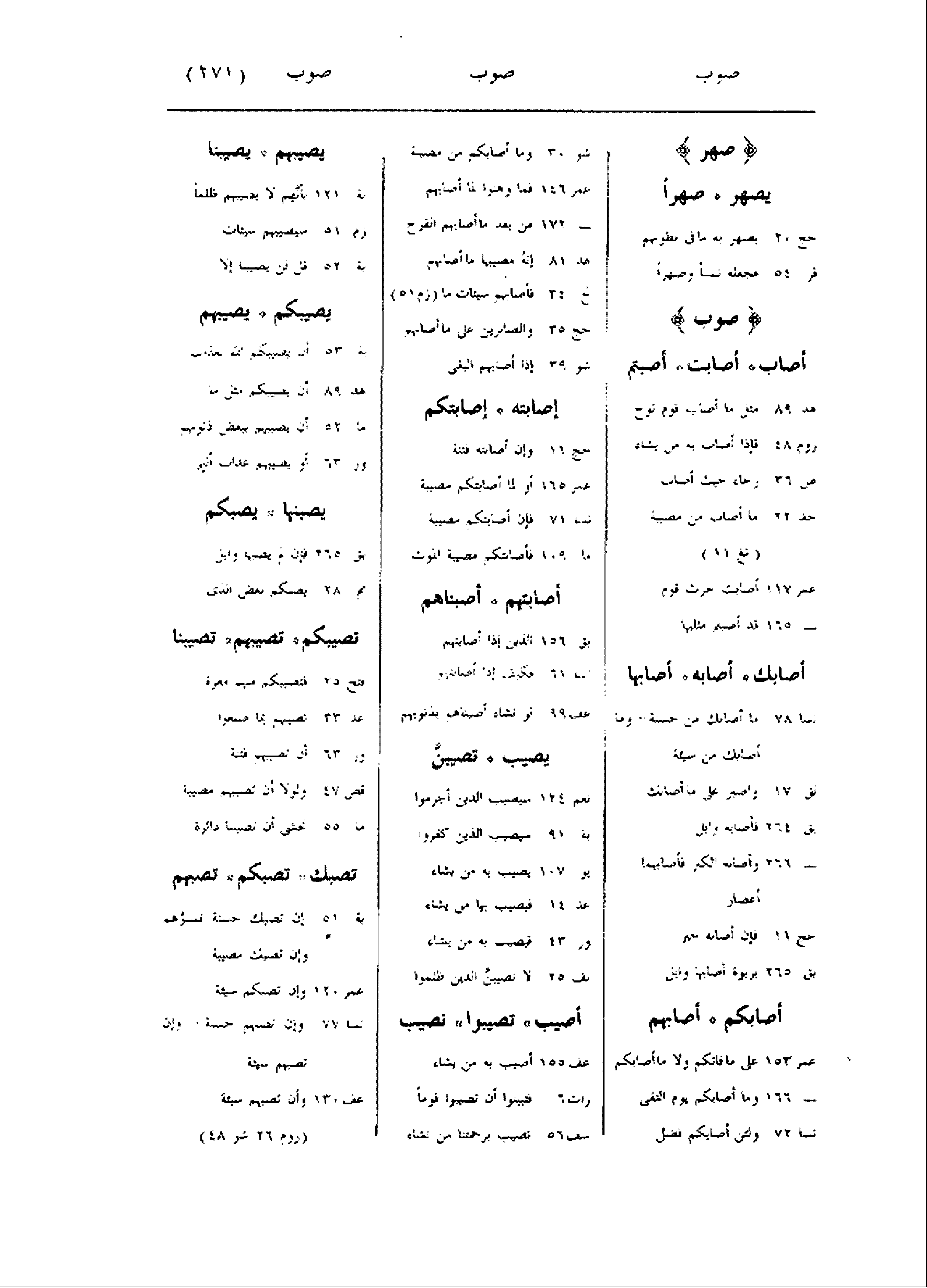 صهر يصهر صهرا حج 20 يصهر به ما فى بطونهم فر 54 فجعله نسبا وصهرا صوب أصاب أصابت أصبتم هد 89 مثل ما أصاب قوم نوح روم 48 فإذا أصاب به من يشاء ص 36 رخاء حيث أصاب حد 22 ما أصاب من مصيبة (تغ 11) عمر 117 أصابت حرث قوم- 165 قد أصبتم مثليها أصابك أصابه أصابها نسا 78 ما أصابك من حسنة- وما أصابك من سيئة لق 17 واصبر على ما أصابك بق 264 فأصابه وابل- 266 وأصابه الكبر فأصابهما أعصار حج 11 فإن أصابه خير بق 265 بربوة أصابها وابل أصابكم أصابهم عمر 153 على ما فاتكم ولا ما أصابكم- 166 وما أصابكم يوم التقى نسا 72 ولئن أصابكم فضل شو 30 وما أصابكم من مصيبة عمر 146 فما وهنوا لما أصابهم- 172 من بعد ما أصابهم القرح هد 81 إنه مصيبها ما أصابهم نح 34 فأصابهم سيئات ما (زم 51) حج 35 والصابرين على ما أصابهم شو 39 إذا أصابهم البغى إصابته إصابتكم حج 11 وإن أصابته فتنة عمر 165 أو لما أصابتكم مصيبة نسا 71 فإن أصابتكم مصيبة ما 109 فأصابتكم مصيبة الموت أصابتهم أصبناهم بق 156 الذين إذا أصابتهم نسا 61 فكيف إذا أصابتهم عف 99 لو نشاء أصبناهم بذنوبهم يصيب تصيبنّ نعم 124 سيصيب الذين أجرموا بة 91 سيصيب الذين كفروا يو 107 يصيب به من يشاء عد 14 فيصيب بها من يشاء ور 43 فيصيب به من يشاء نف 25 لا تصيبنّ الذين ظلموا أصيب تصيبوا نصيب عف 155 أصيب به من يشاء رات 6 فتبينوا أن تصيبوا قوما سف 56 نصيب برحمتنا من نشاء يصيبهم يصيبنا بة 121 بأنّهم لا يصيبهم ظلما زم 51 سيصيبهم سيئات بة 52 قل لن يصيبنا إلا يصيبكم يصيبهم بة 53 أن يصيبكم الله بعذاب هد 89 أن يصيبكم مثل ما ما 52 أن يصيبهم ببعض ذنوبهم ور 63 أو يصيبهم عذاب أليم يصبنها يصبكم بق 265 فإن لم يصبها وابل مم 28 يصبكم بعض الذى تصيبكم تصيبهم تصيبنا فتح 25 فتصيبكم منهم معرة عد 33 تصيبهم بما صنعوا ور 63 أن تصيبهم فتنة قص 47 ولولا أن تصيبهم مصيبة ما 55 نخشى أن تصيبنا دائرة تصبك تصبكم تصبهم بة 51 إن تصبك حسنة تسؤهم وإن تصبك مصيبة عمر 120 وإن تصبكم سيئة نسا 77 وإن تصبهم حسنة- وإن تصبهم سيئة عف 130 وأن تصبهم سيئة (روم 26 شو 48)
