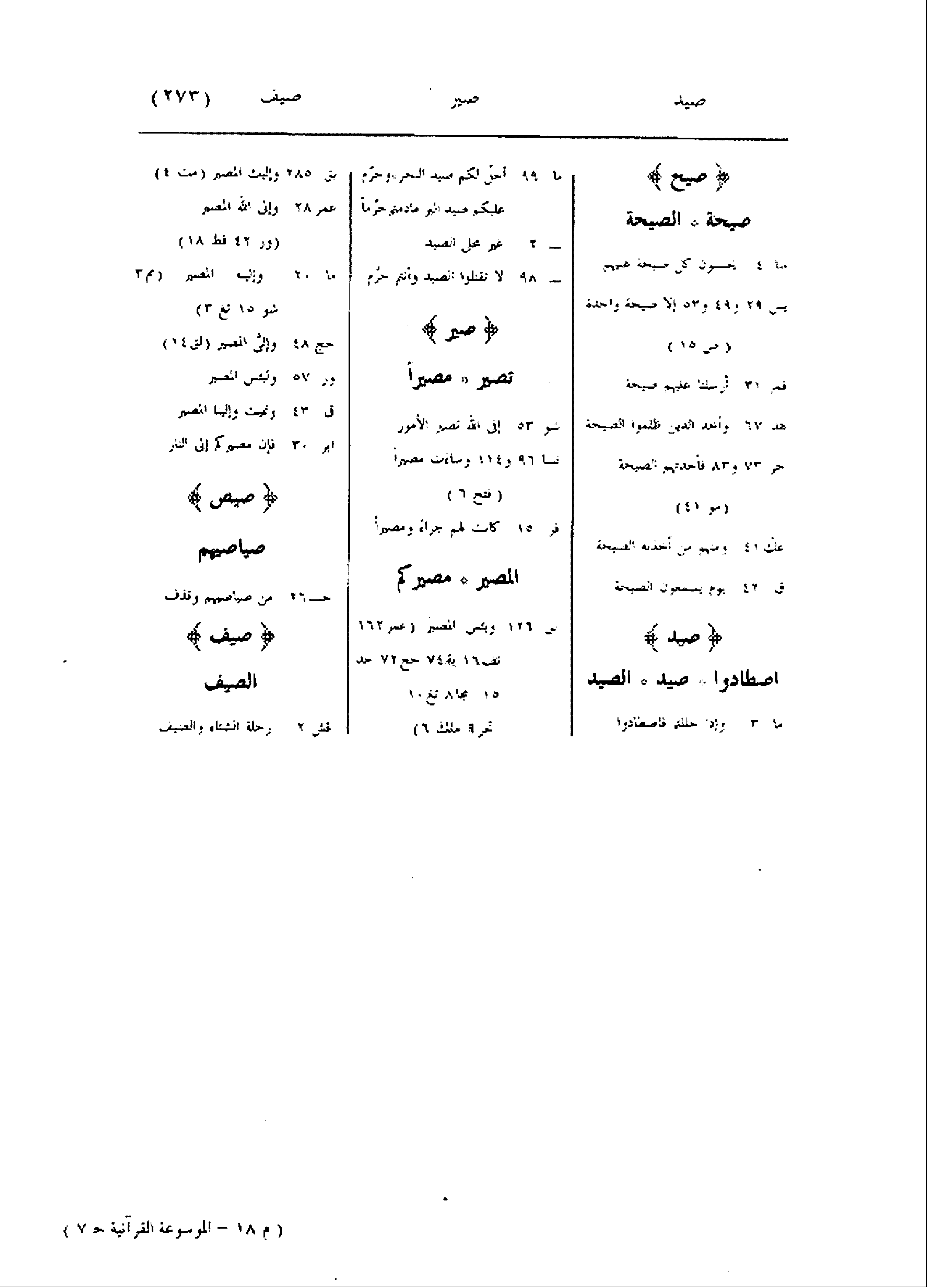 صيح صيحة الصيحة منا 4 يحسبون كل صيحة عليهم يس 29 و 49 و 53 إلا صيحة واحدة (ص 15) قمر 31 أرسلنا عليهم صيحة هد 67 وأخذ الذين ظلموا الصيحة جر 73 و 83 فأخذتهم الصيحة (مو 41) عك 41 ومنهم من أخذته الصيحة ق 42 يوم يسمعون الصيحة صيد اصطادوا صيد الصيد ما 3 وإذا حللتم فاصطادوا ما 99 أحلّ لكم صيد البحر وحرّم عليكم صيد البر ما دمتم حرما- 2 غير محلى الصيد- 98 لا تقتلوا الصيد وأنتم حرم صير تصير مصيرا شو 53 إلى الله تصير الأمور نسا 96 و 114 وساءت مصيرا (فتح 6) فر 15 كانت لهم جزاء ومصيرا المصير مصيركم بق 126 وبئس المصير (عمر 162 نف 16 بة 74 حج 72 حد 15 مجا 8 تغ 10 تحر 9 ملك 6) بق 285