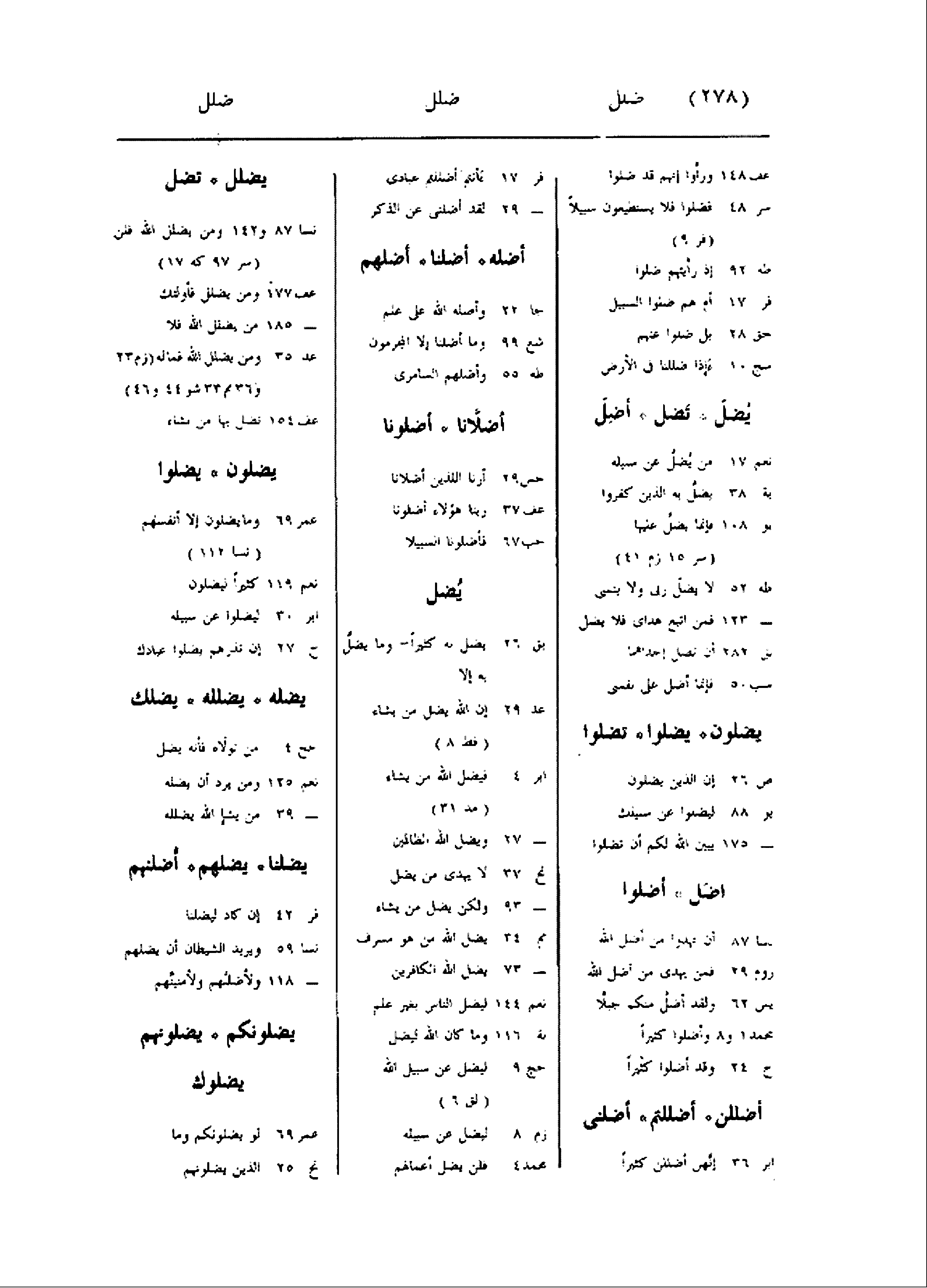 حس 29 أرنا اللذين أضلانا عف 37 ربنا هؤلاء أضلونا حب 67 فأضلونا السبيلا يضل بق 26 يضل به كثيرا- وما يضلّ به إلا عد 29 إن الله يضل من يشاء (فط 8) ابر 4 فيضل الله من يشاء (مد 31) - 27 ويضل الله الظالمين نح 37 لا يهدى من يضل- 93 ولكن يضل من يشاء مم 34 يضل الله من هو مسرف- 73 يضل الله الكافرين نعم 144 ليضل الناس بغير علم بة 116 وما كان الله ليضل حج 9 ليضل عن سبيل الله (لق 6) زم 8 ليضل عن سبيله محمد 4 فلن يضل أعمالهم يضلل تضل نسا 87 و 142 ومن يضلل الله فلن (سر 97 كه 17) عف 177 ومن يضلل فأولئك- 185 من يضلل الله فلا عد 35 ومن يضلل الله فما له (زم 23 و 36 مم 33 شو 44 و 46) عف 154 تضل بها من نشاء يضلون يضلوا عمر 69 وما يضلون إلا أنفسهم (نسا 112) نعم 119 كثيرا ليضلون ابر 30 ليضلوا عن سبيله ح 27 إن تذرهم يضلوا عبادك يضله يضلله يضلك حج 4 من تولّاه فإنه يضل نعم 125 ومن يرد أن يضله- 39 من يشإ الله يضلله يضلنا يضلهم أضلنهم فر 42 إن كاد ليضلنا نسا 59 ويريد الشيطان أن يضلهم- 118 ولأضلنّهم ولأمنينّهم يضلونكم يضلونهم يضلوك عمر 69 لو يضلونكم وما نح 25 الذين يضلونهم