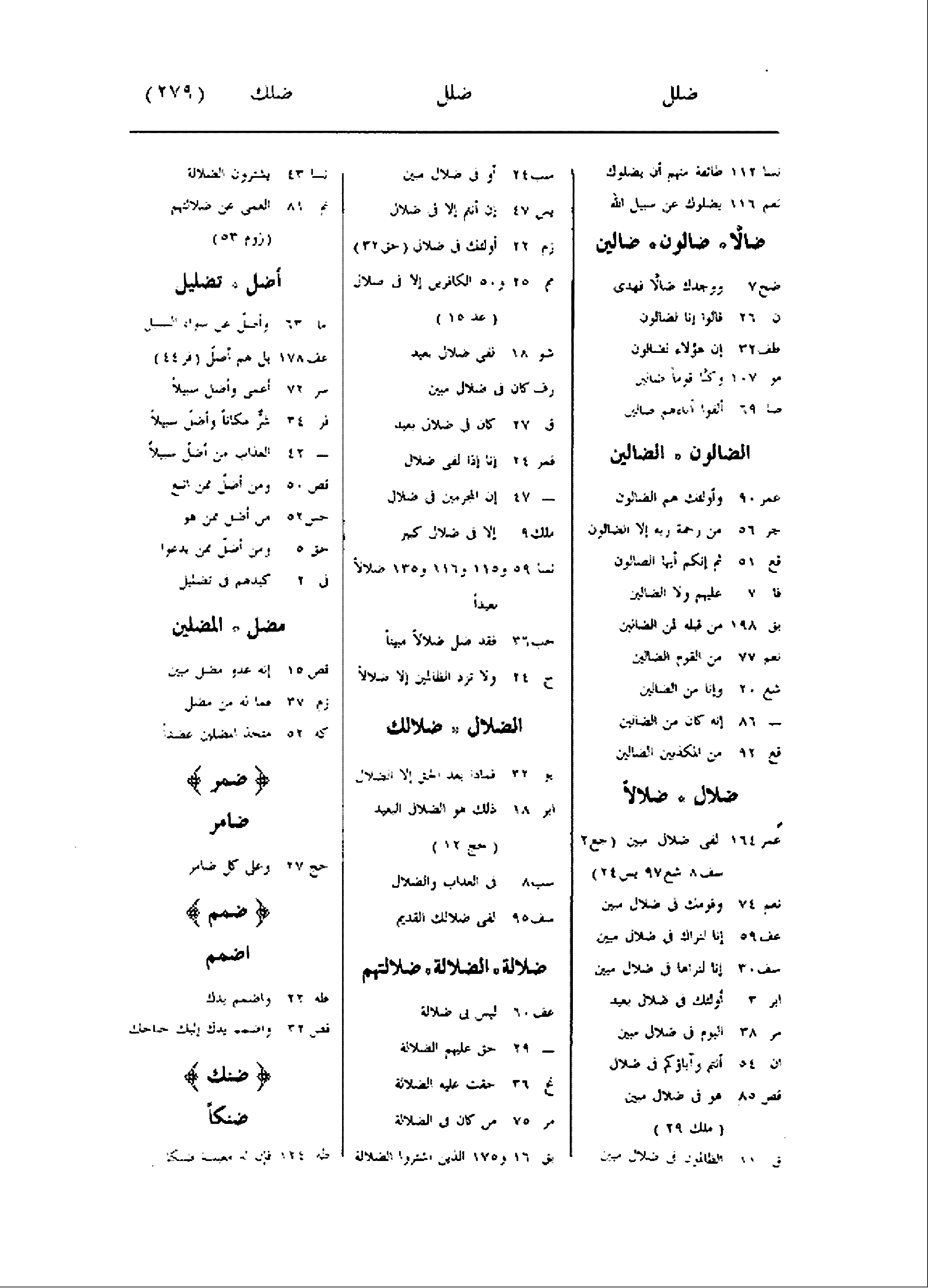 نسا 112 طائفة منهم أن يضلوك نعم 116 يضلوك عن سبيل الله ضالّا ضالون ضالين ضح 7 ووجدك ضالّا فهدى ن 26 قالوا إنا لضالون طف 32 إن هؤلاء لضالون مو 107 وكنّا قوما ضالين صا 69 ألفوا آباءهم ضالين الضالون الضالين عمر 90 وأولئك هم الضالون جر 56 من رحمة ربه إلا الضالون قع 51 ثم إنكم أيها الضالون فا 7 عليهم ولا الضالين بق 198 من قبله لمن الضالين نعم 77 من القوم الضالين شع 20 وإنا من الضالين- 86 إنه كان من الضالين قع 92 من المكذبين الضالين ضلال ضلالا عمر 164 لفى ضلال مبين (جع 2 سف 8 شع 97 يس 24) نعم 74 وقومك فى ضلال مبين عف 59 إنا لنراك فى ضلال مبين سف 30 إنا لنراها فى ضلال مبين ابر 3 أولئك فى ضلال بعيد مر 38 اليوم فى ضلال مبين ان 54 أنتم وآباؤكم فى ضلال قص 85 هو فى ضلال مبين (ملك 29) ق 11 الظالمون فى ضلال مبين سب 24 أو فى ضلال مبين يس 47 إن أنتم إلا فى ضلال زم 22 أولئك فى ضلال (حق 32) مم 25 و 50 الكافرين إلا فى ضلال (عد 15) شو 18 لفى ضلال بعيد رف كان فى ضلال مبين ق 27 كان فى ضلال بعيد قمر 24 إنا إذا لفى ضلال- 47 إن المجرمين فى ضلال ملك 9 إلا فى ضلال كبير نسا 59 و 115 و 116 و 135 ضلالا بعيدا حب 36 فقد ضل ضلالا مبينا ح 24 ولا تزد الظالمين إلا ضلالا الضلال ضلالك يو 32فماذا بعد الحق إلا الضلال ابر 18 ذلك هو الضلال البعيد (حج 12) سب 8 فى العذاب والضلال سف 95 لفى ضلالك القديم ضلالة الضلالة ضلالتهم عف 60 ليس بى ضلالة- 29 حق عليهم الضلالة نح 36 حقت عليه الضلالة مر 75 من كان فى الضلالة بق 16 و 175 الذين اشتروا الضلالة نسا 43 يشترون الضلالة نم 81 العمى عن ضلالتهم (روم 53) أضل تضليل ما 63 وأضلّ عن سواء السبيل عف 178 بل هم أضلّ (فر 44) سر 72 أعمى وأضل سبيلا فر 34 شرّ مكانا وأضلّ سبيلا- 42 العذاب من أضلّ سبيلا قص 50 ومن أضلّ ممن اتبع حس 52 من أضل ممن هو حق 5 ومن أضلّ ممن يدعوا فى 2 كيدهم فى تضليل مضل المضلين قص 15 إنه عدو مضل مبين زم 37 فما له من مضل كه 52 متخذ المضلين عضدا ضمر ضامر حج 27 وعلى كل ضامر ضمم اضمم طه 22 واضمم يدك قص 32 واضمم يدك إليك جناحك ضنك ضنكا طه 124 فإن له معيشة ضنكا
