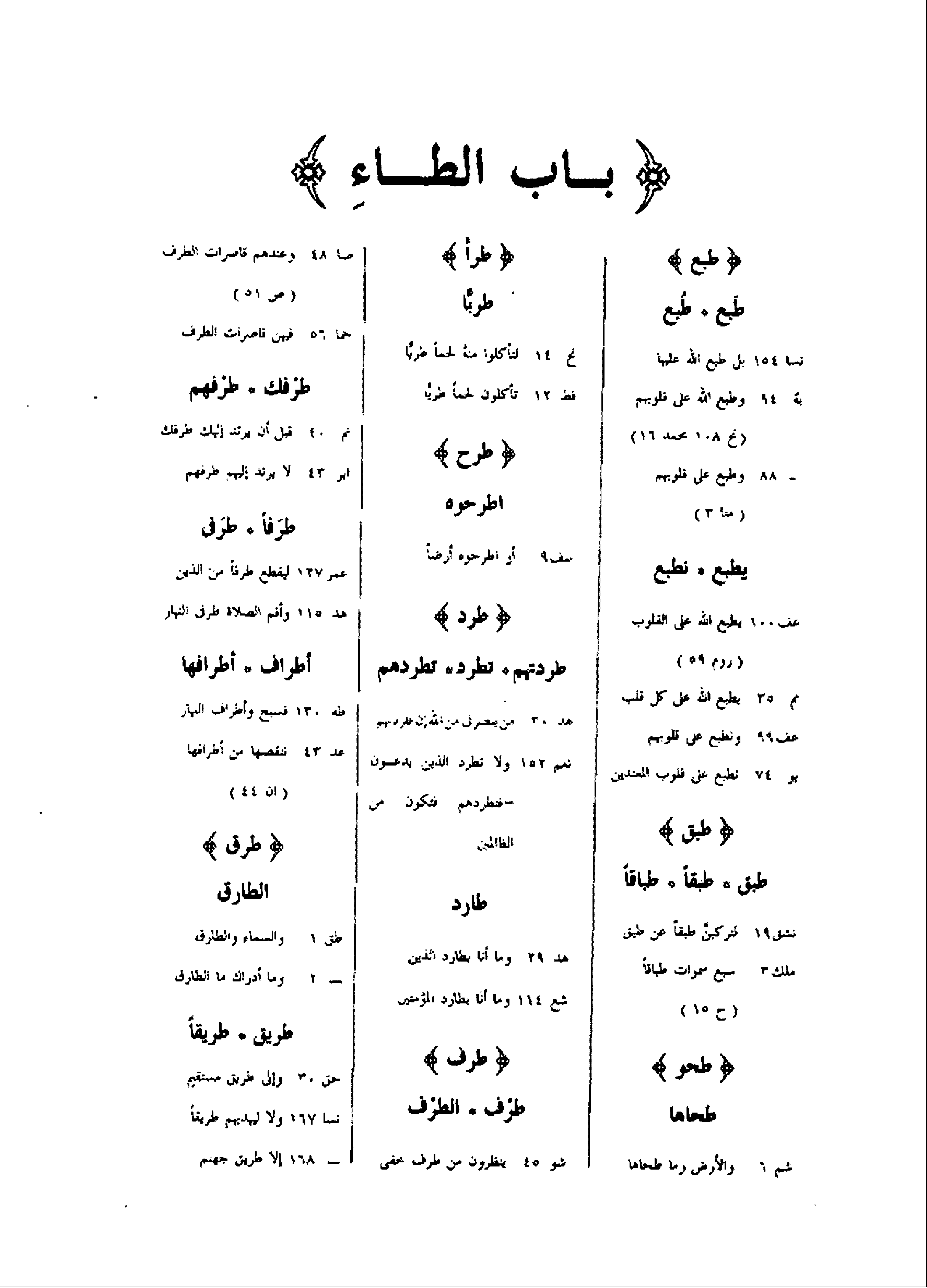 طبع طبع طبع نسا 154 بل طبع الله عليها بة 94 وطبع الله على قلوبهم (نح 108 محمد 16) - 88 وطبع على قلوبهم (منا 3) يطبع نطبع عف 100 يطبع الله على القلوب (روم 59) مم 35 يطبع الله على كل قلب عف 99 ونطبع على قلوبهم يو 74 نطبع على قلوب المعتدين طبق طبق طبقا طباقا نشق 19 لتركبنّ طبقا عن طبق ملك 3 سبع سموات طباقا (ح 15) طحو طحاها شم 6 والأرض وما طحاها طرأ طربّا نح 14 لتأكلوا منه لحما طريّا فط 12 تأكلون لحما طريّا طرح اطرحوه سف 9 أو اطرحوه أرضا طرد طردتهم تطرد تطردهم هد 30 من ينصرنى من الله إن طردتهم نعم 152 ولا تطرد الذين يدعون- فتطردهم فتكون من الظالمين طارد هد 29 وما أنا بطارد الذين شع 114 وما أنا بطارد المؤمنين طرف طرف الطرف شو 45 ينظرون من طرف خفى صا 48 وعندهم قاصرات الطرف (ص 51) حما 56 فيهن قاصرات الطرف طرفك طرفهم نم 40 قبل أن يرتد إليك طرفك ابر 43 لا يرتد إليهم طرفهم طرفا طرفى عمر 127 ليقطع طرفا من الذين هد 115 وأقم الصلاة طرفى النهار أطراف أطرافها طه 130 فسبح وأطراف النهار عد 43 ننقصها من أطرافها (ان 44) طرق الطارق طق 1 والسماء والطارق- 2 وما أدراك ما الطارق طريق طريقا حق 30 وإلى طريق مستقيم نسا 167 ولا ليهديهم طريقا- 168 إلا طريق جهنم