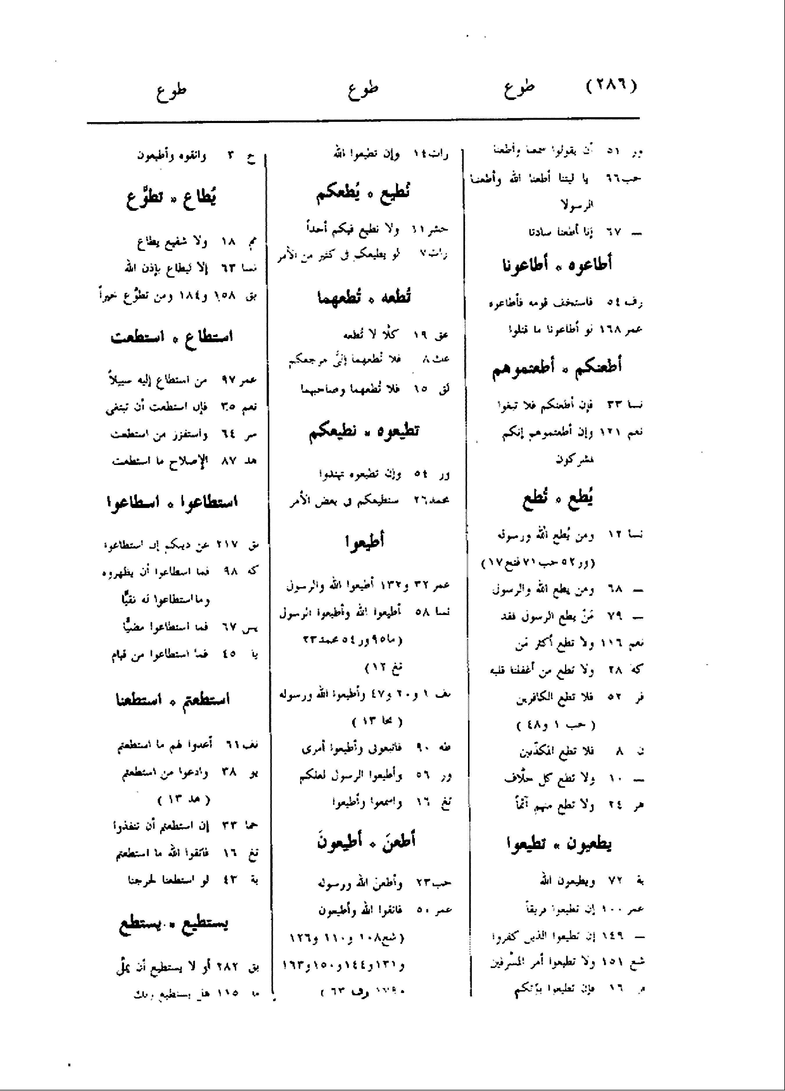 28 ولا تطع من أغفلنا قلبه فر 52 فلا تطع الكافرين (حب 1 و 48) ن 8 فلا تطع المكذّبين- 10 ولا تطع كل حلّاف هر 24 ولا تطع منهم آثما يطعيون تطيعوا بة 72 ويطيعون الله عمر 100 إن تطيعوا فريقا- 149 إن تطيعوا الذين كفروا شع 151 ولا تطيعوا أمر المسرفين فر 16 فإن تطيعوا يؤتكم رات 14 وإن تطيعوا الله نطيع يطعكم حشر 11 ولا نطيع فيكم أحدا رات 7 لو يطيعكم فى كثير من الأمر تطعه تطعهما عق 19 كلّا لا تطعه عك 8 فلا تطعهما إلىّ مرجعكم لق 15 فلا تطعهما وصاحبهما تطيعوه نطيعكم ور 54 وإن تطيعوه تهتدوا محمد 26 سنطيعكم فى بعض الأمر أطيعوا عمر 32 و 132 أطيعوا الله والرسول نسا 58 أطيعوا الله وأطيعوا الرسول (ما 95 ور 54 محمد 23 تغ 12) نف 1 و 20 و 47 وأطيعوا الله ورسوله (مجا 13) طه 90 فاتبعونى وأطيعوا أمرى ور 56 وأطيعوا الرسول لعلكم تغ 16 واسمعوا وأطيعوا أطعن أطيعون حب 23 وأطعن الله ورسوله عمر 50 فاتقوا الله وأطيعون (شع 108 و 110 و 126 و 131 و 144 و 150 و 163 1790 رف 63) ح 3 واتقوه وأطيعون يطاع تطوّع مم 18 ولا شفيع يطاع نسا 63 إلا ليطاع بإذن الله بق 158 و 184 ومن تطوّع خيرا استطاع استطعت عمر 97 من استطاع إليه سبيلا نعم 35 فإن استطعت أن تبتغى سر 64 واستفزز من استطعت هد 87 الإصلاح ما استطعت استطاعوا اسطاعوا بق 217 عن دينكم إن استطاعوا كه 98 فما اسطاعوا أن يظهروه وما استطاعوا له نقيّا يس 67 فما استطاعوا مضيّا يا 45 فما استطاعوا من قيام استطعتم استطعنا نف 61 أعدوا لهم ما استطعتم يو 38 وادعوا من استطعتم (هد 13) حما 33 إن استطعتم أن تنفذوا تغ 16 فاتقوا الله ما استطعتم بة 43 لو استطعنا لخرجنا يستطيع يستطع بق 282 أو لا يستطيع أن يملّ ما 115 هل يستطيع ربك