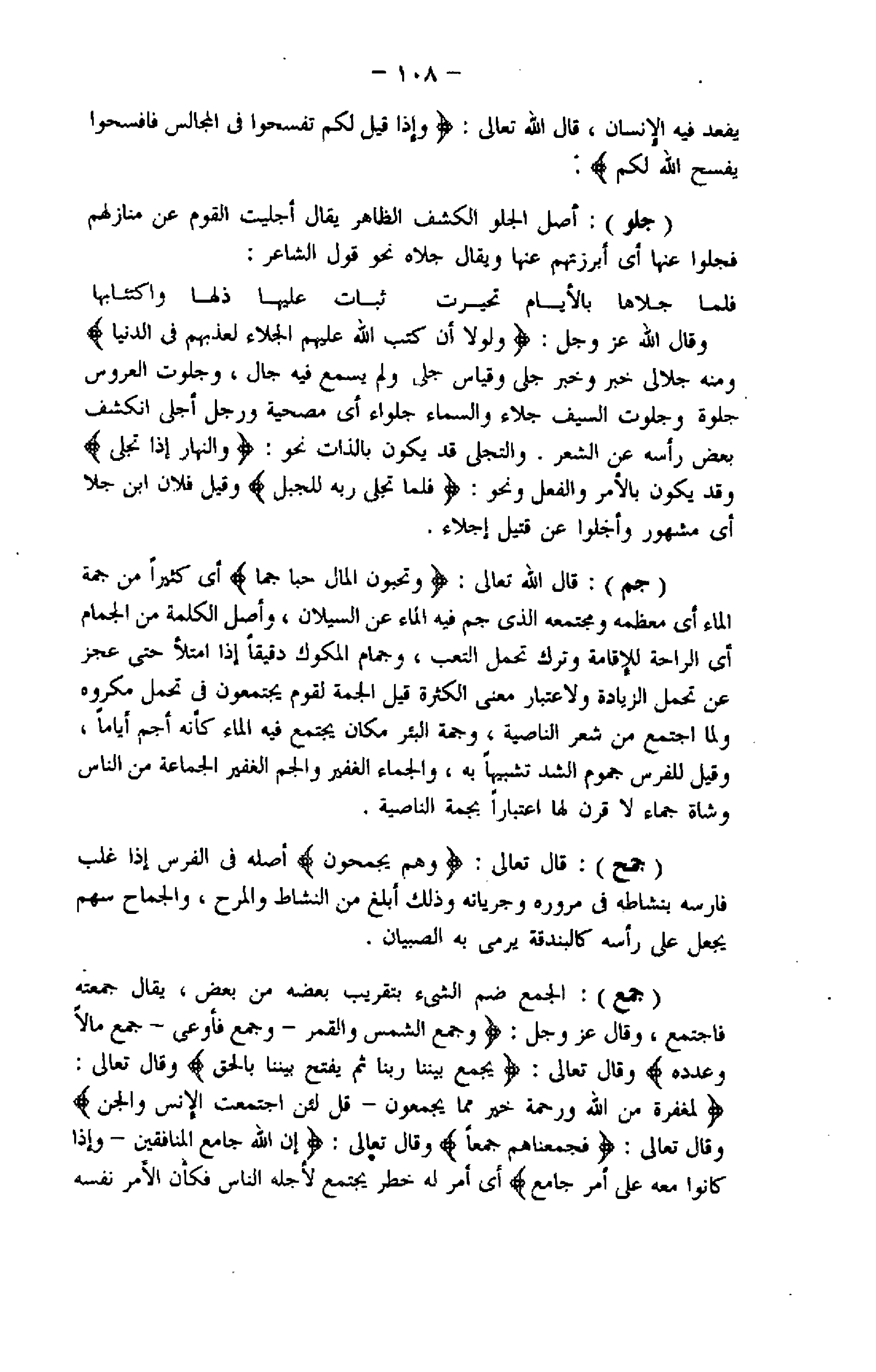 (جمع) : الجمع ضم الشيء بتقريب بعضه من بعض، يقال جمعته فاجتمع، وقال عزّ وجلّ: وَجُمِعَ الشَّمْسُ وَالْقَمَرُ- وَجَمَعَ فَأَوْعى - جَمَعَ مالًا وَعَدَّدَهُ وقال تعالى: يَجْمَعُ بَيْنَنا رَبُّنا ثُمَّ يَفْتَحُ بَيْنَنا بِالْحَقِّ وقال تعالى:
