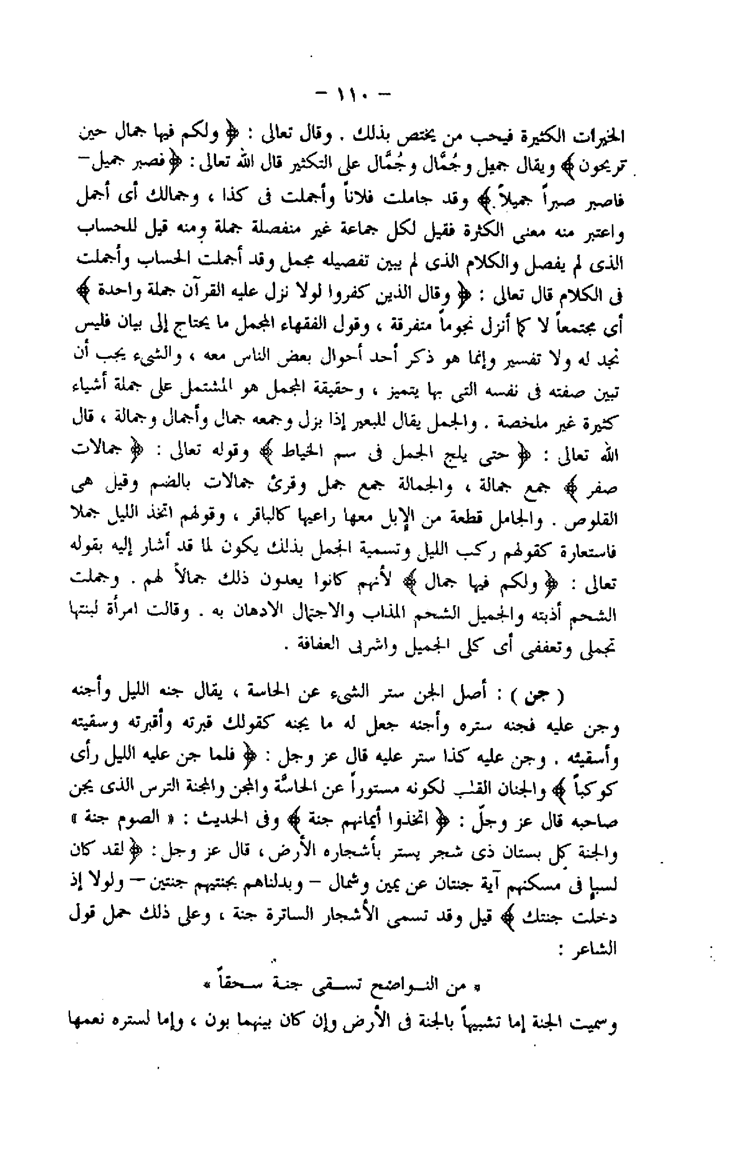 الخيرات الكثيرة فيحب من يختص بذلك. وقال تعالى: وَلَكُمْ فِيها جَمالٌ حِينَ تُرِيحُونَ ويقال جميل وجمّال وجمّال على التكثير قال اللَّه تعالى: فَصَبْرٌ جَمِيلٌ- فَاصْبِرْ صَبْراً جَمِيلًا وقد جاملت فلانا وأجملت فى كذا، وجمالك أي أجمل واعتبر منه معنى الكثرة فقيل لكل جماعة غير منفصلة جملة ومنه قيل للحساب الذي لم يفصل والكلام الذي لم يبين تفصيله مجمل وقد أجملت الحساب وأجملت فى الكلام قال تعالى: وَقالَ الَّذِينَ كَفَرُوا لَوْلا نُزِّلَ عَلَيْهِ الْقُرْآنُ جُمْلَةً واحِدَةً أي مجتمعا لا كما أنزل نجوما متفرقة، وقول الفقهاء المجمل ما يحتاج إلى بيان فليس نجد له ولا تفسير وإنما هو ذكر أحد أحوال بعض الناس معه، والشيء يجب أن تبين صفته فى نفسه التي بها يتميز، وحقيقة المجمل هو المشتمل على جملة أشياء كثيرة غير ملخصة. والجمل يقال للبعير إذا بزل وجمعه جمال وأجمال وجمالة، قال اللَّه تعالى: حَتَّى يَلِجَ الْجَمَلُ فِي سَمِّ الْخِياطِ وقوله تعالى: جِمالَتٌ صُفْرٌ جمع جمالة، والجمالة جمع جمل وقرىء جمالات بالضم وقيل هى القلوص. والجامل قطعة من الإبل معها راعيها كالباقر، وقولهم اتخذ الليل جملا فاستعارة كقولهم ركب الليل وتسمية الجمل بذلك يكون لما قد أشار إليه بقوله تعالى: وَلَكُمْ فِيها جَمالٌ لأنهم كانوا يعدون ذلك جمالا لهم. وجملت الشحم أذبته والجميل الشحم المذاب والاجتمال الادهان به. وقالت امرأة لبنتها تجملى وتعففى أي كلى الجميل واشربى العفافة.