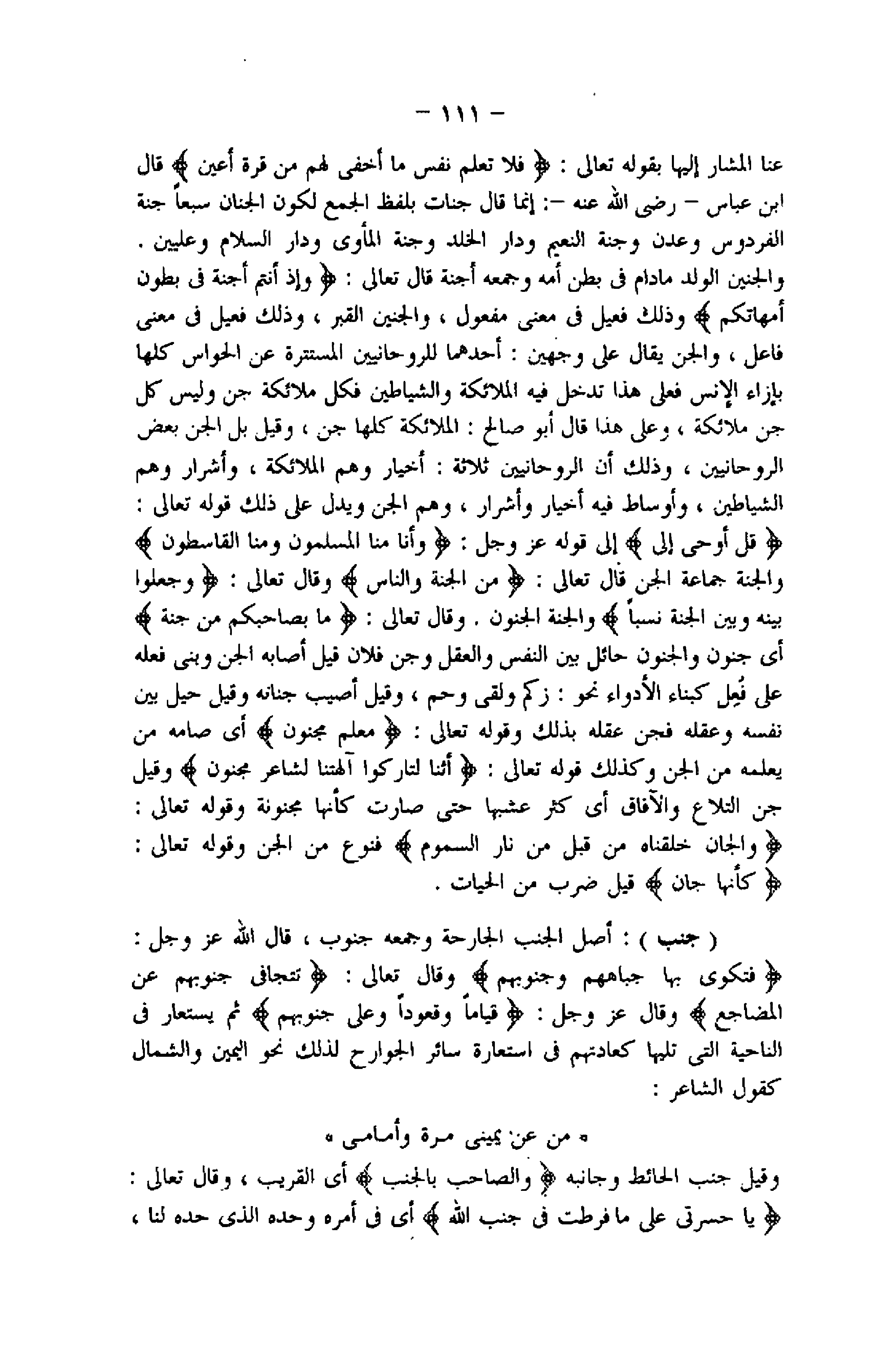 قُلْ أُوحِيَ إِلَيَّ إلى قوله عزّ وجلّ: وَأَنَّا مِنَّا الْمُسْلِمُونَ وَمِنَّا الْقاسِطُونَ والجنة جماعة الجن قال تعالى: مِنَ الْجِنَّةِ وَالنَّاسِ وقال تعالى: وَجَعَلُوا بَيْنَهُ وَبَيْنَ الْجِنَّةِ نَسَباً والجنة الجنون. وقال تعالى: ما بِصاحِبِكُمْ مِنْ جِنَّةٍ أي جنون والجنون حائل بين النفس والعقل وجن فلان قيل أصابه الجن وبنى فعله على فعل كبناء الأدواء نحو: زكم ولقى وحم، وقيل أصيب جنانه وقيل حيل بين نفسه وعقله فجن عقله بذلك وقوله تعالى: مُعَلَّمٌ مَجْنُونٌ أي صامه من يعلمه من الجن وكذلك قوله تعالى: أَإِنَّا لَتارِكُوا آلِهَتِنا لِشاعِرٍ مَجْنُونٍ وقيل جن التلاع والآفاق أي كثر عشبها حتى صارت كأنها مجنونة وقوله تعالى: