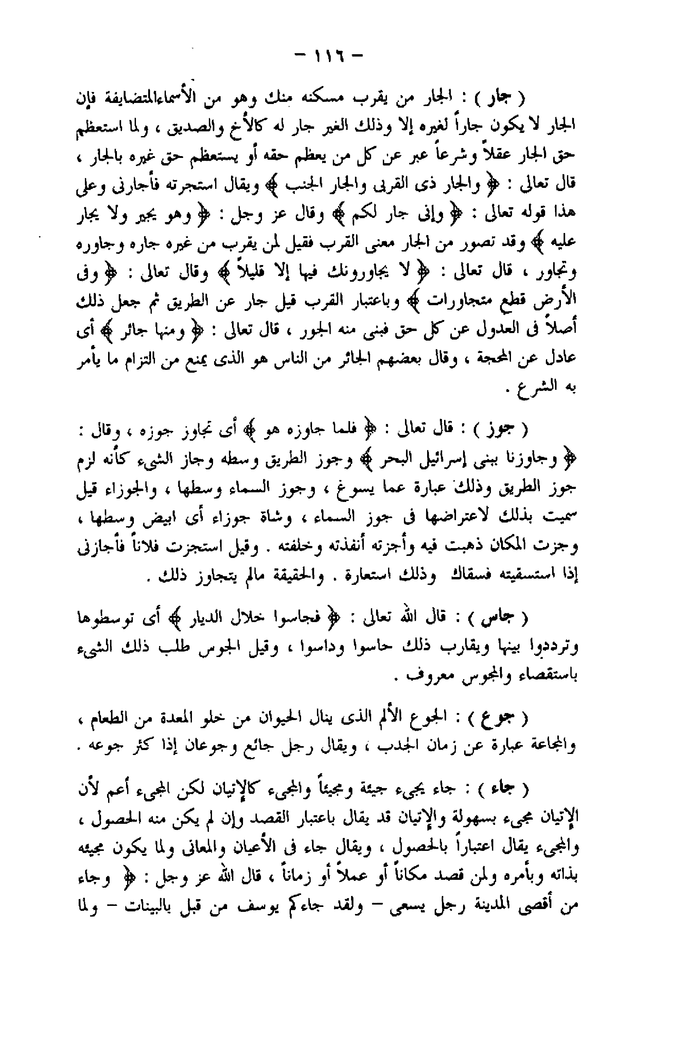 (جار) : الجار من يقرب مسكنه منك وهو من الأسماء المتضايفة فإن الجار لا يكون جارا لغيره إلا وذلك الغير جار له كالأخ والصديق، ولما استعظم حق الجار عقلا وشرعا عبر عن كل من يعظم حقه أو يستعظم حق غيره بالجار، قال تعالى: وَالْجارِ ذِي الْقُرْبى وَالْجارِ الْجُنُبِ ويقال استجرته فأجارنى وعلى هذا قوله تعالى: وَإِنِّي جارٌ لَكُمْ وقال عزّ وجلّ: وَهُوَ يُجِيرُ وَلا يُجارُ عَلَيْهِ وقد تصور من الجار معنى القرب فقيل لمن يقرب من غيره جاره وجاوره وتجاور، قال تعالى: لا يُجاوِرُونَكَ فِيها إِلَّا قَلِيلًا وقال تعالى: وَفِي الْأَرْضِ قِطَعٌ مُتَجاوِراتٌ وباعتبار القرب قيل جار عن الطريق ثم جعل ذلك أصلا فى العدول عن كل حق فبنى منه الجور، قال تعالى: وَمِنْها جائِرٌ أي عادل عن المحجة، وقال بعضهم الجائر من الناس هو الذي يمنع من التزام ما يأمر به الشرع.
