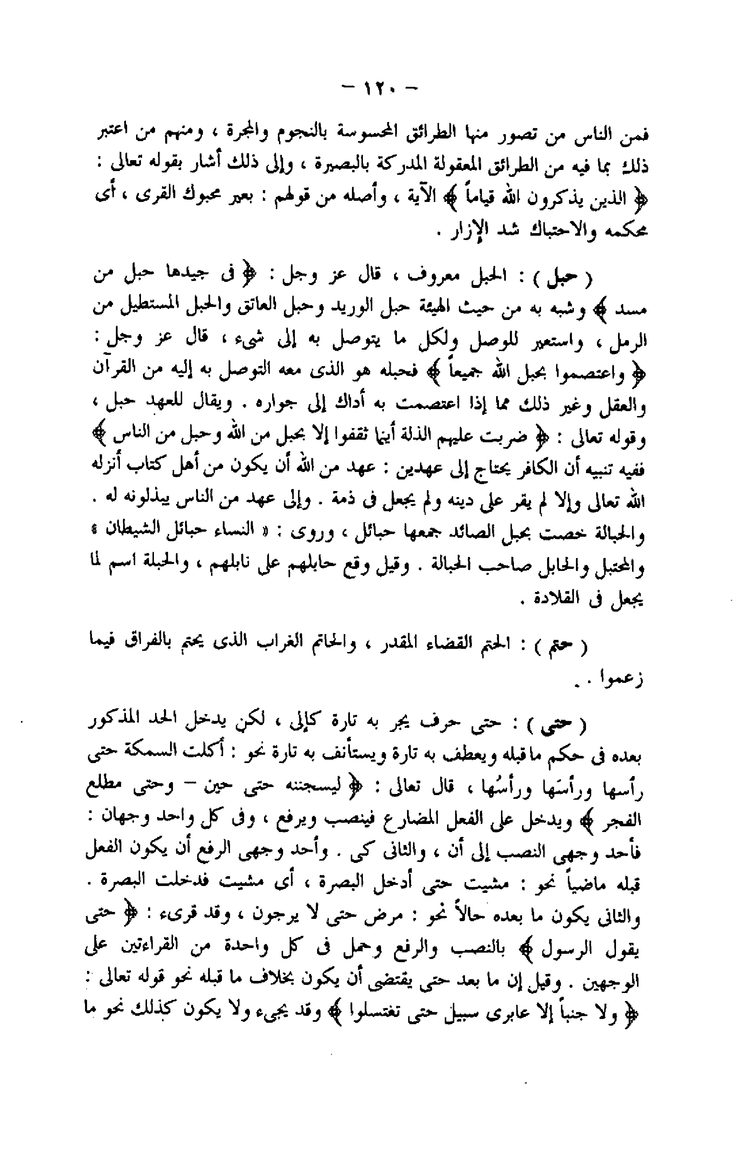 (حبل) : الحبل معروف، قال عزّ وجلّ: فِي جِيدِها حَبْلٌ مِنْ مَسَدٍ وشبه به من حيث الهيئة حبل الوريد وحبل العاتق والحبل المستطيل من الرمل، واستعير للوصل ولكل ما يتوصل به إلى شىء، قال عزّ وجلّ: