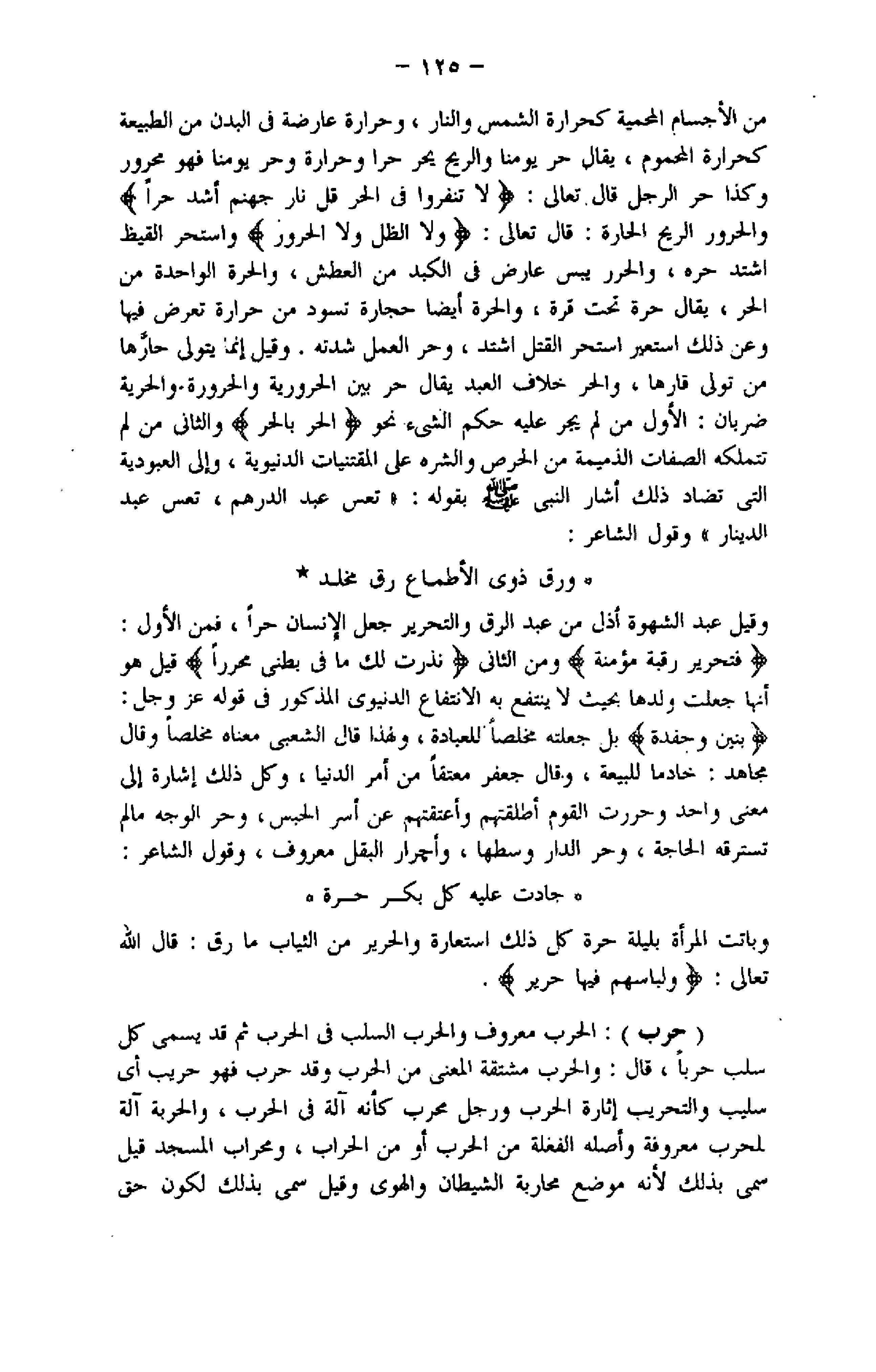 من الأجسام المحمية كحرارة الشمس والنار، وحرارة عارضة فى البدن من الطبيعة كحرارة المحموم، يقال حر يومنا والريح يحر حرا وحرارة وحر يومنا فهو محرور وكذا حر الرجل قال تعالى: لا تَنْفِرُوا فِي الْحَرِّ قُلْ نارُ جَهَنَّمَ أَشَدُّ حَرًّا والحرور الريح الحارة: قال تعالى: وَلَا الظِّلُّ وَلَا الْحَرُورُ واستحر القيظ اشتد حره، والحرر يبس عارض فى الكبد من العطش، والحرة الواحدة من الحر، يقال حرة تحت قرة، والحرة أيضا حجارة تسود من حرارة تعرض فيها وعن ذلك استعير استحر القتل اشتد، وحر العمل شدته. وقيل إنما يتولى حارّها من تولى قارها، والحر خلاف العبد يقال حر بين الحرورية والحرورة. والحرية ضربان: الأول من لم يجر عليه حكم الشيء نحو الْحُرُّ بِالْحُرِّ والثاني من لم تتملكه الصفات الذميمة من الحرص والشره على المقتضيات الدنيوية، وإلى العبودية التي تضاد ذلك
