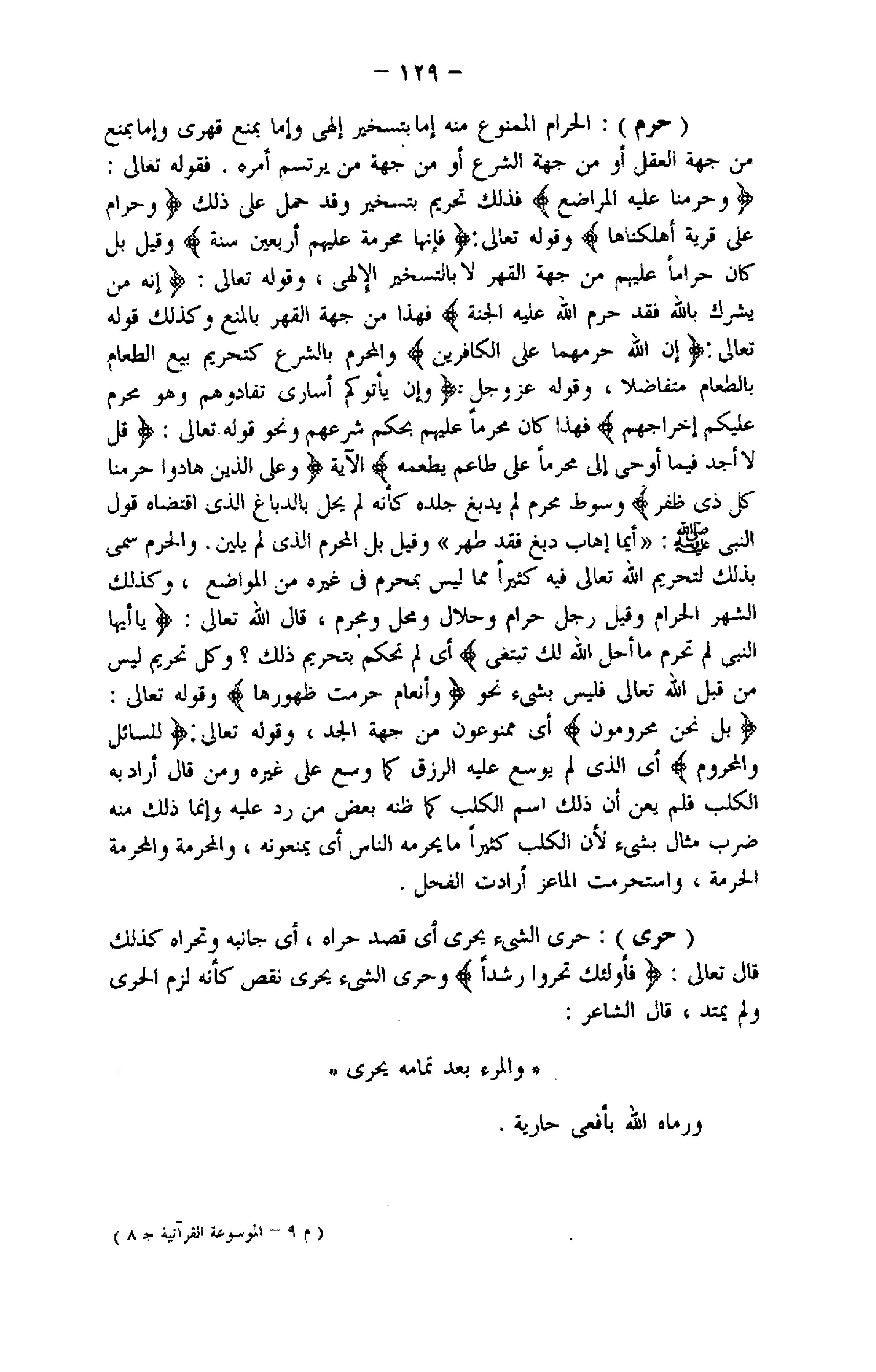 (حرى) : حرى الشيء يحرى أي قصد حراه، أي جانبه وتحراه كذلك قال تعالى: فَأُولئِكَ تَحَرَّوْا رَشَداً وحرى الشيء يحرى نقص كأنه لزم الحرى ولم يمتد، قال الشاعر: