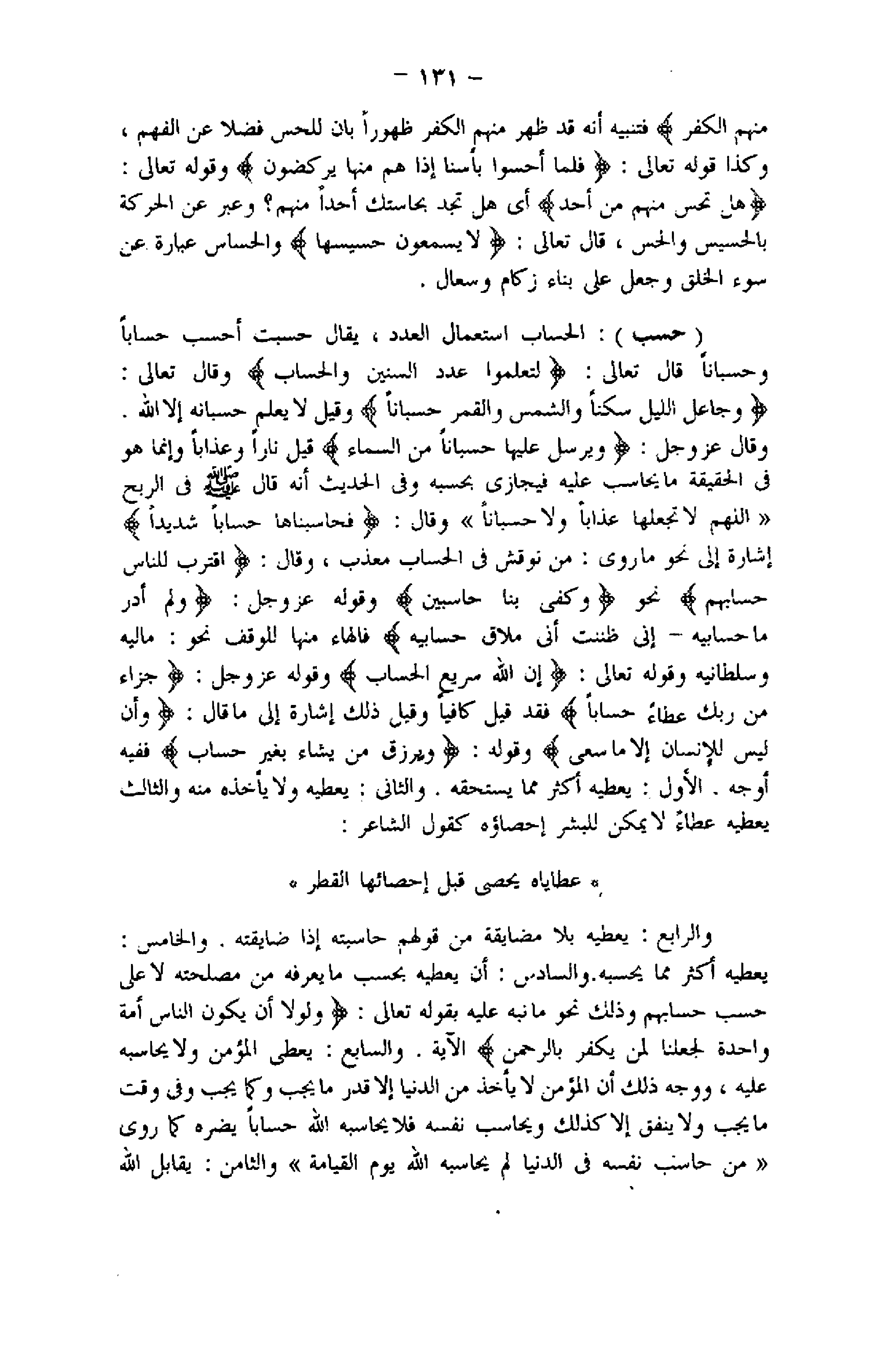وقال: فَحاسَبْناها حِساباً شَدِيداً إشارة إلى نحو ما روى: من نوقش فى الحساب معذب، وقال: اقْتَرَبَ لِلنَّاسِ حِسابُهُمْ نحو وَكَفى بِنا حاسِبِينَ وقوله عزّ وجلّ: وَلَمْ أَدْرِ ما حِسابِيَهْ- إِنِّي ظَنَنْتُ أَنِّي مُلاقٍ حِسابِيَهْ فالهاء منها للوقف نحو: ماليه وسلطانيه وقوله تعالى: فَإِنَّ اللَّهَ سَرِيعُ الْحِسابِ وقوله عزّ وجلّ: جَزاءً مِنْ رَبِّكَ عَطاءً حِساباً فقد قيل كافيا وقيل ذلك إشارة إلى ما قال: وَأَنْ لَيْسَ لِلْإِنْسانِ إِلَّا ما سَعى وقوله: يَرْزُقُ مَنْ يَشاءُ بِغَيْرِ حِسابٍ ففيه أوجه. الأول: يعطيه أكثر مما يستحقه. والثاني: يعطيه ولا يأخذه منه والثالث يعطيه عطاء لا يمكن للبشر إحصاؤه كقول الشاعر: