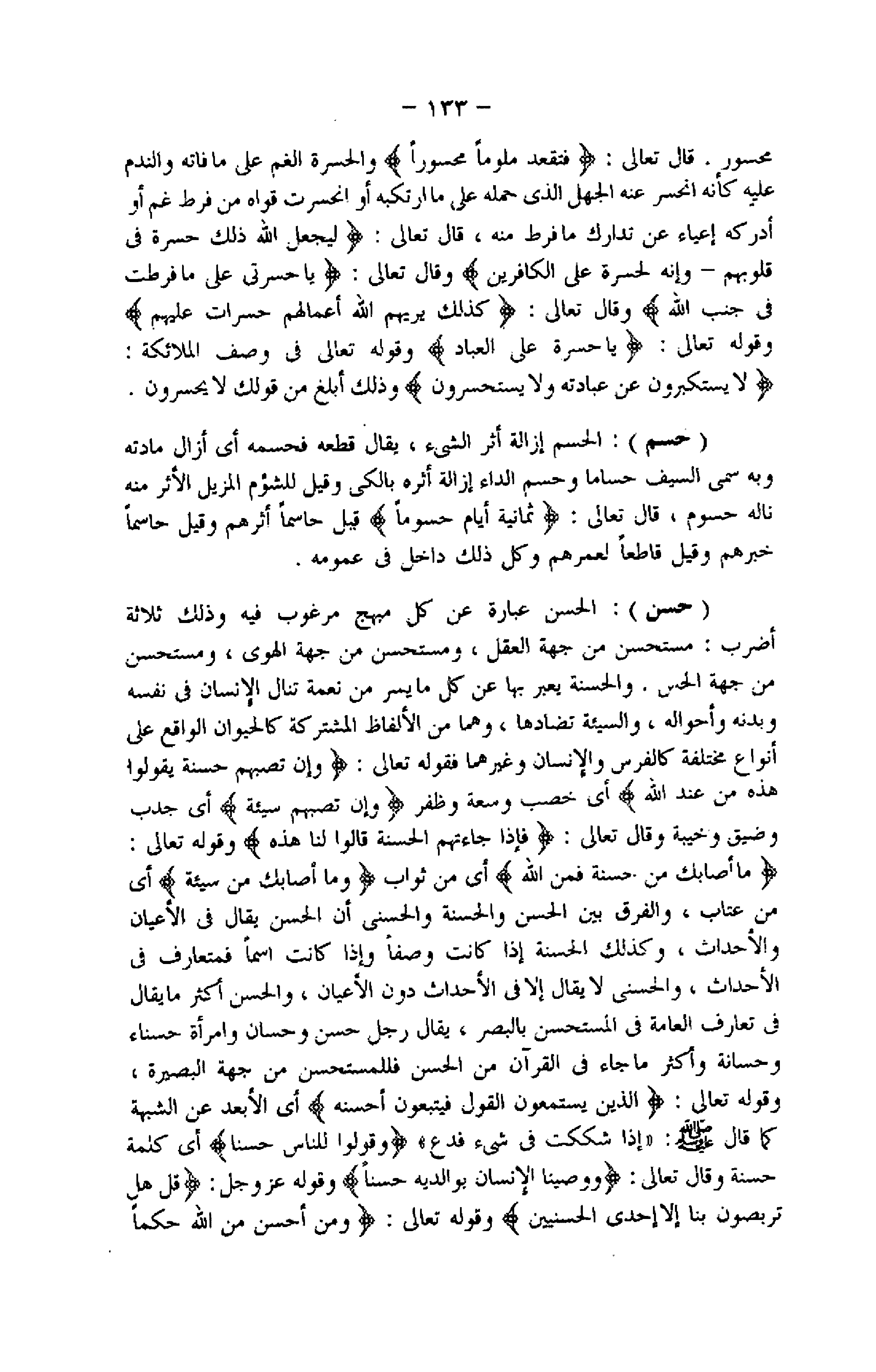 محسور. قال تعالى: فَتَقْعُدَ مَلُوماً مَحْسُوراً والحسرة الغم على ما فاته والندم عليه كأنه انحسر عنه الجهل الذي حمله على ما ارتكبه أو انحسرت قواه من فرط غم أو أدركه إعياء عن تدارك ما فرط منه، قال تعالى: لِيَجْعَلَ اللَّهُ ذلِكَ حَسْرَةً فِي قُلُوبِهِمْ- وَإِنَّهُ لَحَسْرَةٌ عَلَى الْكافِرِينَ وقال تعالى: يا حَسْرَتى عَلى ما فَرَّطْتُ فِي جَنْبِ اللَّهِ وقال تعالى: كَذلِكَ يُرِيهِمُ اللَّهُ أَعْمالَهُمْ حَسَراتٍ عَلَيْهِمْ وقوله تعالى: يا حَسْرَةً عَلَى الْعِبادِ وقوله تعالى فى وصف الملائكة: