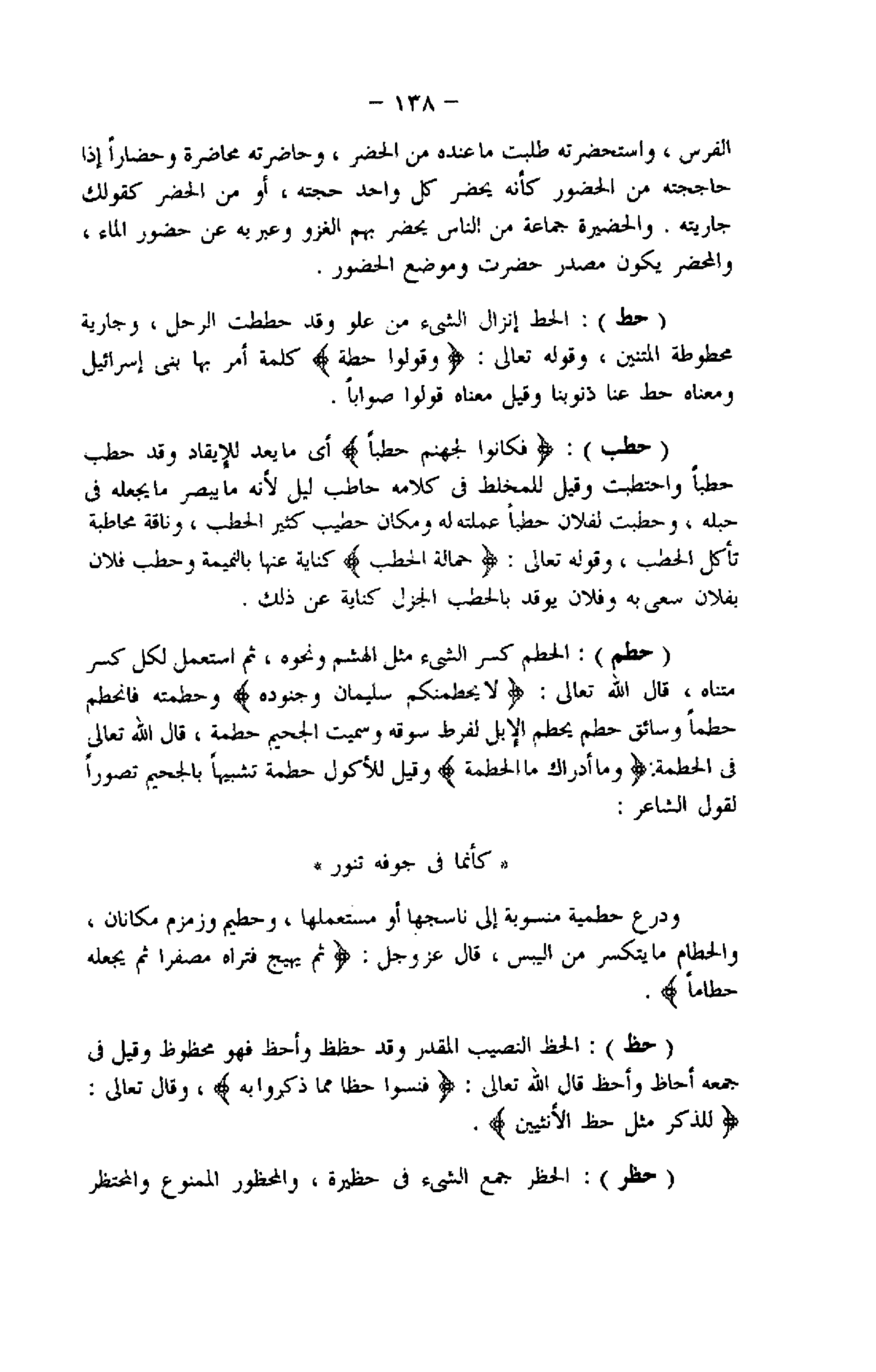 الفرس، واستحضرته طلبت ما عنده من الحضر، وحاضرته محاضرة وحضارا إذا حاججته من الحضور كأنه يحضر كل واحد حجته، أو من الحضر كقولك جاريته. والحضيرة جماعة من الناس يحضر بهم الغزو وعبربه عن حضور الماء، والمحضر يكون مصدر حضرت وموضع الحضور.