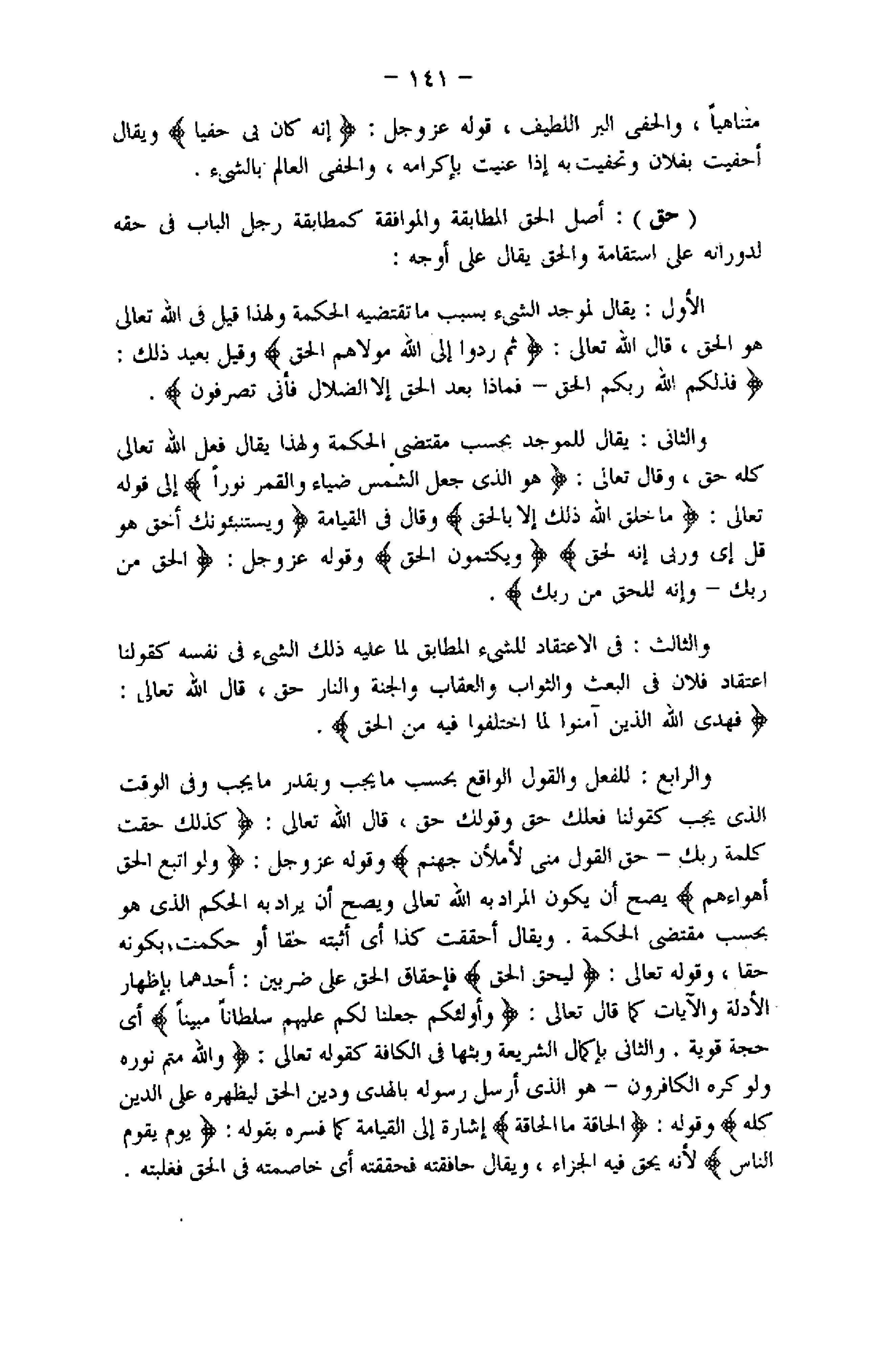 والرابع: للفعل والقول الواقع بحسب ما يجب وبقدر ما يجب وفى الوقت الذي يجب كقولنا فعلك حق وقولك حق، قال اللَّه تعالى: كَذلِكَ حَقَّتْ كَلِمَةُ رَبِّكَ- حَقَّ الْقَوْلُ مِنِّي لَأَمْلَأَنَّ جَهَنَّمَ
