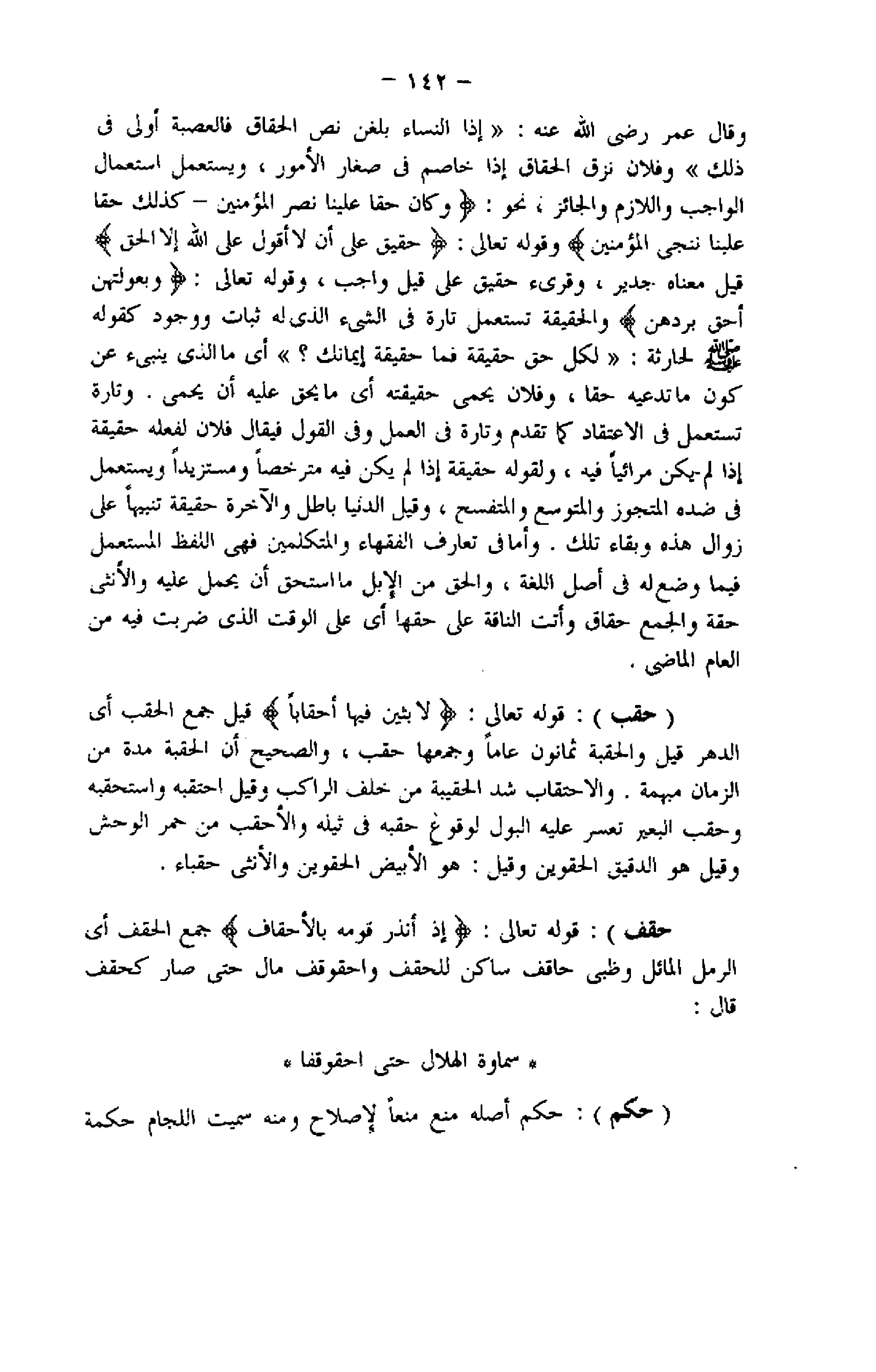 أي ما الذي ينبىء عن كون ما تدعيه حقا، وفلان يحمى حقيقته أي ما يحق عليه أن يحمى. وتارة تستعمل فى الاعتقاد كما تقدم وتارة فى العمل وفى القول فيقال فلان لفعله حقيقة إذا لم يكن مرائيا فيه، ولقوله حقيقة إذا لم يكن فيه مترخصا ومستزيدا ويستعمل فى ضده المتجوز والمتوسع والمتفسح، وقيل الدنيا باطل والآخرة حقيقة تنبيها على زوال هذه وبقاء تلك. وأما فى تعارف الفقهاء والمتكلمين فهى اللفظ المستعمل فيما وضع له فى أصل اللغة، والحق من الإبل ما استحق أن يحمل عليه والأنثى حقة والجمع حقاق وأتت الناقة على حقها أي على الوقت الذي ضربت فيه من العام الماضي.