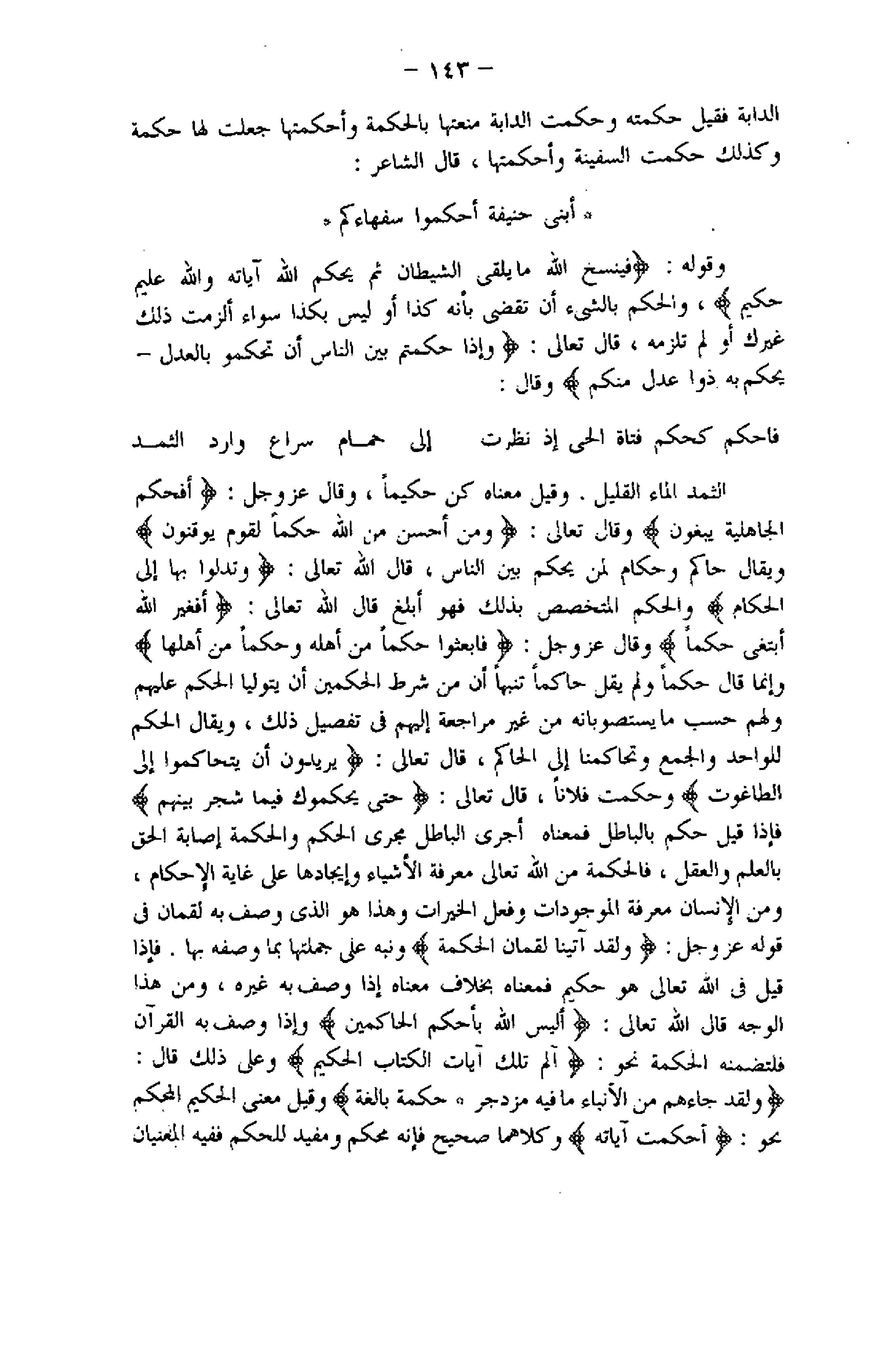 الثمد الماء القليل. وقيل معناه كن حكيما، وقال عز وجل: أَفَحُكْمَ الْجاهِلِيَّةِ يَبْغُونَ وقال تعالى: وَمَنْ أَحْسَنُ مِنَ اللَّهِ حُكْماً لِقَوْمٍ يُوقِنُونَ ويقال حاكم وحكام لمن يحكم بين الناس، قال اللَّه تعالى: وَتُدْلُوا بِها إِلَى الْحُكَّامِ والحكم المتخصص بذلك فهو أبلغ قال اللَّه تعالى: أَفَغَيْرَ اللَّهِ أَبْتَغِي حَكَماً وقال عز وجل: فَابْعَثُوا حَكَماً مِنْ أَهْلِهِ وَحَكَماً مِنْ أَهْلِها وإنما قال حكما ولم يقل حاكما تنبها أن من شرط الحكمين أن يتوليا الحكم عليهم ولهم حسب ما يستصوبانه من غير مراجعة إليهم فى تفصيل ذلك، ويقال الحكم للواحد والجمع وتحاكمنا إلى الحاكم، قال تعالى: يُرِيدُونَ أَنْ يَتَحاكَمُوا إِلَى الطَّاغُوتِ وحكمت فلانا، قال تعالى: حَتَّى يُحَكِّمُوكَ فِيما شَجَرَ بَيْنَهُمْ فإذا قيل حكم بالباطل فمعناه أجرى الباطل مجرى الحكم والحكمة إصابة الحق بالعلم والعقل، فالحكمة من اللَّه تعالى معرفة الأشياء وإيجادها على غاية الإحكام، ومن الإنسان معرفة الموجودات وفعل الخيرات وهذا هو الذي وصف به لقمان فى قوله عز وجل: وَلَقَدْ آتَيْنا لُقْمانَ الْحِكْمَةَ ونبه على جملتها بما وصفه بها. فإذا قيل فى اللَّه تعالى هو حكيم فمعناه بخلاف معناه إذا وصف به غيره، ومن هذا الوجه قال اللَّه تعالى: أَلَيْسَ اللَّهُ بِأَحْكَمِ الْحاكِمِينَ وإذا وصف به القرآن فلتضمنه الحكمة نحو: الم تِلْكَ آياتُ الْكِتابِ الْحَكِيمِ وعلى ذلك قال: