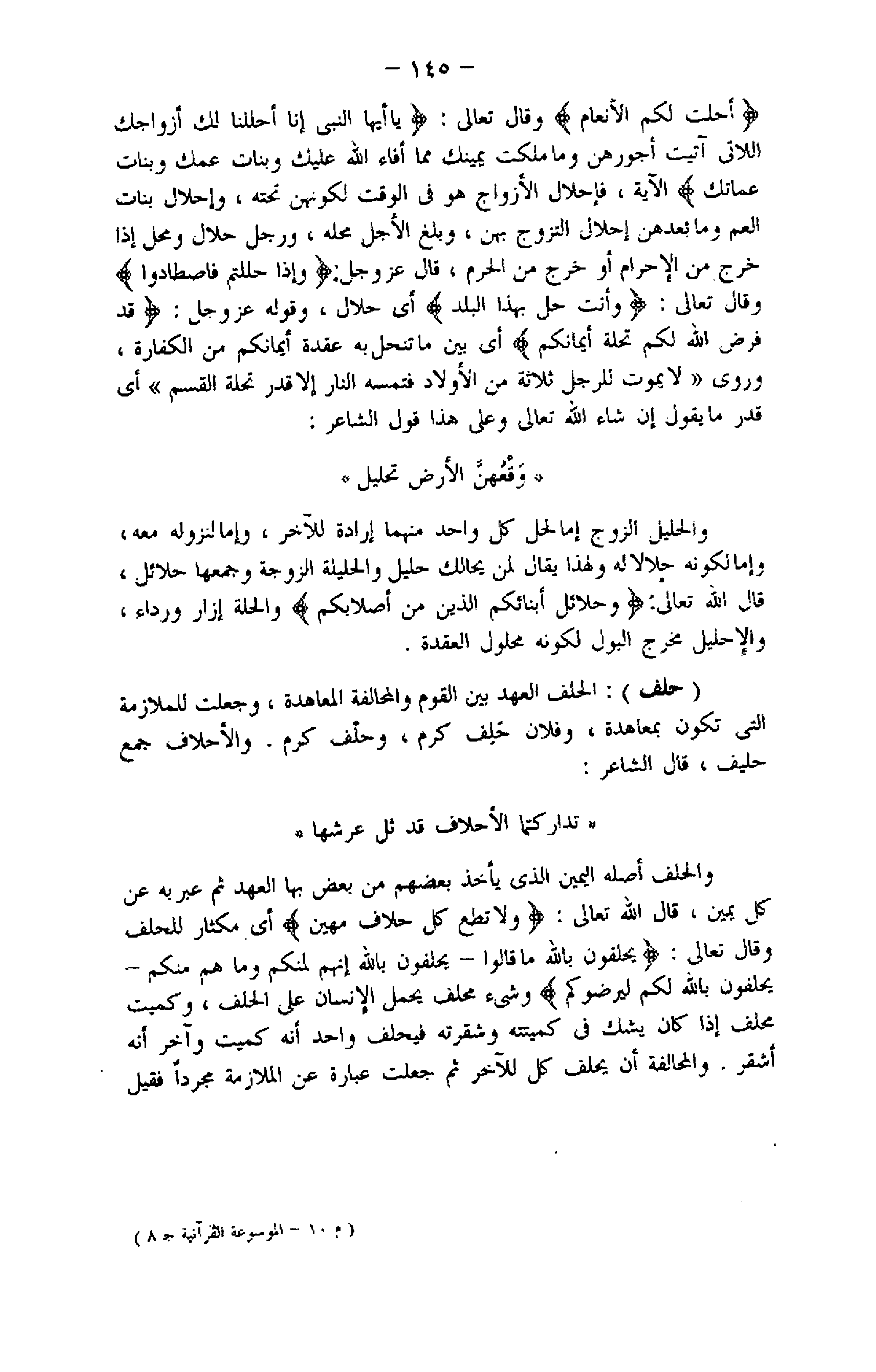 أُحِلَّتْ لَكُمُ الْأَنْعامُ وقال تعالى: يا أَيُّهَا النَّبِيُّ إِنَّا أَحْلَلْنا لَكَ أَزْواجَكَ اللَّاتِي آتَيْتَ أُجُورَهُنَّ وَما مَلَكَتْ يَمِينُكَ مِمَّا أَفاءَ اللَّهُ عَلَيْكَ وَبَناتِ عَمِّكَ وَبَناتِ عَمَّاتِكَ الآية، فإحلال الأزواج هو فى الوقت لكونهن تحته، وإحلال بنات العم وما بعدهن إحلال التزوج بهن، وبلغ الأجل محله، ورجل حلال ومحل إذا خرج من الإحرام أو خرج من الحرم، قال عز وجل: وَإِذا حَلَلْتُمْ فَاصْطادُوا وقال تعالى: وَأَنْتَ حِلٌّ بِهذَا الْبَلَدِ أي حلال، وقوله عز وجل: قَدْ فَرَضَ اللَّهُ لَكُمْ تَحِلَّةَ أَيْمانِكُمْ أي بين ما تنحل به عقدة أيمانكم من الكفارة،