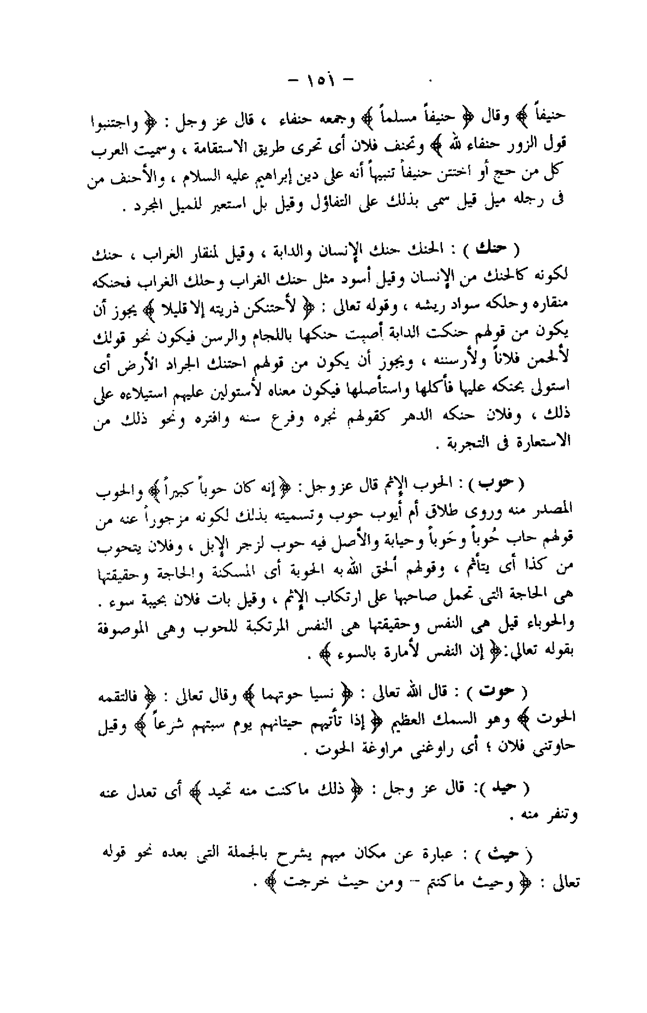 وقال: حَنِيفاً مُسْلِماً وجمعه حنفاء، قال عزّ وجلّ: وَاجْتَنِبُوا قَوْلَ الزُّورِ حُنَفاءَ لِلَّهِ وتحنف فلان أي تحرى طريق الاستقامة، وسميت العرب كل من حج أو اختتن حنيفا تنبيها أنه على دين إبراهيم عليه السلام، والأحنف من فى رجله ميل قيل سمى بذلك على التفاؤل وقيل بل استعير للميل المجرد.