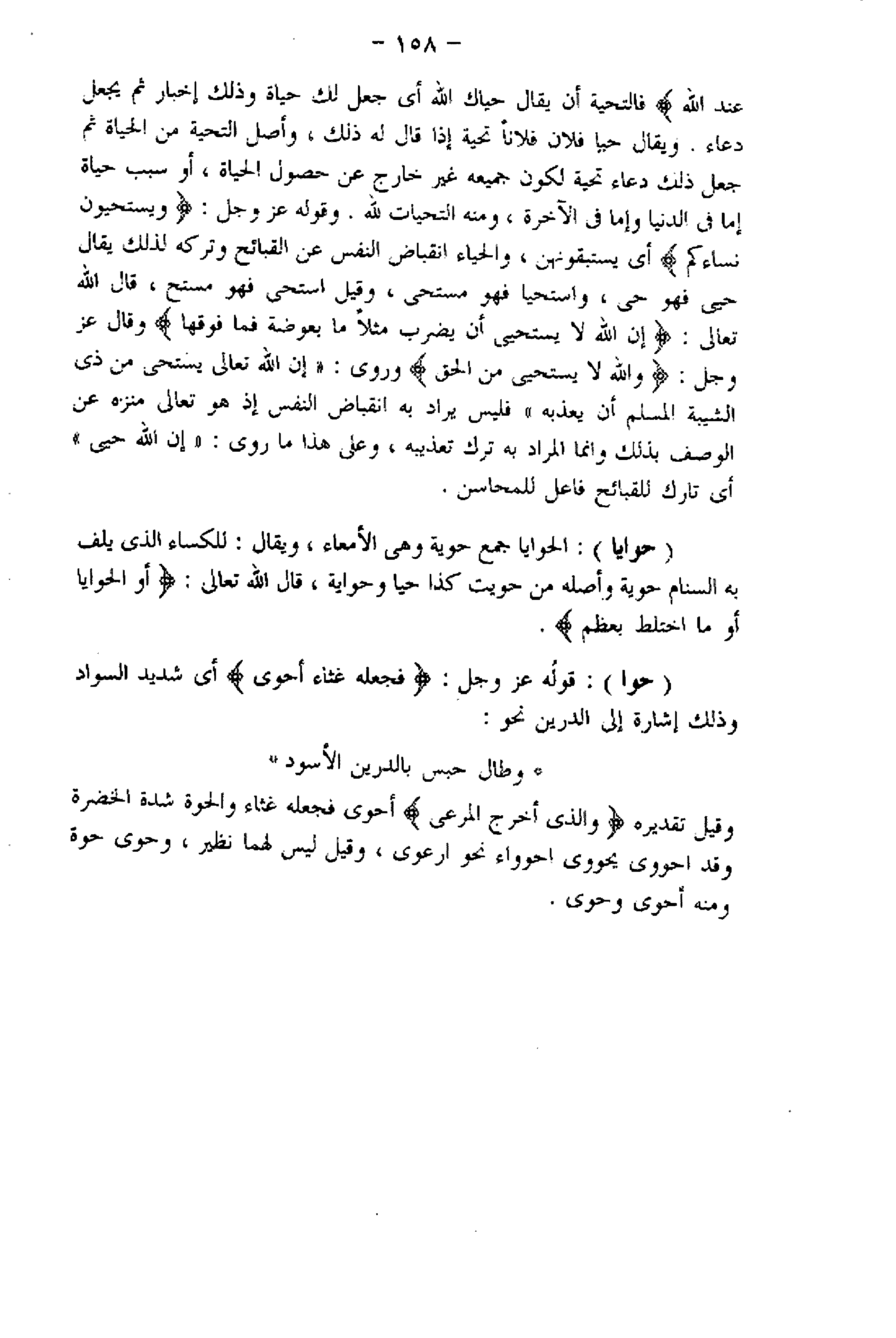 فالتحية أن يقال حياك اللَّه أي جعل لك حياة وذلك إخبارهم ثم يجعل دعاء. ويقال حبا فلان فلانا تحية إذا قال له ذلك، وأصل التحية من الحياة ثم جعل ذلك دعاء تحية لكون جميعه غير خارج عن حصول الحياة، أو سبب حياة إما فى الدنيا وإما فى الآخرة، ومنه التحيات للَّه. وقوله عز وجل: وَيَسْتَحْيُونَ نِساءَكُمْ أي يستبقونهن، والحياء انقباض النفس عن القبائح وتركه لذلك يقال حيى فهو حى، واستحيا فهو مستحى، وقيل استحى فهو مستح، قال اللَّه تعالى: إِنَّ اللَّهَ لا يَسْتَحْيِي أَنْ يَضْرِبَ مَثَلًا ما بَعُوضَةً فَما فَوْقَها وقال عز وجل: وَاللَّهُ لا يَسْتَحْيِي مِنَ الْحَقِّ