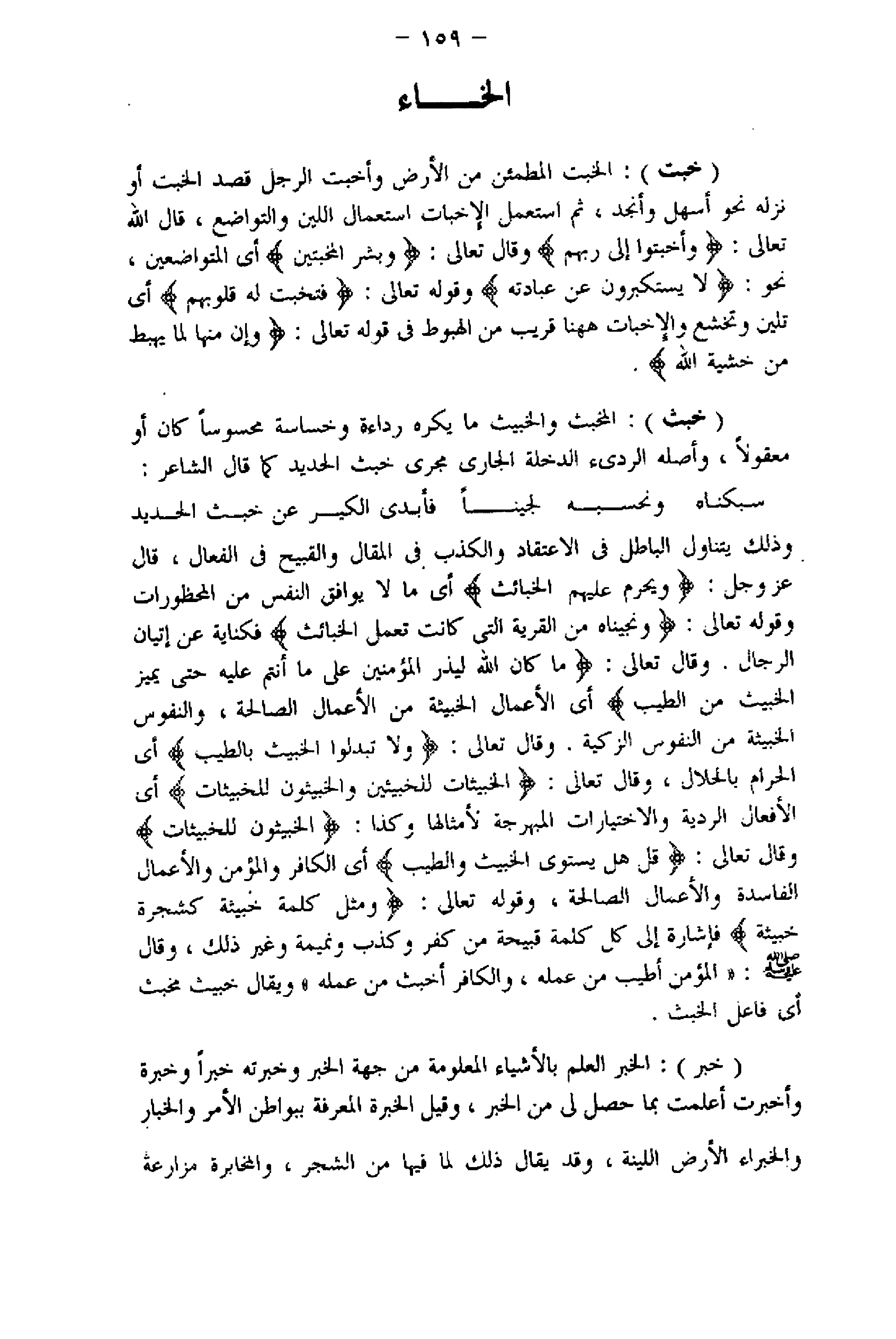 سبكناه ونحسبه لجينا فأبدى الكير عن خبث الحديد وذلك يتناول الباطل فى الاعتقاد والكذب فى المقال والقبيح فى الفعال، قال عزّ وجلّ: وَيُحَرِّمُ عَلَيْهِمُ الْخَبائِثَ أي ما لا يوافق النفس من المحظورات وقوله تعالى: وَنَجَّيْناهُ مِنَ الْقَرْيَةِ الَّتِي كانَتْ تَعْمَلُ الْخَبائِثَ فكناية عن إتيان الرجال. وقال تعالى: ما كانَ اللَّهُ لِيَذَرَ الْمُؤْمِنِينَ عَلى ما أَنْتُمْ عَلَيْهِ حَتَّى يَمِيزَ الْخَبِيثَ مِنَ الطَّيِّبِ أي الأعمال الخبيثة من الأعمال الصالحة، والنفوس الخبيثة من النفوس الزكية. وقال تعالى: وَلا تَتَبَدَّلُوا الْخَبِيثَ بِالطَّيِّبِ أي الحرام بالحلال، وقال تعالى: الْخَبِيثاتُ لِلْخَبِيثِينَ وَالْخَبِيثُونَ لِلْخَبِيثاتِ أي الأفعال الردية والاختيارات المبهرجة لأمثالها وكذا: الْخَبِيثُونَ لِلْخَبِيثاتِ وقال تعالى: قُلْ لا يَسْتَوِي الْخَبِيثُ وَالطَّيِّبُ أي الكافر والمؤمن والأعمال الفاسدة والأعمال الصالحة، وقوله تعالى: وَمَثَلُ كَلِمَةٍ خَبِيثَةٍ كَشَجَرَةٍ خَبِيثَةٍ فإشارة إلى كل كلمة قبيحة من كفر وكذب ونميمة وغير ذلك،