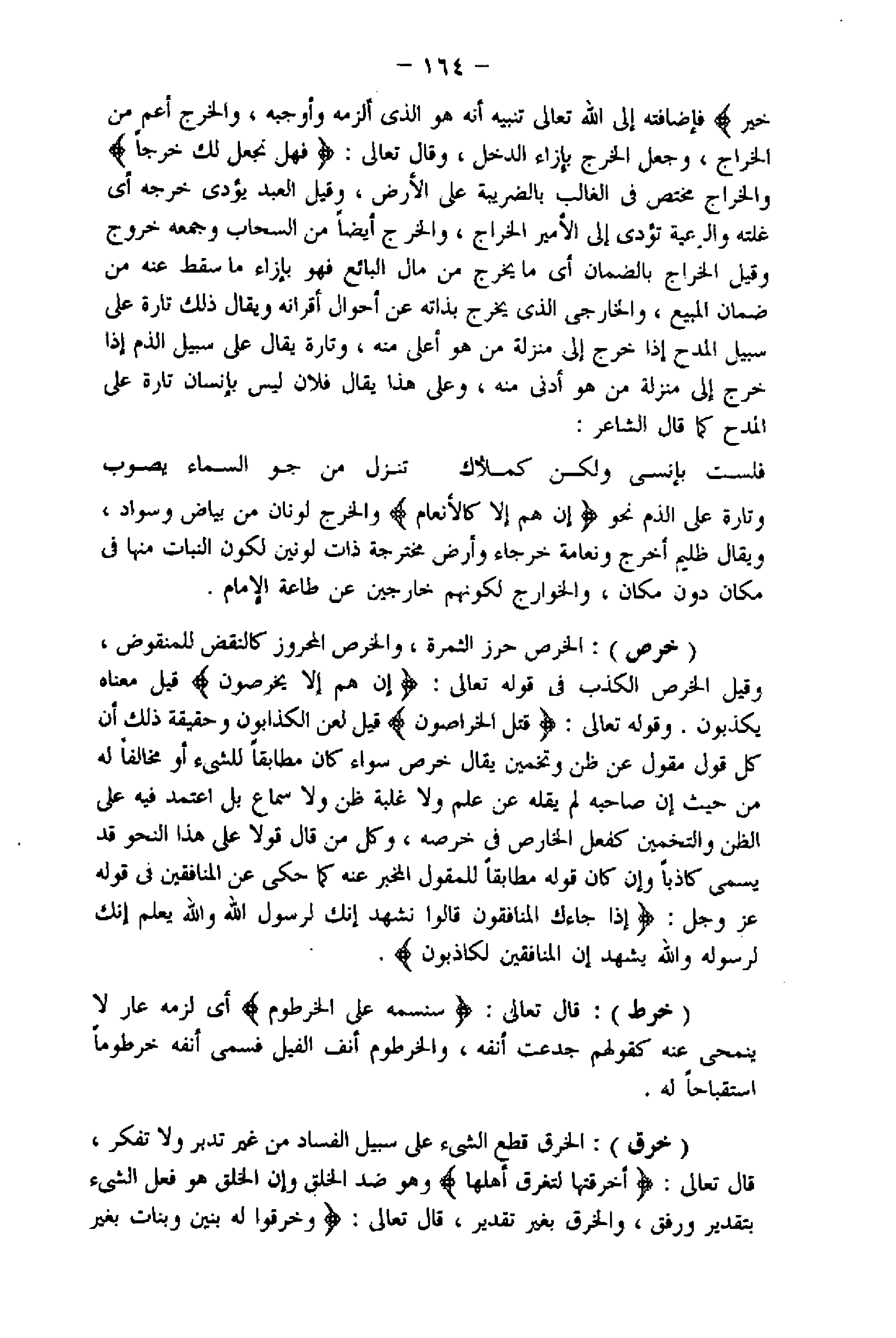 فإضافته إلى اللَّه تعالى تنبيه أنه هو الذي ألزمه وأوجبه، والخرج أعم من الخراج، وجعل الخرج بإزاء الدخل، وقال تعالى: فَهَلْ نَجْعَلُ لَكَ خَرْجاً والخراج مختص فى الغالب بالضريبة على الأرض، وقيل العبد يؤدى خرجه أي غلته والرعية تؤدى إلى الأمير الخراج، والخرج أيضا من السحاب وجمعه خروج وقيل الخراج بالضمان أي ما يخرج من مال البائع فهو بإزاء ما سقط عنه من ضمان المبيع، والخارجي الذي يخرج بذاته عن أحوال أقرانه ويقال ذلك تارة على سبيل المدح إذا خرج إلى منزلة من هو أعلى منه، وتارة يقال على سبيل الذم إذا خرج إلى منزلة من هو أدنى منه، وعلى هذا يقال فلان ليس بإنسان تارة على المدح كما قال الشاعر: