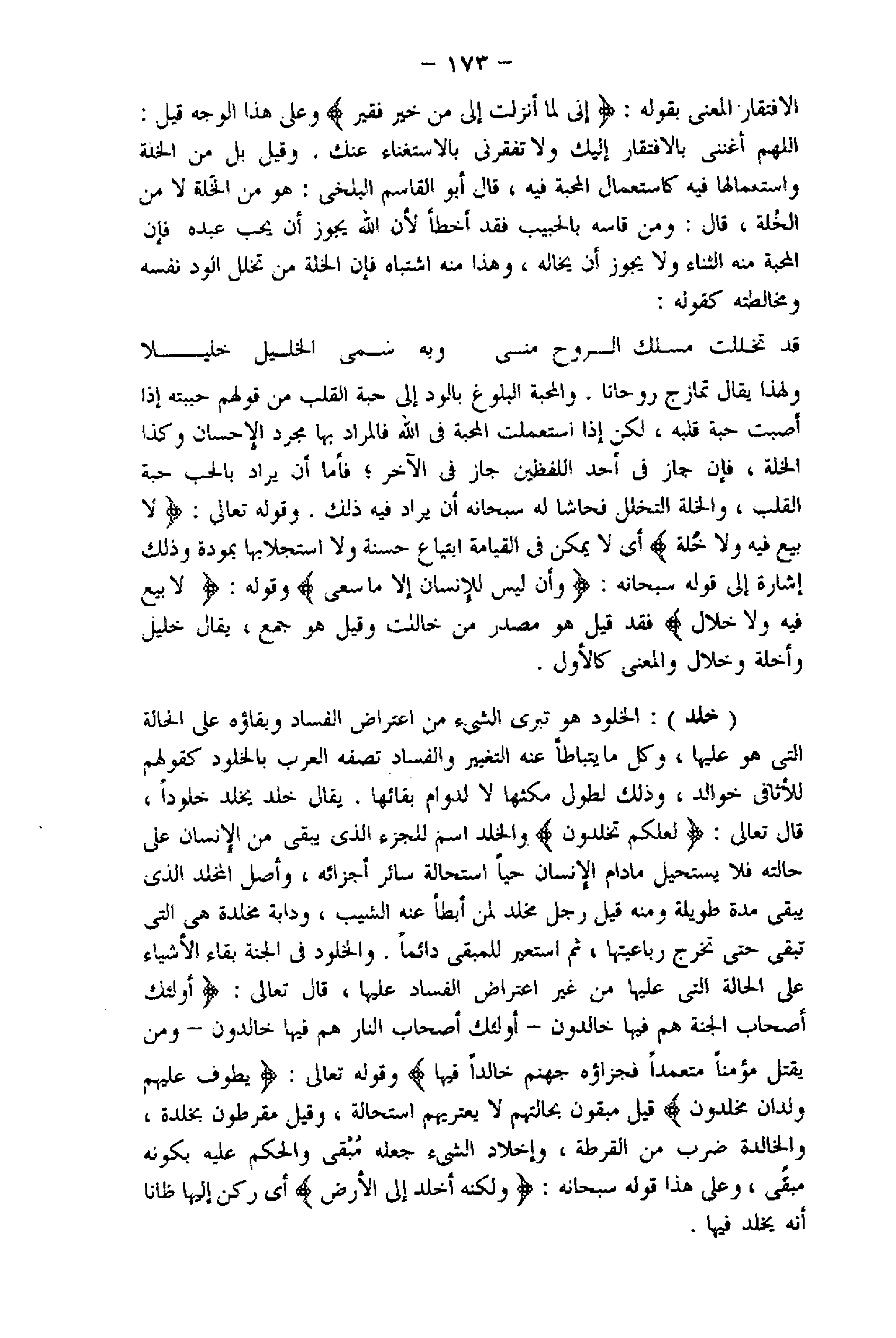 اللهم أغننى بالافتقار إليك ولا تفقرنى بالاستغناء عنك. وقيل بل من الخلة واستعمالها فيه كاستعمال المحبة فيه، قال أبو القاسم البلخي: هو من الخلة لا من الخلة، قال: ومن قاسه بالحبيب فقد أخطأ لأن اللَّه يجوز أن يجد عبده فإن المحبة منه الثناء ولا يجوز أن يخاله، وهذا منه اشتباه فإن الخلة من تخلل الود نفسه ومخالطته كقوله:
