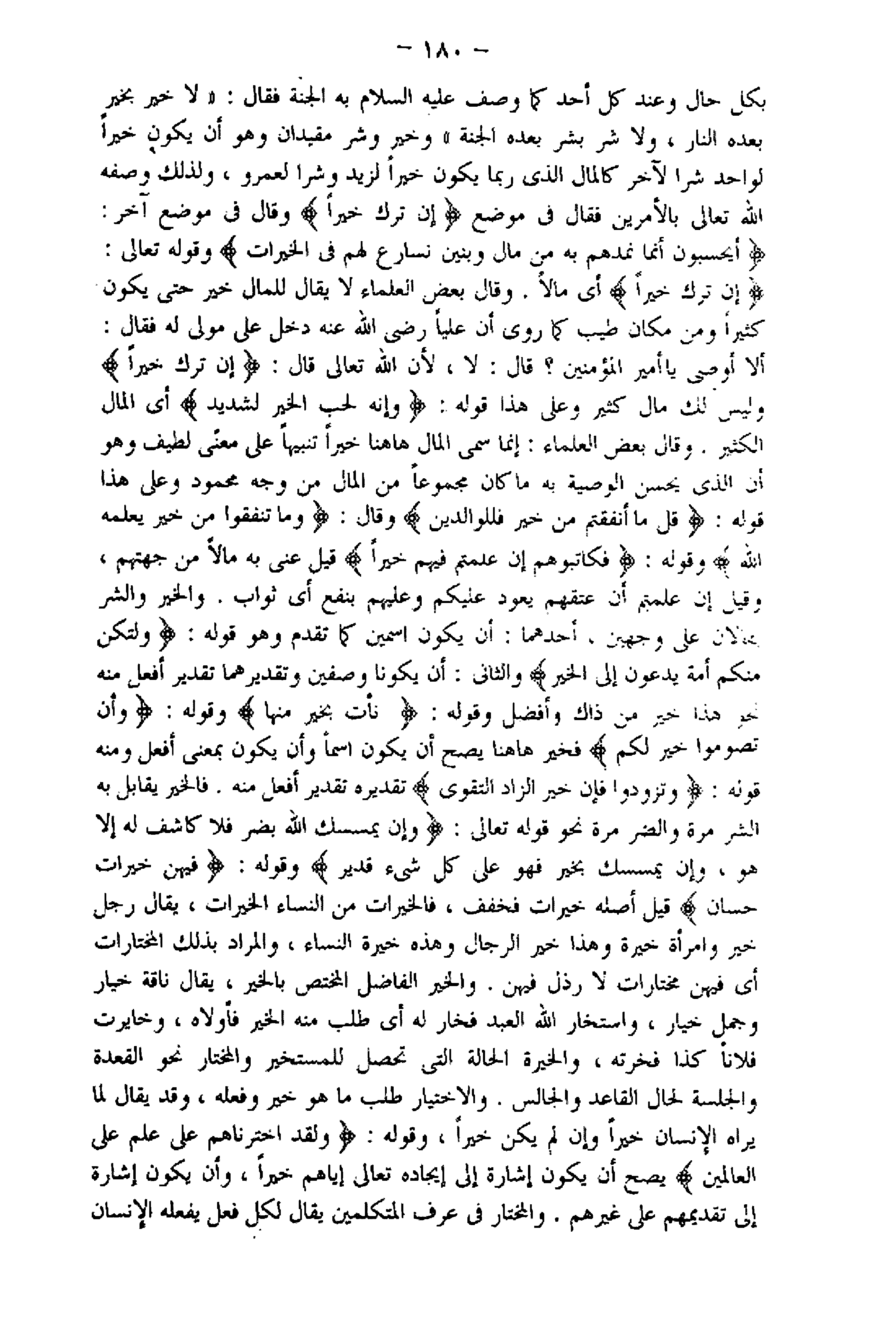 إِنْ تَرَكَ خَيْراً أي مالا. وقال بعض العلماء لا يقال للمال خير حتى يكون كثيرا ومن مكان طيب كما