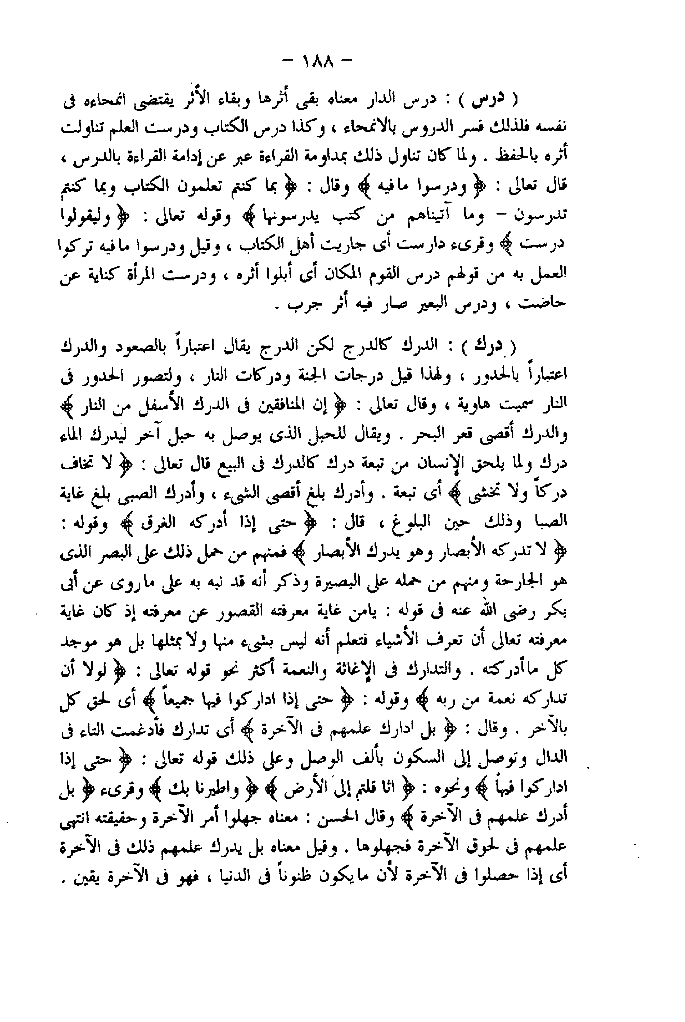 (درس) : درس الدار معناه بقي أثرها وبقاء الأثر يقتضى انمحاءه فى نفسه فلذلك فسر الدروس بالانمحاء، وكذا درس الكتاب ودرست العلم تناولت أثره بالحفظ. ولما كان تناول ذلك بمداومة القراءة عبر عن إدامة القراءة بالدرس، قال تعالى: وَدَرَسُوا ما فِيهِ وقال: بِما كُنْتُمْ تُعَلِّمُونَ الْكِتابَ وَبِما كُنْتُمْ تَدْرُسُونَ- وَما آتَيْناهُمْ مِنْ كُتُبٍ يَدْرُسُونَها وقوله تعالى: وَلِيَقُولُوا دَرَسْتَ وقرىء دارست أي جاريت أهل الكتاب، وقيل ودرسوا ما فيه تركوا العمل به من قولهم درس القوم المكان أي أبلوا أثره، ودرست المرأة كناية عن حاضت، ودرس البعير صار فيه أثر جرب.