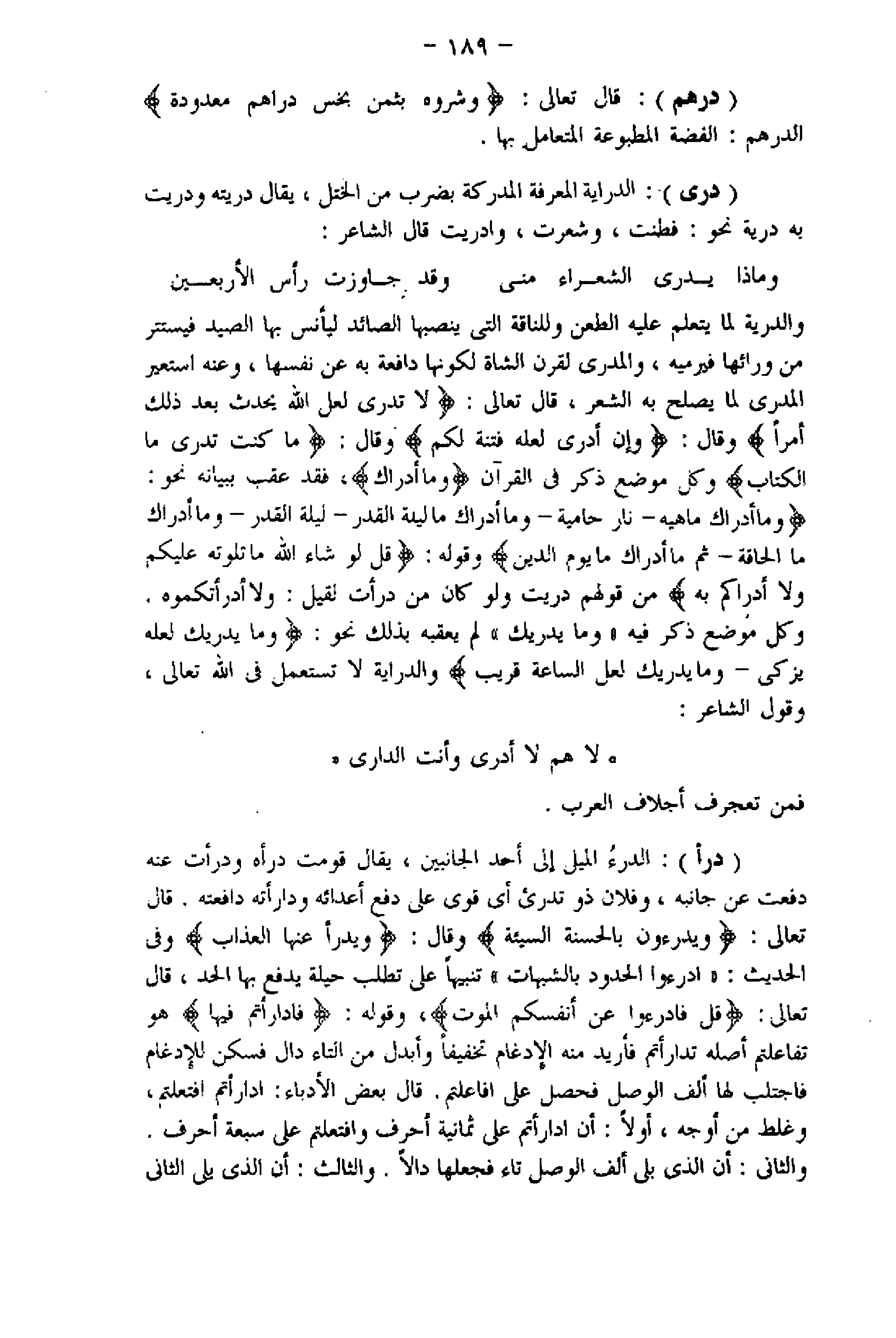(درى) : الدراية المعرفة المدركة بضرب من الختل، يقال دريته ودريت به درية نحو: فطنت، وشعرت، وأدريت قال الشاعر:
