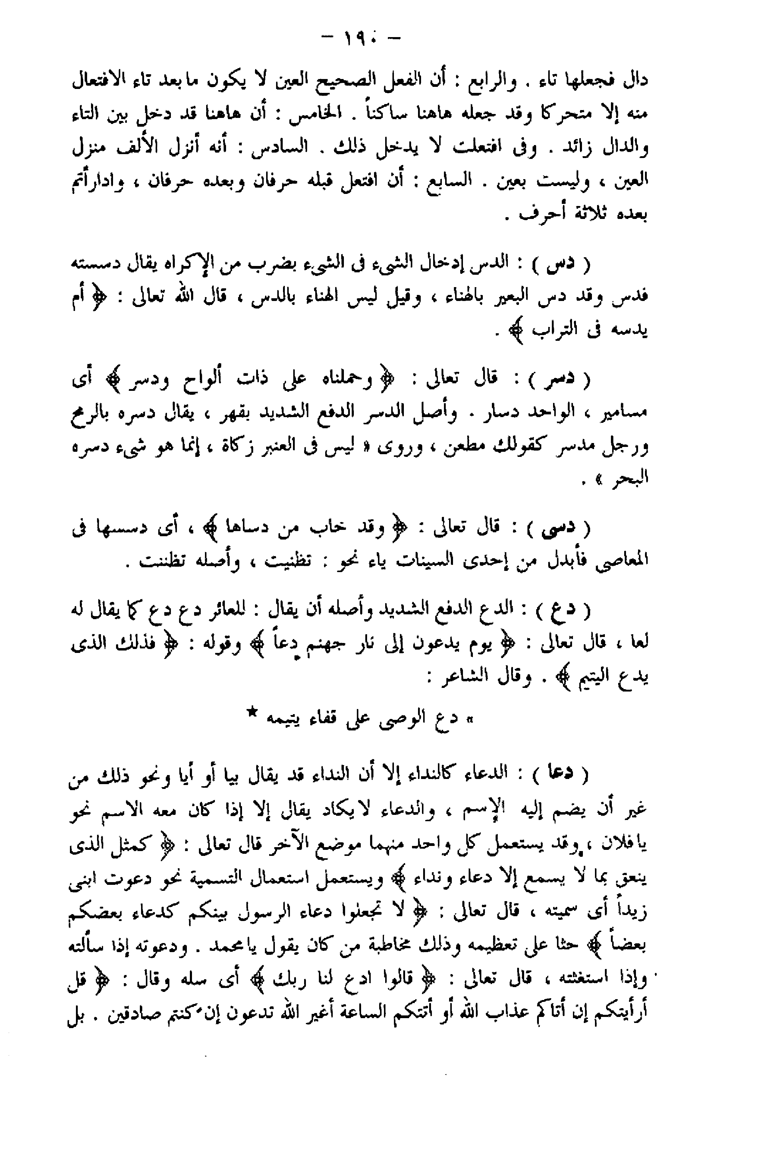 (دعا) : الدعاء كالنداء إلا أن النداء قد يقال بيا أو أيا ونحو ذلك من غير أن يضم إليه الاسم، والدعاء لا يكاد يقال إلا إذا كان معه الاسم نحو يا فلان، وقد يستعمل كل واحد منهما موضع الآخر قال تعالى: كَمَثَلِ الَّذِي يَنْعِقُ بِما لا يَسْمَعُ إِلَّا دُعاءً وَنِداءً ويستعمل استعمال التسمية نحو دعوت ابني زيدا أي سميته، قال تعالى: لا تَجْعَلُوا دُعاءَ الرَّسُولِ بَيْنَكُمْ كَدُعاءِ بَعْضِكُمْ بَعْضاً حثا على تعظيمه وذلك مخاطبة من كان يقول يا محمد. ودعوته إذا سألته وإذا استغثته، قال تعالى: قالُوا ادْعُ لَنا رَبَّكَ أي سله وقال: قُلْ أَرَأَيْتَكُمْ إِنْ أَتاكُمْ عَذابُ اللَّهِ أَوْ أَتَتْكُمُ السَّاعَةُ أَغَيْرَ اللَّهِ تَدْعُونَ إِنْ كُنْتُمْ صادِقِينَ. بَلْ